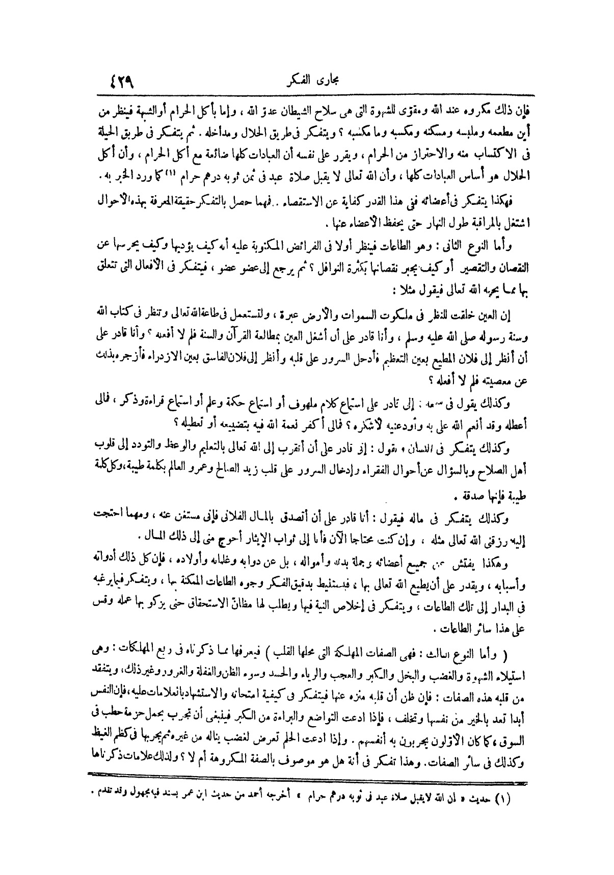 وَهَكَذَا يُفَتِّشُ عَنْ جَمِيعِ أَعْضَائِهِ وَجُمْلَةِ بدنه وأمواله بل عن دوابه وغلمانه وَأَوْلَادِهِ فَإِنَّ كُلَّ ذَلِكَ أَدَوَاتُهُ وَأَسْبَابُهُ وَيَقْدِرُ عَلَى أَنْ يُطِيعَ اللَّهَ تَعَالَى بِهَا فَيَسْتَنْبِطَ بِدَقِيقِ الْفِكْرِ وُجُوهُ الطَّاعَاتِ الْمُمْكِنَةِ بِهَا وَيَتَفَكَّرُ فِيمَا يُرَغِّبُهُ فِي الْبِدَارِ إِلَى تِلْكَ الطَّاعَاتِ ويتفكر في إخلاص النية فيها ويطلب لها مظان الاستحقاق حتى يزكو بها عمله وقس على هذا سائر الطاعات