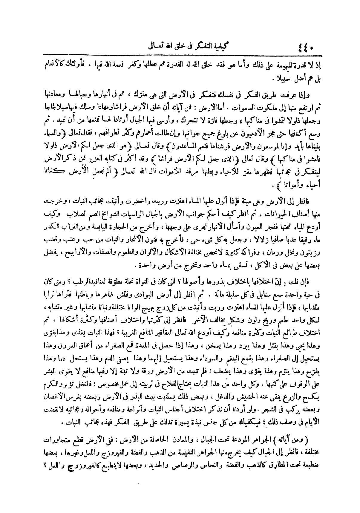 فَإِنْ قُلْتَ إِنَّ اخْتِلَافَهَا بِاخْتِلَافِ بُذُورِهَا وَأُصُولِهَا فَمَتَى كان فى النواة نخلة مطوقة لعناقيد الرطب ومتى كان فى حبة واحدة سمع سنابل فى كل سنبلة مائة ثُمَّ انْظُرْ إِلَى أَرْضِ الْبَوَادِي وَفَتِّشْ ظَاهِرَهَا وَبَاطِنَهَا فَتَرَاهَا تُرَابًا مُتَشَابِهًا فَإِذَا أُنْزِلَ عَلَيْهَا الْمَاءُ اهْتَزَّتْ وَرَبَتْ وَأَنْبَتَتْ مِنْ كُلِّ زَوْجِ بَهِيجٍ أَلْوَانًا مُخْتَلِفَةً وَنَبَاتًا مُتَشَابِهًا وَغَيْرَ مُتَشَابِهٍ لِكُلِّ وَاحِدٍ طَعْمٌ وَرِيحٌ وَلَوْنٌ وَشَكْلٌ يُخَالِفُ الْآخَرَ فَانْظُرْ إِلَى كَثْرَتِهَا وَاخْتِلَافِ أَصْنَافِهَا وَكَثْرَةِ أَشْكَالِهَا ثُمَّ اخْتِلَافِ طَبَائِعِ النَّبَاتِ وَكَثْرَةِ مَنَافِعِهِ وَكَيْفَ أَوْدَعَ اللَّهُ تَعَالَى الْعَقَاقِيرَ الْمَنَافِعَ الْغَرِيبَةَ فَهَذَا النَّبَاتُ يُغَذِّي وَهَذَا يُقَوِّي وَهَذَا يُحْيِي وَهَذَا يَقْتُلُ وَهَذَا يُبَرِّدُ وَهَذَا يُسَخِّنُ وَهَذَا إذا حصل في المعدة قمع الصفراء من أعماق العروق وهذا يستحيل إلى الصفراء وهذا يقمع البلغم والسوداء وهذا يستحيل إليهما وهذا يصفى الدم وهذا يستحل دما وهذا يفرح وهذا ينوم وهذا يقوى وهذا يضعف فلم تنبت من الأرض ورقة ولا تبنة إِلَّا وَفِيهَا مَنَافِعُ لَا يَقْوَى الْبَشَرُ عَلَى الْوُقُوفِ عَلَى كُنْهِهَا وَكُلُّ وَاحِدٍ مِنْ هَذَا النَّبَاتِ يَحْتَاجُ الْفَلَّاحُ فِي تَرْبِيَتِهِ إِلَى عَمَلٍ مخصوص فالنخل تؤثر الكرم يكسح والزرع ينقى عنه الحشيش والدغل وبعض ذلك يستنبت ببث البذر فى الأرض وبعضه بغرس الأغصان وبعضه يركب فى الشجر وَلَوْ أَرَدْنَا أَنْ نَذْكُرَ اخْتِلَافَ أَجْنَاسِ النَّبَاتِ وأنواعة ومنافعه وأحواله وعجائبه لا نقضت الْأَيَّامُ فِي وَصْفِ ذَلِكَ فَيَكْفِيكَ مِنْ كُلٍّ جنس نبذة يسيرة تدلك على طريق الفكر فهذه عجائب النبات