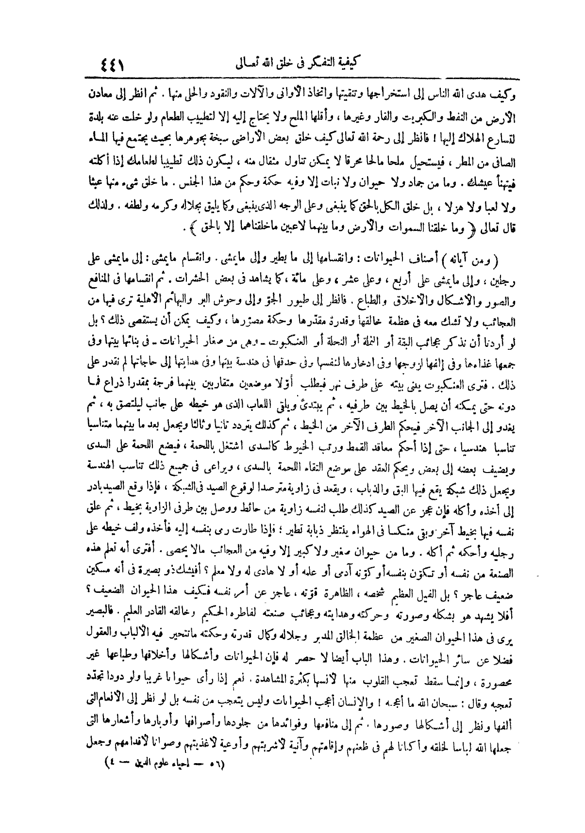 وكيف هدى الله الناس إلى استخراجها وتنقيتها واتخاذ الأوانى والآلات والنقود والحلى منها ثم انظر إلى معادن الأرض من النفط والكبريت والقار وغيرها وأقلها الملح ولا يحتاج إليه إلا لتطييب الطعام ولو خلت عنه بلدة لتسارع الهلاك إليها فانظر إلى رحمة الله تعالى كيف خلق بعض الأراضى سبخة بجوهرها بحيث يجتمع فيها الماء الصافى من المطر فيستحيل ملحا مالحا محرقا لا يمكن تناول مثقال منه ليكون ذلك تطييبا لطعامك إذا أكلته فيتهنأ عيشك وما من جماد ولا حيوان ولا نبات إلا وفيه حكمة وحكم من هذا الجنس ما خلق شىء منها عبثا ولا لعبا ولا هزلا بل خلق الكل بالحق كما ينبغى وعلى الوجه الذى ينبغى وكما يليق بجلاله وكرمه ولطفه ولذلك قال تعالى وما خلقنا السموات والأرض وما بينهما لاعبين ما خلقنهما إلا بالحق