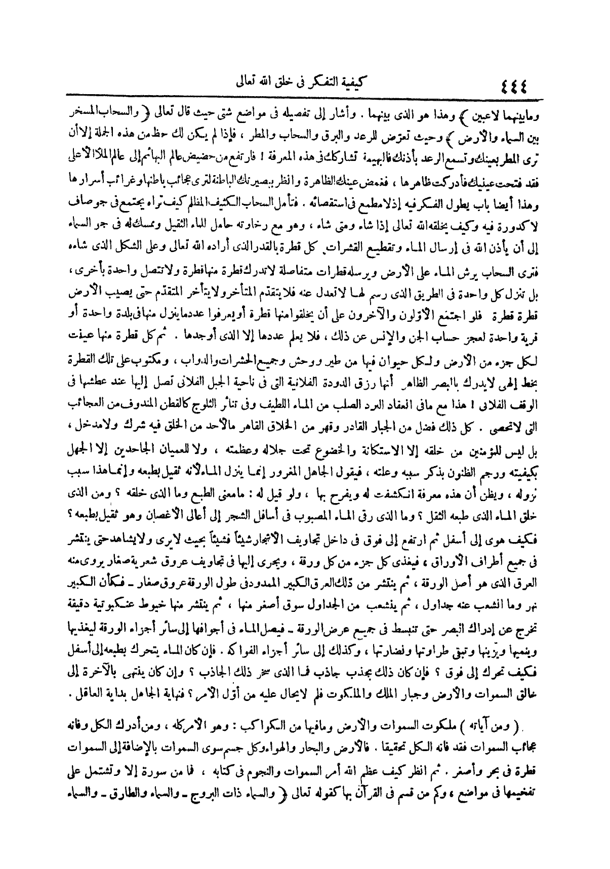 فَتَأَمَّلِ السَّحَابَ الْكَثِيفَ الْمُظْلِمَ كَيْفَ تَرَاهُ يَجْتَمِعُ فِي جَوٍّ صَافٍ لَا كُدُورَةَ فِيهِ وَكَيْفَ يَخْلُقُهُ اللَّهُ تَعَالَى إِذَا شَاءَ وَمَتَى شَاءَ وَهُوَ مَعَ رَخَاوَتِهِ حَامِلٌ لِلْمَاءِ الثَّقِيلِ وَمُمْسِكٌ لَهُ فِي جَوِّ السَّمَاءِ إِلَى أَنْ يَأْذَنَ الله فى إرسال الماء وتقطيع القشرات كل قطرة بالقدر الذي أراده الله تعالى وعلى الشكل الذى شاءه فترى السحاب يرش الماء على الأرض ويرسله قطرات متفاصلة لا تدرك قطرة منها قطرة ولا تتصل واحدة بأخرى بل تنزل كل واحدة فى الطريق الذى رسم لها لا تعدل عنه فلا يتقدم المتأخر ولا يتأخر المتقدم حَتَّى يُصِيبَ الْأَرْضَ قَطْرَةً قَطْرَةً فَلَوِ اجْتَمَعَ الْأَوَّلُونَ وَالْآخِرُونَ عَلَى أَنْ يَخْلُقُوا مِنْهَا قَطْرَةً أو يعرفوا عدد ما ينزل منها فى بلدة واحدة أو قرية واحدة لعجز حساب الجن والإنس عن ذلك فلا يعلم عددها الا الذى أوجدها