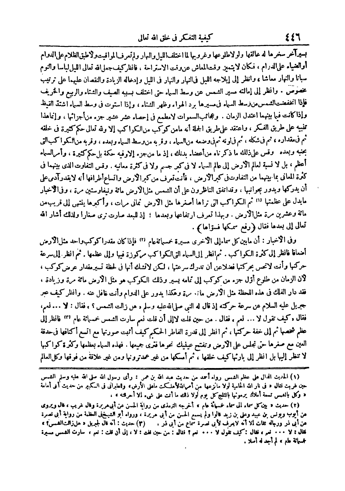 ثم انظر إلى سرعة حركتها وأنت لا تحس بحركتها فضلا عن أن تدرك سرعتها لكن لا تشك أنها فى لحظة تسير مقدار عرض كوكب لأن الزمان من طلوع أول جزء من كوكب إلى تمامه يسير وذلك الكوكب هو مثل الأرض مائة مرة وزيادة فقد دار الفلك فى هذه اللحظة مثل الأرض مائة مرة وهكذا يدور على الدوام وأنت غافل عنه