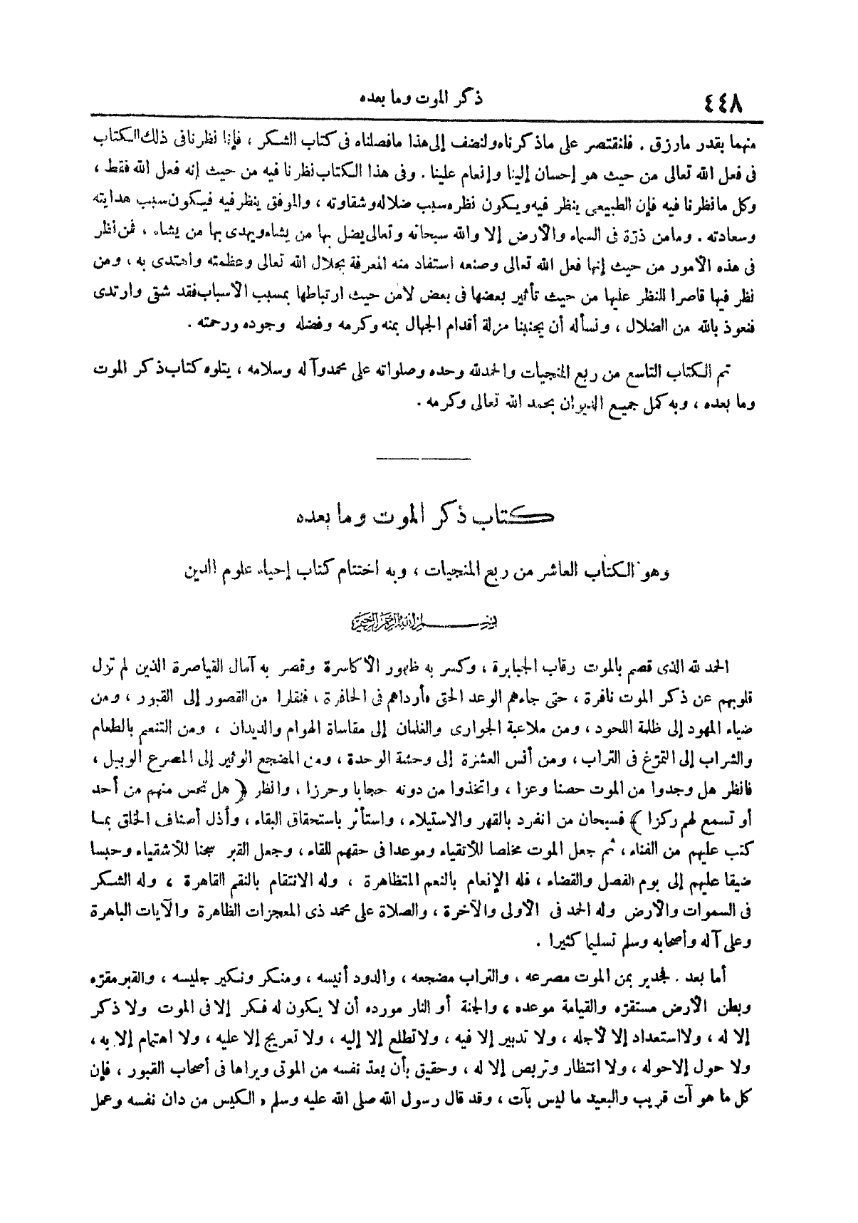 كتاب ذكر الموت وما بعده وهو الكتاب العاشر من ربع المنجيات وبه اختتام
