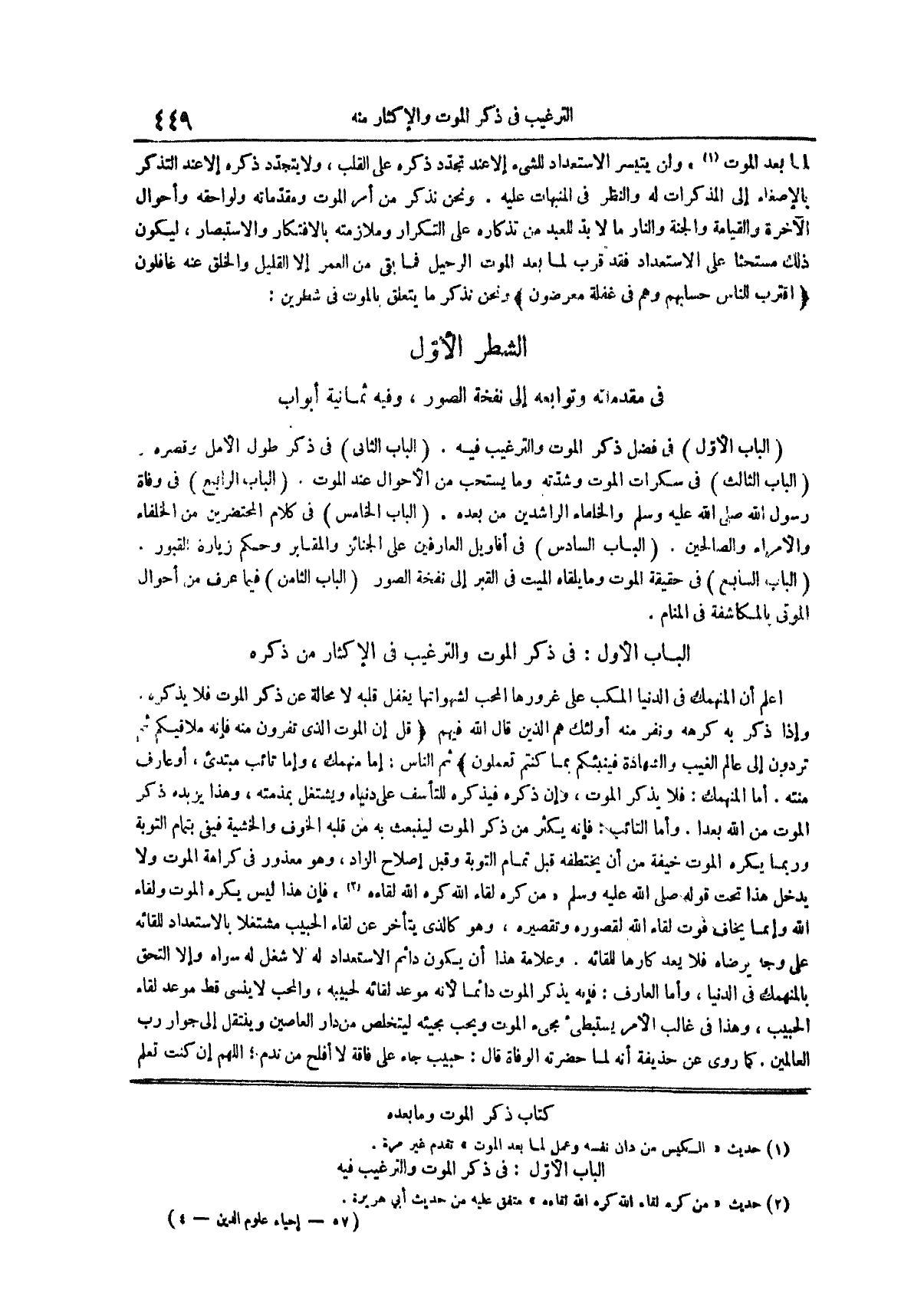 ونحن نذكر من أمر الموت ومقدماته ولواحقه وأحوال الآخرة والقيامة والجنة والنار ما لا بد للعبد من تذكاره على التكرار وملازمته بالافتكار والاستبصار ليكون ذلك مستحثا على الاستعداد فقد قرب لما بعد الموت الرحيل فما بقي من العمر إلا القليل والخلق عنه غافلون اقْتَرَبَ لِلنَّاسِ حِسَابُهُمْ وَهُمْ فِي غَفْلَةٍ مُعْرِضُونَ ونحن نذكر ما يتعلق بالموت في شطرين الشطر الأول في مقدماته وتوابعه إلى نفخة الصور وفيه ثمانية أبواب