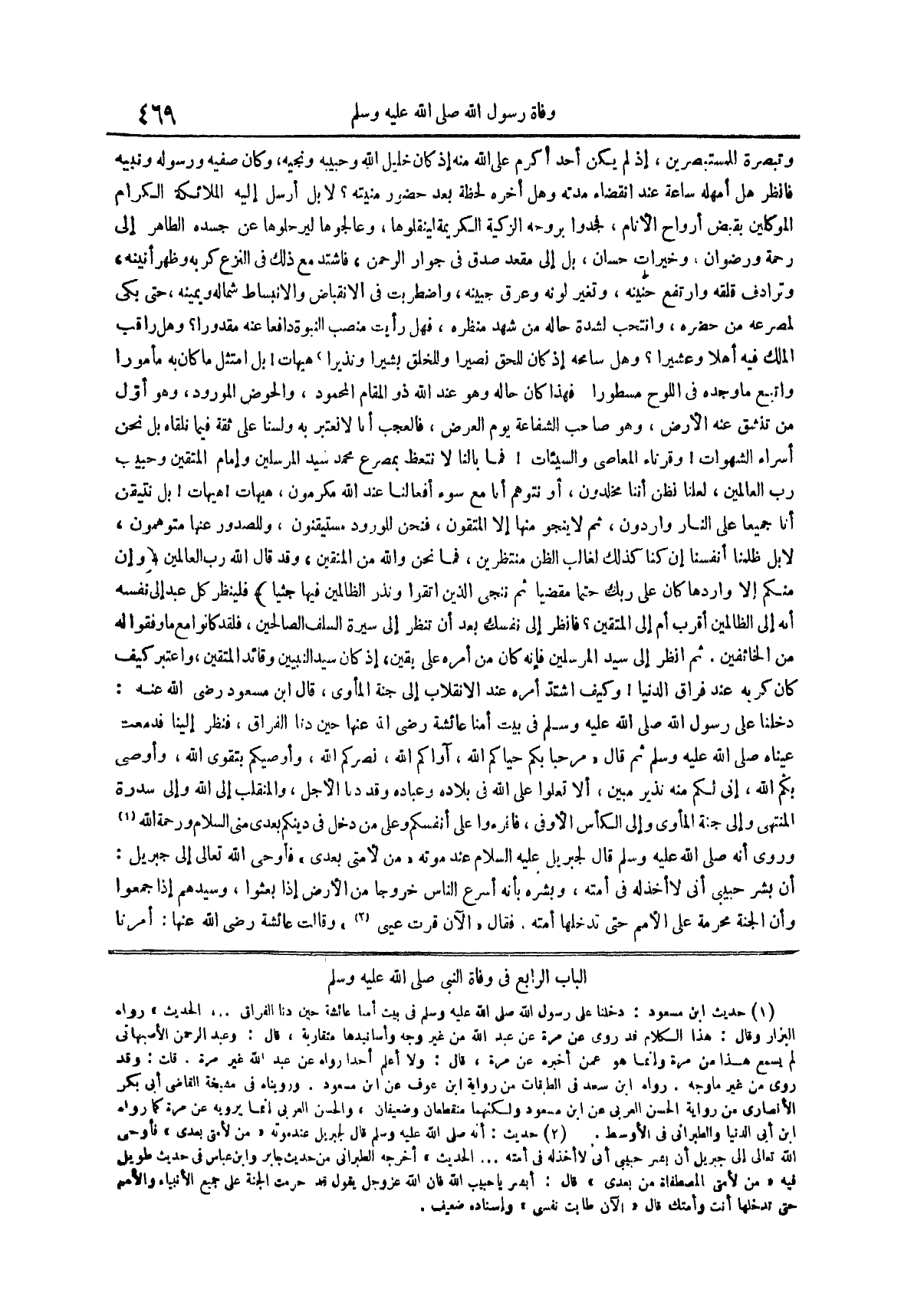 وتبصرة للمستبصرين إذ لم يكن أحد أكرم على الله منه إذ كان خليل الله وحبيبه ونجيه وكان صفيه ورسوله ونبيه فأنظر هل أمهله ساعة عند انقضاء مدته وهل أخره لحظة بعد حضور منيته لا بل أرسل إليه الملائكة الكرام الموكلين بقبض أرواح الأنام فجدوا بروحه الزكية الكريمة لينقلوها وعالجوها ليرحلوها عن جسده الطاهر إلى رحمة ورضوان وخيرات حسان بل إلى مقعد صدق في جوار الرحمن فاشتد مع ذلك في النزع كربه وظهر أنينه وترادف قلقه وارتفع حنينه وتغير لونه وعرق جبينه واضطربت في الإنقباض والإنبساط شماله ويمينه حتى بكى لمصرعه من حضره وانتحب لشدة حاله من شهد منظره فهل رأيت منصب النبوة دافعا عنه مقدورا وهل راقب الملك فيه أهلا وعشيرا وهل سامحه إذ كان للحق نصيرا وللخلق بشيرا ونذيرا هيهات بل امتثل ما كان به مأمورا واتبع ما وجده في اللوح مسطورا فهذا كان حاله وهو عند الله ذو المقام المحمود والحوض المورود وهو أول من تنشق عنه الأرض وهو صاحب الشفاعة يوم العرض فالعجب أنا لا نعتبر به ولسنا على ثقة فيما نلقاه بل نحن أسراء الشهوات وقرناء المعاصي والسيئات فما بالنا لا نتعظ بمصرع محمد سيد المرسلين وإمام المتقين وحبيب رب العالمين لعلنا نظن أننا مخلدون أو نتوهم أنا مع سوء أفعالنا عند الله مكرمون هيهات هيهات بل نتيقن أنا جميعا على النار واردون ثم لا ينجو منها إلا المتقون فنحن للورود مستيقنون وللصدور عنها متوهمون لا بل ظلمنا أنفسنا إن كنا كذلك لغالب الظن منتظرين فما نحن والله من المتقين وقد قال الله رب العالمين {وَإِنْ مِنْكُمْ إِلَّا وَارِدُهَا كَانَ عَلَى رَبِّكَ حَتْمًا مَقْضِيًّا ثُمَّ نُنَجِّي الَّذِينَ اتَّقَوْا وَنَذَرُ الظالمين فيها جثيا} فلينظر كل عبد إلى نفسه أنه إلى الظالمين أقرب أم إلى المتقين فانظر إلى نفسك بعد أن تنظر إلى سيرة السلف الصالحين فلقد كانوا مع ما وفقوا له من الخائفين