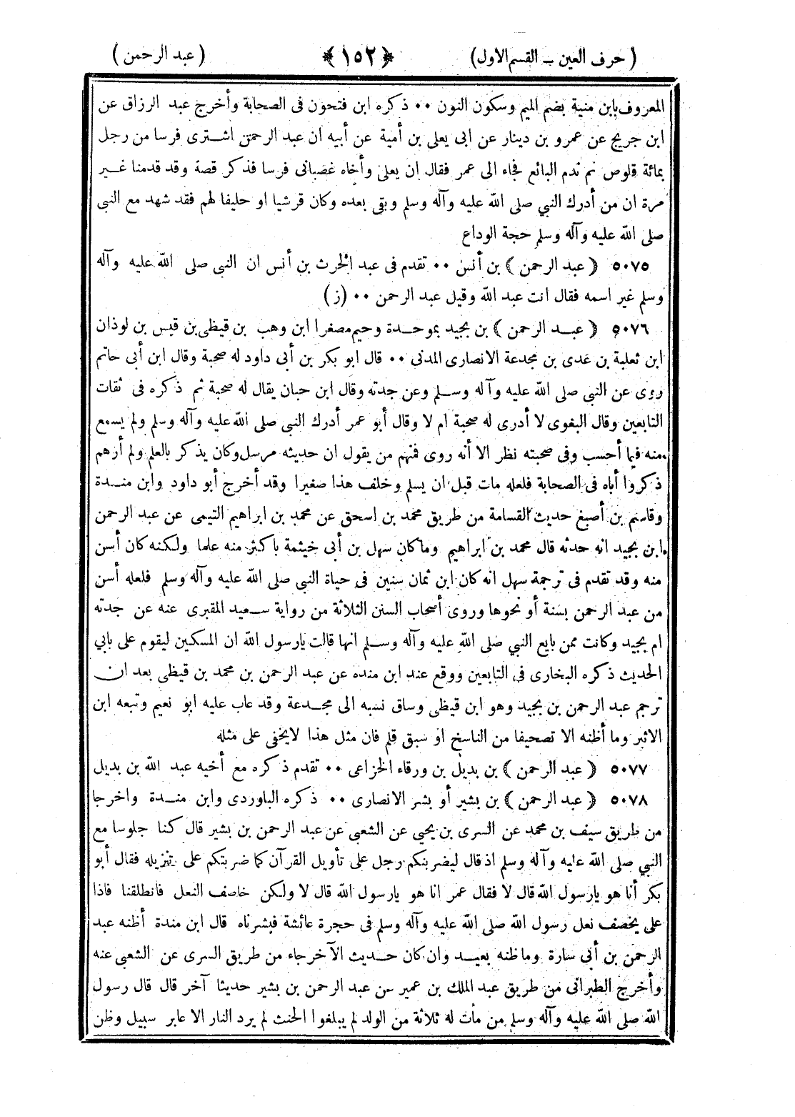 <152> المعروف بابن منية بضم الميم وسكون النون ذكره بن فتحون في الصحابة وأخرج عبد الرزاق عن بن جريج عن عمرو بن دينار عن أبي يعلى بن أمية عن أبيه أن عبد الرحمن اشترى فرسا من رجل بمائة قلوص ثم قدم البائع فجاء إلى عمر فقال إن يعلى وأخاه غصباني فرسا فذكر قصة وقد قدمنا غير مرة إن من أدرك النبي صلى الله عليه وسلم وبقي بعده وكان قرشيا أو حليفا لهم فقد شهد مع النبي صلى الله عليه وسلم حجة الوداع عبد الرحمن بن أنس تقدم في عبد الحارث بن أنس أن النبي صلى الله عليه وسلم غير اسمه فقال أنت عبد الله وقيل عبد الرحمن عبد الرحمن بن بجيد بموحدة وجيم مصغرا بن وهب بن قيظي بن قيس بن لوذان بن ثعلبة بن عدي بن مجدعة الأنصاري المدني قال بن أبي داود له صحبة وقال بن أبي حاتم روى عن النبي صلى الله عليه وسلم وعن جدته وقال بن حبان يقال له صحبة ثم ذكره في ثقات التابعين وقال البغوي لا أدري له صحبة أم لا وقال أبو عمر أدرك النبي صلى الله عليه وسلم ولم يسمع منه فيما أحسب وفي صحبته نظر إلا أنه روى فمنهم من يقول إن حديثه مرسل وكان يذكر بالعلم ولم أرهم ذكروا أباه في الصحابة فلعله مات قبل أن يسلم وخلف هذا صغيرا وقد أخرج أبو داود وابن منده وقاسم بن أصبغ حديث القسامة من طريق محمد بن إسحاق عن محمد بن إبراهيم التيمي عن عبد الرحمن بن بجيد أنه حدثه قال محمد بن إبراهيم وما كان سهل بن أبي خيثمة بأكثر منه علما ولكنه كان أسن منه وقد تقدم في ترجمة سهل أنه كان بن ثمان سنين في حياة النبي صلى الله عليه وسلم فلعله أسن من عبد الرحمن بسنة أو نحوها وروى أصحاب السنن الثلاثة من رواية سعيد المقبري عنه عن جدته أم بجيد وكانت ممن بايع النبي صلى الله عليه وسلم أنها قالت يا رسول الله إن المسكين ليقوم على بابي الحديث ذكره البخاري في التابعين ووقع عند بن منده عن عبد الرحمن بن محمد بن قيظي بعد أن ترجم عبد الرحمن بن بجيد وهو بن قيظي وساق نسبه إلى مجدعة وقد عاب عليه أبو نعيم وتبعه بن الأثير وما أظنه إلا تصحيفا من الناسخ أو سبق قلم فإن مثل هذا لا يخفى على مثله عبد الرحمن بن بديل بن ورقاء الخزاعي تقدم ذكره مع أخيه عبد الله بن بديل عبد الرحمن بن بشير أو بشر الأنصاري ذكره الباوردي وابن منده وأخرجا من طريق سيف بن محمد عن السري بن يحيى عن الشعبي عن عبد الرحمن بن بشير قال كنا جلوسا مع النبي صلى الله عليه وسلم إذ قال ليضربنكم رجل على تأويل القرآن كما ضربتكم على تنزيله فقال أبو بكر أنا هو يا رسول الله قال لا فقال عمر أنا هو يا رسول الله قال لا ولكن خاصف النعل فانطلقنا فإذا علي يخصف نعل رسول الله صلى الله عليه وسلم في حجرة عائشة فبشرناه قال بن منده أظنه عبد الرحمن بن أبي سارة وما ظنه ببعيد وإن كان حديث الآخر جاء من طريق السري عن الشعبي عنه وأخرج الطبراني من طريق عبد الملك بن عمير عن عبد الرحمن بن بشير حديثا آخر قال قال رسول الله صلى الله عليه وسلم من مات له ثلاثة من الولد لم يبلغوا الحنث لم يرد النار إلا عابر سبيل وظن §