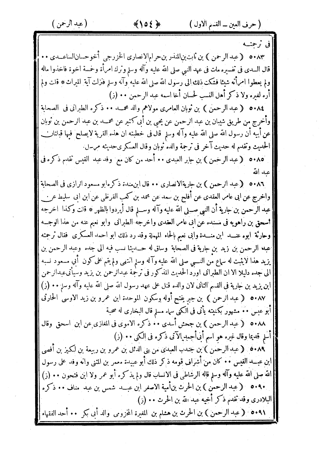 <154> في ترجمته عبد الرحمن بن ثابت بن المنذر بن حرام الأنصاري الخزرجي أخو حسان الساعدي قال السدي في تفسيره مات في عهد النبي صلى الله عليه وسلم وترك امرأة وخمسة إخوة فأخذوا ماله ولم يعطوا امرأته شيئا فشكت ذلك إلى رسول الله صلى الله عليه وسلم فنزلت آية الميراث قلت ولم أره لغيره ولا ذكر أهل النسب لحسان أخا اسمه عبد الرحمن عبد الرحمن بن ثوبان العامري مولاهم والد محمد ذكره الطبراني في الصحابة وأخرج من طريق شيبان بن عبد الرحمن عن يحيى بن أبي كثير عن محمد بن عبد الرحمن بن ثوبان عن أبيه أن رسول الله صلى الله عليه وسلم قال في خطبته إن هذه القرية لا يصلح فيها قبلتان الحديث وتقدم له حديث آخر في ترجمة والده ثوبان وقال العسكري حديثه مرسل عبد الرحمن بن جابر العبدي أحد من كان مع وفد عبد القيس تقدم ذكره في عبد الله عبد الرحمن بن جارية الأنصاري قال بن منده ذكره أبو مسعود الرازي في الصحابة وأخرج عن أبي عامر العقدي عن أفلح بن سعد عن محمد بن كعب القرظي عن أبي سليط عن عبد الرحمن بن جارية أن النبي صلى الله عليه وسلم قال أبردوا بالظهر قلت وكذا أخرجه إسحاق بن راهويه في مسنده عن أبي عامر العقدي وأخرجه الطبراني وأبو نعيم عنه من هذا الوجه وحارثة أبوه عند بن منده وأبي نعيم بالحاء المهملة وقد رد ذلك أبو أحمد العسكري فقال ترجمته عبد الرحمن بن زيد بن جارية في الصحابة وساق له حديثا نسب فيه إلى جده وعبد الرحمن بن يزيد هذا لا يثبت له سماع من النبي صلى الله عليه وسلم انتهى ولم يقم على كون أبي مسعود نسبه إلى جده دليلا إلا أن الطبراني أورد الحديث المذكور في ترجمة عبد الرحمن بن يزيد وسيأتي عبد الرحمن بن يزيد بن جارية في القسم الثاني لأن والده قتل على عهد رسول الله صلى الله عليه وسلم عبد الرحمن بن جبر بفتح أوله وسكون الموحدة بن عمرو بن زيد الأوسي الحارثي أبو عيسى مشهور بكنيته يأتي في الكنى سماه مسلم قال البخاري له صحبة عبد الرحمن بن جحش أسدي ذكره الأموي في المغازي عن بن إسحاق وقال أسلم قديما وقال غيره هو اسم أبي أحمد الآتي ذكره في الكنى عبد الرحمن بن جندب العبدي من بني الدئل بن عمرو بن ربيعة بن لكيز بن أفضى بن عبد القيس كان من أشراف قومه ذكر ذلك أبو عبيدة معمر بن المثنى وأنه وفد على رسول الله صلى الله عليه وسلم قاله الرشاطي في الأنساب قال ولم يذكره أبو عمر ولا بن فتحون عبد الرحمن بن الحارث بن أمية الأصغر بن عبد شمس بن عبد مناف ذكره البلاذري وقد تقدم ذكر أخيه عبد الله بن الحارث عبد الرحمن بن الحارث بن هشام بن المغيرة المخزومي والد أبي بكر أحد الفقهاء §