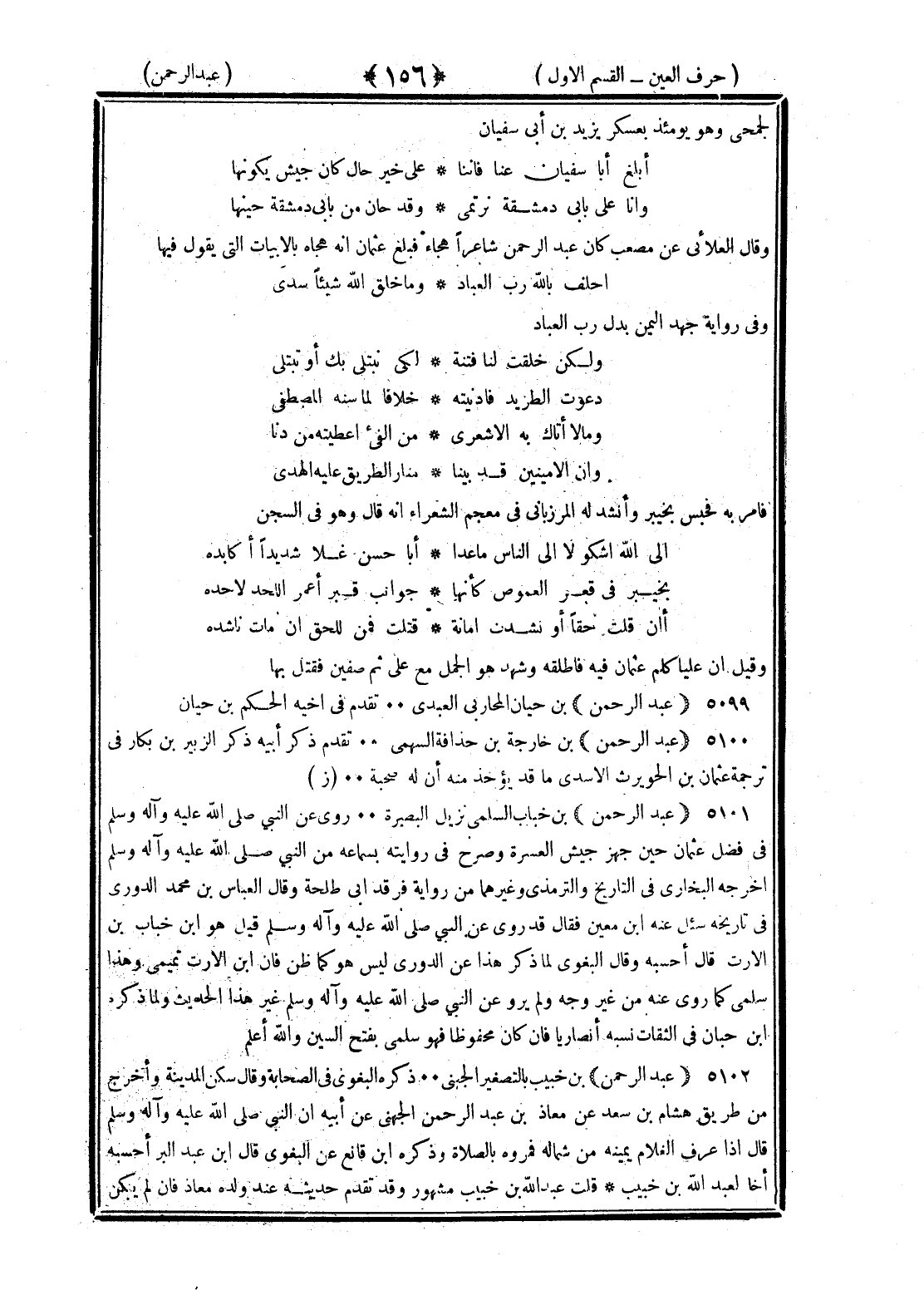 <156> لجمحي وهو يومئذ بعسكر يزيد بن أبي سفيان ابلغ أبا سفيان عنا فإننا على خير حال كان جيش يكونها وإنا على بابي دمشقة نرتمي وقد حان من بابي دمشقة حينها وقال العلائي عن مصعب كان عبد الرحمن شاعرا هجاء فبلغ عثمان أنه هجاه بالأبيات التي يقول فيها أحلف بالله رب العباد ما خلق الله شيئا سدى وفي رواية جهد اليمين بدل رب العباد ولكن خلقت لنا فتنة لكي نبتلي بك أو تبتلى دعوت الطريد فأدنيته خلافا لما سنه المصطفى ومالا أتاك به الأشعري من الفيء أعطيته من دنا وإن الأمينين قد بينا منار الطريق عليه الهدى فأمر به فحبس بخيبر وأنشد المرزباني في معجم الشعراء أنه قال وهو في السجن إلى الله أشكو لا إلى الناس ما عدا أبا حسن غلا شديدا أكابده بخيبر في قعر الغموض كأنها جوانب قبر أعمق اللحد لاحده أإن قلت حقا أو نشدت أمانة قتلت فمن للحق إن مات ناشده وقيل إن عليا كلم عثمان فيه فأطلقه وشهد هو الجمل مع علي ثم صفين فقتل بها عبد الرحمن بن حيان المحاربي العبدي تقدم في أخيه الحكم بن حيان عبد الرحمن بن خارجة بن حذافة السهمي تقدم ذكر أبيه ذكر الزبير بن بكار في ترجمة عثمان بن الحويرث الأسدي ما قد يؤخذ منه أن له صحبة عبد الرحمن بن خباب السلمي نزيل البصرة روى عنه النبي صلى الله عليه وسلم في فضل عثمان حين جهز جيش العمرة وصرح في روايته بسماعه من النبي صلى الله عليه وسلم أخرجه البخاري في التاريخ والترمذي وغيرهما من رواية فرقد أبي طلحة وقال العباس بن محمد الدوري في تاريخه سئل عنه بن معين فقال قد روى عن النبي صلى الله عليه وسلم قيل هو بن خباب بن الأرت قال أحسبه وقال البغوي لما ذكر هذا عن الدوري ليس هو كما ظن فإن بن الأرت تيمي وهذا سلمي كما روى عنه من غير وجه ولم يرو عن النبي صلى الله عليه وسلم غير هذا الحديث ولما ذكره بن حبان في الثقات نسبه أنصاريا فإن كان محفوظا فهو سلمي بفتح السين والله أعلم عبد الرحمن بن خبيب بالتصغير الجهني ذكره البغوي في الصحابة وقال سكن المدينة وأخرج من طريق هشام بن سعد عن معاذ بن عبد الرحمن الجهني عن أبيه أن النبي صلى الله عليه وسلم قال إذا عرف الغلام يمينه من شماله فمروه بالصلاة وذكره بن قانع عن البغوي قال بن عبد البر أحسبه أخا لعبد الله بن خبيب قلت عبد الله بن خبيب مشهور وقد تقدم حديثه عند ولده معاذ إن لم يكن §