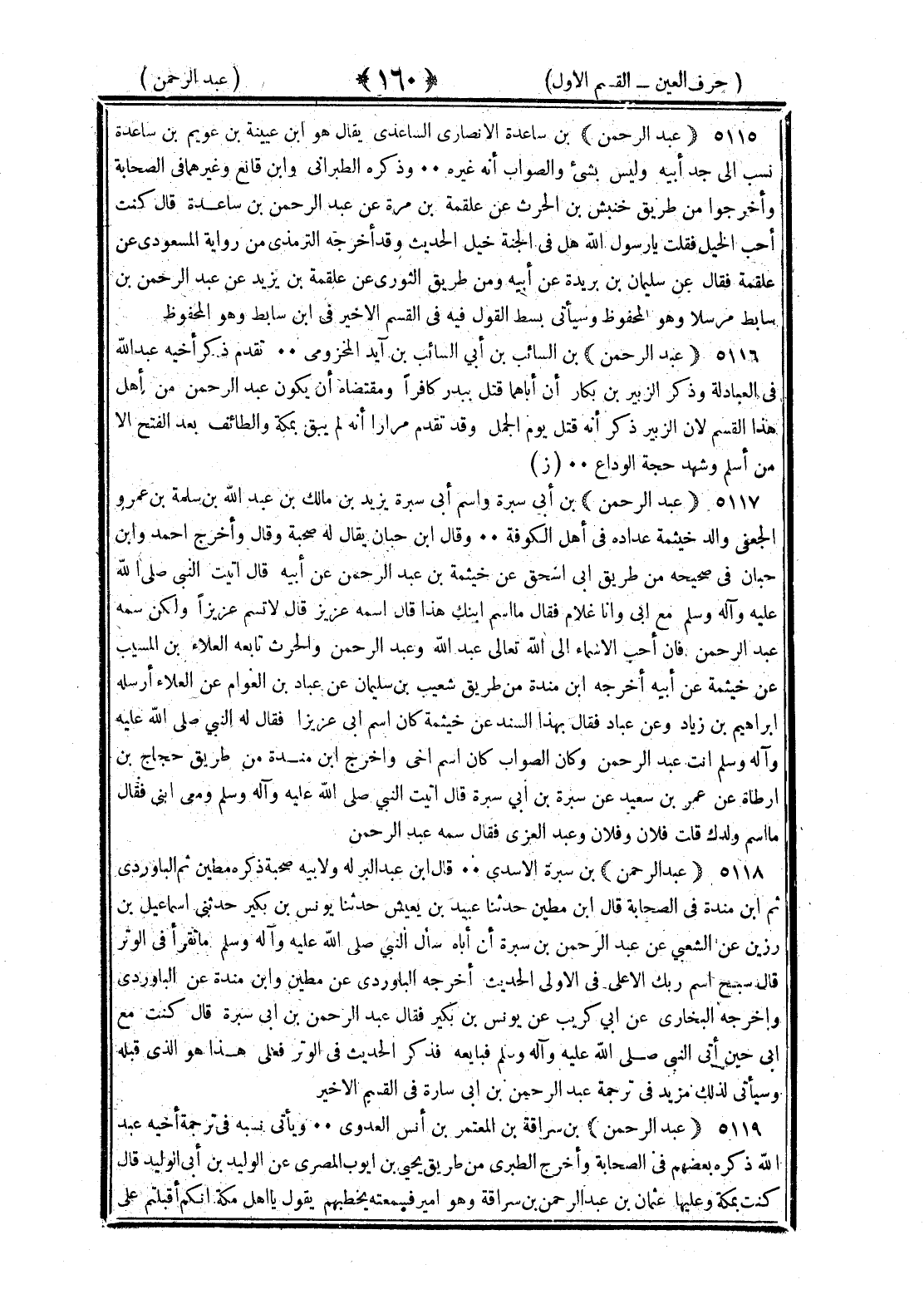 <160> عبد الرحمن بن ساعدة الأنصاري الساعدي يقال هو بن عيينة بن عويم بن ساعدة نسب إلى جد أبيه وليس بشيء والصواب أنه غيره وذكره الطبراني وابن قانع وغيرهما في الصحابة وأخرجوا من طريق خنيس بن الحارث عن علقمة بن مرة عن عبد الرحمن بن ساعدة قال كنت أحب الخيل فقلت يا رسول الله هل في الجنة خيل الحديث وقد أخرجه الترمذي من رواية المسعودي عن علقمة فقال عن سليمان بن بريدة عن أبيه ومن طريق الثوري عن علقمة بن يزيد عن عبد الرحمن بن سابط مرسلا وهو المحفوظ وسيأتي بسط القول فيه في القسم الأخير في بن سابط وهو المحفوظ عبد الرحمن بن السائب بن أبي السائب بن عائذ المخزومي تقدم ذكر أخيه عبد الله في العبادلة وذكر الزبير بن بكار أن أباهما قتل ببدر كافرا ومقتضاه أن يكون عبد الرحمن من أهل هذا القسم لأن الزبير ذكر أنه قتل يوم الجمل وقد تقدم مرارا أنه لم يبق بمكة والطائف بعد الفتح إلا من أسلم وشهد حجة الوداع عبد الرحمن بن أبي سبرة واسم أبي سبرة يزيد بن مالك بن عبد الله بن سلمة بن عمرو الجعفي والد خيثمة عداده في أهل الكوفة وقال بن حبان يقال له صحبة وقال وأخرج أحمد وابن حبان في صحيحه من طريق أبي إسحاق عن خيثمة بن عبد الرحمن عن أبيه قال أتيت النبي صلى الله عليه وسلم مع أبي وأنا غلام فقال ما اسم ابنك هذا قال اسمه عزيز قال لا تسم عزيزا ولكن سمه عبد الرحمن فإن أحب الأسماء إلى الله تعالى عبد الله وعبد الرحمن والحارث تابعه العلاء بن المسيب عن خيثمة عن أبيه أخرجه بن منده من طريق شعيب بن سليمان عن عباد بن العوام عن العلاء أرسله إبراهيم بن زياد وعن عباد فقال بهذا السند عن خيثمة كان اسم أبي عزيزا فقال له النبي صلى الله عليه وسلم أنت عبد الرحمن وكأن الصواب كان اسم أخي وأخرج بن منده من طريق حجاج بن أرطاة عن عمر بن سعيد عن سبرة عن أبي سبرة قال أتيت النبي صلى الله عليه وسلم ومعي ابني فقال ما اسم ولدك قلت فلان وفلان وعبد العزي فقال سمه عبد الرحمن عبد الرحمن بن سبرة الأسدي قال بن عبد البر له ولأبيه صحبة ذكره مطين ثم الباوردي ثم بن منده في الصحابة قال مطين حدثنا عبيد بن يعيش حدثنا يونس بن بكير حدثني إسماعيل بن رزين عن الشعبي عن عبد الرحمن بن سبرة أن أباه سأل النبي صلى الله عليه وسلم ما تقرأ في الوتر قال سبح اسم ربك الأعلى في الأولى الحديث أخرجه الباوردي عن مطين وابن منده والباوردي وأخرجه البخاري عن أبي كريب عن يونس بن بكير فقال عبد الرحمن بن أبي سبرة قال كنت مع أبي حين أتى النبي صلى الله عليه وسلم فبايعه فذكر الحديث في الوتر فعلى هذا هو الذي قبله وسيأتي لذلك مزيد في ترجمة عبد الرحمن بن أبي سارة في القسم الأخير عبد الرحمن بن سراقة بن المعتمر بن أنس العدوي وسيأتي نسبه في ترجمة أخيه عبد الله ذكره بعضهم في الصحابة وأخرج الطبري من طريق يحيى بن أيوب المصري عن الوليد بن أبي الوليد قال كنت بمكة وعليها عثمان بن عبد الرحمن بن سراقة وهو أمير فسمعته يخطبهم يقول يا أهل مكة إنكم أقبلتم على §