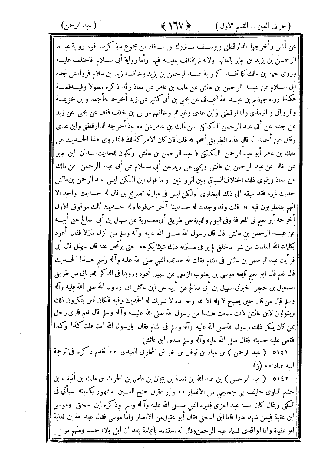 <167> عن أنس وأخرجها الدارقطني ويوسف متروك ويستفاد من مجموع ما ذكرت قوة رواية عبد الرحمن بن يزيد بن جابر بإتقانها ولأنه لم يختلف عليه فيها وأما رواية أبي سلام فاختلف عليه وروى حماد بن مالك كما تقدم كرواية عبد الرحمن بن يزيد وخالفه زيد بن سلام فرواه عن جده أبي سلام عن عبد الرحمن بن عائش عن مالك بن عامر عن معاذ وقد ذكره مطولا وفيه قصة هكذا رواه جهضم بن عبد الله اليماني عن يحيى بن أبي كثير عن زيد أخرجه أحمد وابن خزيمة والروياني والترمذي والدارقطني وابن عدي وغيرهم وخالفهم موسى بن خلف فقال عن يحيى عن زيد عن جده عن أبي عبد الرحمن السكسكي عن مالك بن عامر عن معاذ أخرجه الدارقطني وابن عدي ونقل عن أحمد أنه قال هذه الطريق أصحها قلت فإن كان الأمر كذلك فإنما روى هذا الحديث عن مالك بن عامر أبو عبد الرحمن السكسكي لا عبد الرحمن بن عائش ويكون للحديث سندان ابن جابر عن خالد عن عبد الرحمن بن عائش ويحيى عن زيد عن أبي سلام عن أبي عبد الرحمن عن مالك عن معاذ ويقوي ذلك اختلاف السياق بين الروايتين وأما قول بن السكن ليس لعبد الرحمن بن عائش حديث غيره فقد سبقه إلى ذلك البخاري ولكن ليس في عبارته تصريح بل قال له حديث واحد إلا أنهم يضطربون فيه قلت وقد وجدت له حديثا آخر مرفوعا وله حديث ثالث موقوف الأول أخرجه أبو نعيم في المعرفة وفي اليوم والليلة من طريق أبي معاوية عن سهيل بن أبي صالح عن أبيه عن عبد الرحمن بن عائش قال قال رسول الله صلى الله عليه وسلم من نزل منزلا فقال أعوذ بكلمات الله التامات من شر ما خلق لم ير في منزله ذلك شيئا يكرهه حتى يرتحل عنه قال سهيل قال أبي فرأيت عبد الرحمن بن عائش في المنام فقلت له حدثك النبي صلى الله عليه وسلم هذا الحديث قال نعم قال أبو نعيم تابعه موسى بن يعقوب الزمعي عن سهيل نحوه وروينا في الذكر للفريابي من طريق إسماعيل بن جعفر أخبرني سهيل بن أبي صالح عن أبيه عن بن عائش أن رسول الله صلى الله عليه وسلم قال من قال حين يصبح لا إله إلا الله وحده لا شريك له الحديث وفيه فكان ناس ينكرون ذلك ويقولون لابن عائش لأنت سمعت هذا من رسول الله صلى الله عليه وسلم قال نعم فأرى رجل ممن كان ينكر ذلك رسول الله صلى الله عليه وسلم في المنام فقال يا رسول الله أنت قلت كذا وكذا فقص عليه حديثه فقال صلى الله عليه وسلم صدق بن عائش عبد الرحمن بن عباد بن نوفل بن خراش المحاربي العبدي تقدم ذكره في ترجمة أبيه عباد عبد الرحمن بن عبد الله بن ثعلبة بن بيجان بن عامر بن الحارث بن مالك بن أنيف بن جشم البلوي حليف بني جحجبي من الأنصار أبو عقيل بفتح العين مشهور بكنيته سيأتي في الكنى ويقال كان اسمه عبد العزي فغيره النبي صلى الله عليه وسلم وذكره بن إسحاق وموسى بن عقبة فيمن شهد بدرا فأما بن إسحاق فقال أبو عقيل من الأنصار وأما موسى فقال عبد الله بن ثعلبة أبو عقيلة وأما الواقدي فسماه عبد الرحمن وقال استشهد باليمامة بعد أن أبلى بلاء حسنا ومنهم من §