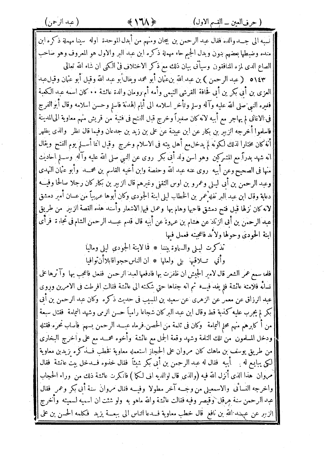 <168> نسبه إلى جد والده فقال عبد الرحمن بن بيجان ومنهم من أبدل الموحدة أوله سينا مهملة وذكره بن منده وضبطها بعضهم بنون وبدل الجيم حاء مهملة ذكره بن عبد البر والأول هو المعروف وهو صاحب الصاع الذي لمزه المنافقون وسيأتي بيان ذلك مع ذكر الاختلاف في الكنى إن شاء الله تعالى عبد الرحمن بن عبد الله بن عثمان أبو محمد ويقال أبو عبد الله وقيل أبو عثمان وقيل عبد العزي بن أبي بكر بن أبي قحافة القرشي التيمي وأمه أم رومان والدة عائشة كان اسمه عبد الكعبة فغيره النبي صلى الله عليه وسلم وتأخر إسلامه إلى أيام الهدنة فأسلم وحسن إسلامه وقال أبو الفرج في الأغاني لم يهاجر مع أبيه لأنه كان صغيرا وخرج قبل الفتح في فتية من قريش منهم معاوية إلى المدينة فأسلموا أخرجه الزبير بن بكار عن بن عيينة عن علي بن زيد بن جدعان وفيما قال نظر والذي يظهر أنه كان مختارا لذلك لكونه لم يدخل مع أهل بيته في الإسلام وخرج وقيل إنما أسلم يوم الفتح ويقال إنه شهد بدرا مع المشركين وهو أسن ولد أبي بكر روى عنه النبي صلى الله عليه وسلم أحاديث منها في الصحيح وعن أبيه روى عنه عبد الله وحفصة وابن أخيه القاسم بن محمد وأبو عثمان النهدي وعبد الرحمن بن أبي ليلى وعمرو بن أوس الثقفي وغيرهم قال الزبير بن كبار كان رجلا صالحا وفيه دعابة وقال بن عبد البر نفله عمر بن الخطاب ليلى ابنة الجودي وكان أبوها عربيا من غسان أمير دمشق لأنه كان نزلها قبل فتح دمشق فأحبها وهام بها وعمل فيها الأشعار وأسند هذه القصة الزبير من طريق عبد الرحمن بن أبي الزناد عن هشام بن عروة عن أبيه قال قدم عبد الرحمن الشام في تجارة فرأى ابنة الجودي وحولها ولائد فأعجبته وعمل فيها تذكرت ليلى والسماوة بيننا فما لابنة الجودي ليلى وماليا وأنى تلاقيها بلى ولعلها إن الناس حجوا قابلا أن توافيا فلما سمع عمر الشعر قال لأمير الجيش إن ظفرت بها فادفعها لعبد الرحمن ففعل فأعجب بها وآثرها على نسائه فلامته عائشة فلم يفد فيه ثم إنه جفاها حتى شكته إلى عائشة فقالت أفرطت في الأمرين وروى عبد الرزاق عن معمر عن الزهري عن سعيد بن المسيب في حديث ذكره وكان عبد الرحمن بن أبي بكر لم يجرب عليه كذبة قط وقال بن عبد البر كان شجاعا راميا حسن الرمي وشهد اليمامة فقتل سبعة من أكابرهم منهم محكم اليمامة وكان في ثلمة من الحصن فرماه عبد الرحمن بسهم فأصاب نحره فقتله ودخل المسلمون من تلك الثلمة وشهد وقعة الجمل مع عائشة وأخوه محمد مع علي وأخرجه البخاري من طريق يوسف بن ماهك كان مروان على الحجاز استعمله معاوية فخطب فذكر يزيد بن معاوية لكي يبايع له بعد أبيه فقال له عبد الرحمن بن أبي بكر شيئا فقال خذوه فدخل بيت عائشة فقال مروان هذا الذي أنزل الله فيه والذي قال لوالديه أف لكما فأنكرت عائشة ذلك من وراء الحجاب وأخرجه النسائي والإسماعيلي من وجه آخر مطولا فقال مروان سنة أبي بكر وعمر فقال عبد الرحمن سنة هرقل وقيصر وفيه فقالت عائشة والله ما هو به ولو شئت أن أسميه لسميته وأخرج الزبير عن عبد الله بن نافع قال خطب معاوية فدعا الناس إلى بيعة يزيد فكلمه الحسين بن علي §