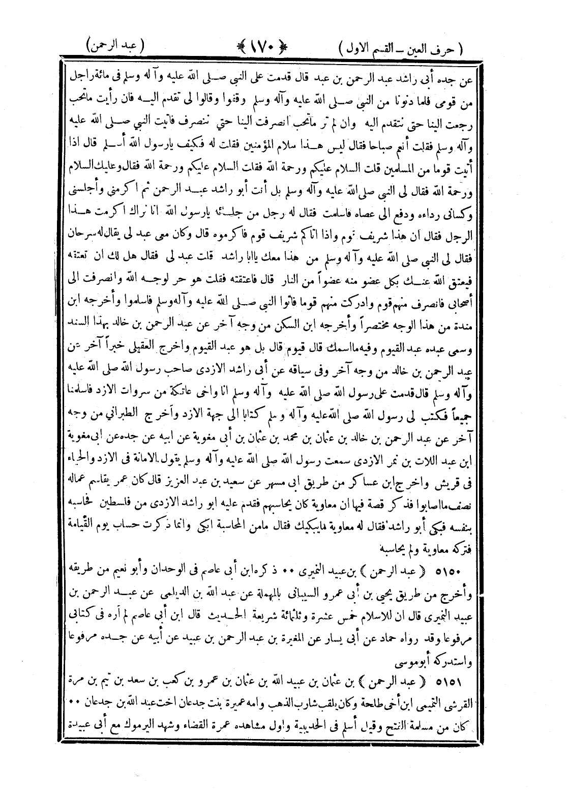 <170> عن جده أبي راشد عبد الرحمن بن عبد قال قدمت على النبي صلى الله عليه وسلم في مائة راجل من قومي فلما دنونا من النبي صلى الله عليه وسلم وقفوا وقالوا لي تقدم إليه فإن رأيت ما تحب رجعت إلينا حتى نتقدم إليه وإن لم تر ما تحب انصرفت إلينا حتى ننصرف فأتيت النبي صلى الله عليه وسلم فقلت أنعم صباحا فقال ليس هذا سلام المؤمنين فقلت له فكيف يا رسول الله أسلم قال إذا أتيت قوما من المسلمين قلت السلام عليكم ورحمة الله فقلت السلام عليكم ورحمة الله فقال وعليك السلام ورحمة الله فقال لي النبي صلى الله عليه وسلم بل أنت أبو راشد عبد الرحمن ثم أكرمني وأجلسني وكساني رداءه ودفع إلي عصاه فأسلمت فقال له رجل من جلسائه يا رسول الله إنا نراك أكرمت هذا الرجل فقال إن هذا شريف قوم وإذا أتاكم شريف قوم فأكرموه وقال وكان معي عبد لي يقال له سرحان فقال النبي صلى الله عليه وسلم من هذا معك يا أبا راشد قلت عبد لي فقال هل لك أن تعتقه فيعتق الله عنك بكل عضو منه عضوا من النار قال فأعتقته فقلت هو حر لوجه الله واصرفت إلى أصحابي فانصرف منهم قوم وأدركت منهم قوما فأتوا النبي صلى الله عليه وسلم فأسلموا وأخرجه بن منده من هذا الوجه مختصرا وأخرجه بن السكن من وجه آخر عن عبد الرحمن بن خالد بهذا السند وسمى عبده عبد القيوم وفيه ما اسمك قال قيوم قال بل هو عبد القيوم وأخرج العقيلي خبرا آخر عن عبد الرحمن بن خالد من وجه آخر وفي سياقه عن أبي راشد الأزدي صاحب رسول الله صلى الله عليه وسلم قال قدمت على رسول الله صلى الله عليه وسلم أنا وأخي عاتكة من سروات الأزد فأسلمنا جميعا فكتب لي رسول الله صلى الله عليه وسلم كتابا إلى جهة الأزد وأخرج الطبراني من وجه آخر عن عبد الرحمن بن خالد بن عثمان بن محمد بن عثمان بن أبي مغوية عن أبيه عن جده عن أبيه عن جده عن أبي مغوية بن اللات بن نمر الأزدي سمعت رسول الله صلى الله عليه وسلم يقول الأمانة في الأزد والحياء في قريش وأخرج بن عساكر من طريق أبي مسهر عن سعيد بن عبد العزيز قال كان عمر يقاسم عماله نصف ما أصابوا فذكر قصة فيها أن معاوية كان يحاسبهم فقدم عليه أبو راشد الأزدي من فلسطين فحاسبه بنفسه فبكى أبو راشد فقال له معاوية ما يبكيك فقال ما من المحاسبة أبكي وإنما ذكرت حساب يوم القيامة فتركه معاوية ولم يحاسبه عبد الرحمن بن عبيد النميري ذكره بن أبي عاصم في الوحدان وأبو نعيم من طريقه وأخرج من طريق يحيى بن أبي عمر والسيباني بالمهملة عن عبد الله بن الديلمي عن عبد الرحمن بن عبيد النميري قال إن للإسلام خمس عشرة وثلاثمائة شريعة الحديث قال بن أبي عاصم لم أره في كتابي مرفوعا وقد رواه حماد عن أبي يسار عن المغيرة بن عبد الرحمن بن عبيد عن أبيه عن جده مرفوعا واستدركه أبو موسى عبد الرحمن بن عثمان بن عبيد الله بن عثمان بن عمرو بن كعب بن سعد بن تيم بن مرة القرشي التيمي بن أخي طلحة وكان يلقب شارب الذهب وأمه عميرة بنت جدعان أخت عبيد الله بن جدعان كان من مسلمة الفتح وقيل أسلم في الحديبية وأول مشاهده عمرة القضاء وشهد اليرموك مع أبي عبيدة §