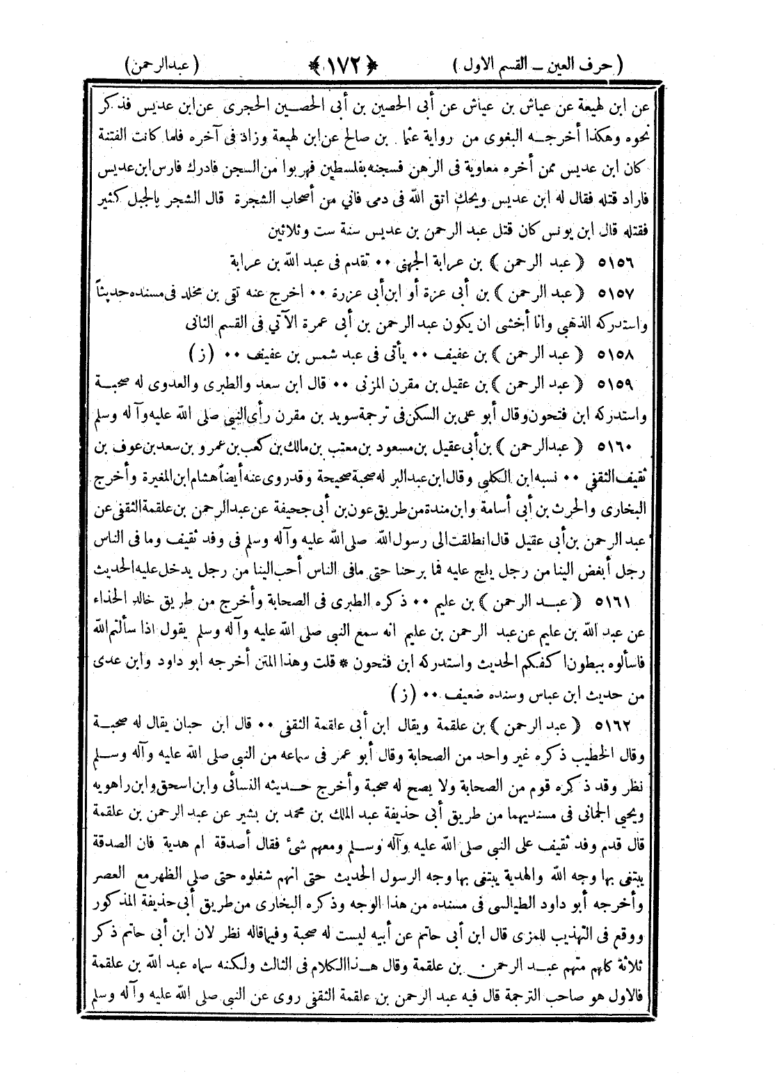 <172> عن بن لهيعة عن عياش بن عباس عن أبي الحصين بن أبي الحصين الحجري عن بن عديس فذكر نحوه وهكذا أخرجه البغوي من رواية عثمان بن صالح عن بن لهيعة وزاد في آخره فلما كانت الفتنة كان بن عديس ممن أخره معاوية في الرهن فسجنه بفلسطين فهربوا من السجن فأدرك فارس بن عديس فأراد قتله فقال له بن عديس ويحك اتق الله في دمي فإني من أصحاب الشجرة قال الشجر بالجبل كثير فقتله قال بن يونس كان قتل عبد الرحمن بن عديس سنة ست وثلاثين عبد الرحمن بن عرابة الجهني تقدم في عبد الله بن عرابة عبد الرحمن بن أبي عزة أو بن أبي عزرة أخرج عنه بقي بن مخلد في مسنده حديثا واستدركه الذهبي وأنا أخشى أن يكون عبد الرحمن بن أبي عمرة الآتي في القسم الثاني عبد الرحمن بن عفيف يأتي في عبد شمس بن عفيف عبد الرحمن بن عقيل بن مقرن المزني قال بن سعد والطبري والعدوي له صحبة واستدركه بن فتحون وقال أبو علي بن السكن في ترجمة سويد بن مقرن رأى النبي صلى الله عليه وسلم عبد الرحمن بن أبي عقيل بن مسعود بن معتب بن مالك بن كعب بن عمرو بن سعد بن عوف بن ثقيف الثقفي نسبه بن الكلبي وقال بن عبد البر له صحبة صحيحة وقد روى عنه أيضا هشام بن المغيرة وأخرج البخاري والحارث بن أبي أسامة وابن منده من طريق عون بن أبي جحيفة عن عبد الرحمن عن علقمة الثقفي عن عبد الرحمن بن أبي عقيل قال انطلقت إلى رسول الله صلى الله عليه وسلم في وفد ثقيف وما في الناس رجل أبغض إلينا من رجل يلج عليه فما برحنا حتى ما في الناس أحب إلينا من رجل يدخل عليه الحديث عبد الرحمن بن عكيم ذكره الطبري في الصحابة وأخرج من طريق خالد بن الحذاء عن عبد الله بن عبد الرحمن بن عكيم أنه سمع النبي صلى الله عليه وسلم يقول إذا سألتم الله فاسألوه ببطون أكفكم الحديث واستدركه بن فتحون قلت وهذا المتن أخرجه أبو داود وابن عدي من حديث بن عباس وسنده ضعيف عبد الرحمن بن علقمة ويقال بن أبي علقمة الثقفي قال ابن حبان يقال له صحبة وقال الخطيب ذكره غير واحد من الصحابة وقال أبو عمر في سماعه من النبي صلى الله عليه وسلم نظر وقد ذكره قوم في الصحابة ولا يصح له صحبة وأخرج حديثه النسائي وإسحاق بن راهويه ويحيى الحماني في مسنديهما من طريق أبي حذيفة عبد الملك بن محمد بن بشير عن عبد الرحمن بن علقمة قال قدم وفد ثقيف على النبي صلى الله عليه وسلم ومعهم شيء فقال أصدقة أم هدية فإن الصدقة يبتغي بها وجه الله والهدية يبتغي بها وجه الله والرسول الحديث حتى إنهم شغلوه حتى صلى الظهر مع العصر وأخرجه أبو داود الطيالسي في مسنده من هذا الوجه وذكره البخاري من طريق أبي حذيفة المذكور ووقع في التهذيب للمزي قال بن أبي حاتم عن أبيه ليست له صحبة وفيما قاله نظر لأن بن أبي حاتم ذكر ثلاثة كل منهم عبد الرحمن بن علقمة وقال هذا الكلام في الثالث ولكنه سماه عبد الله بن علقمة فالأول هو صاحب الترجمة قال فيه عبد الرحمن بن علقمة الثقفي روى عن النبي صلى الله عليه وسلم §