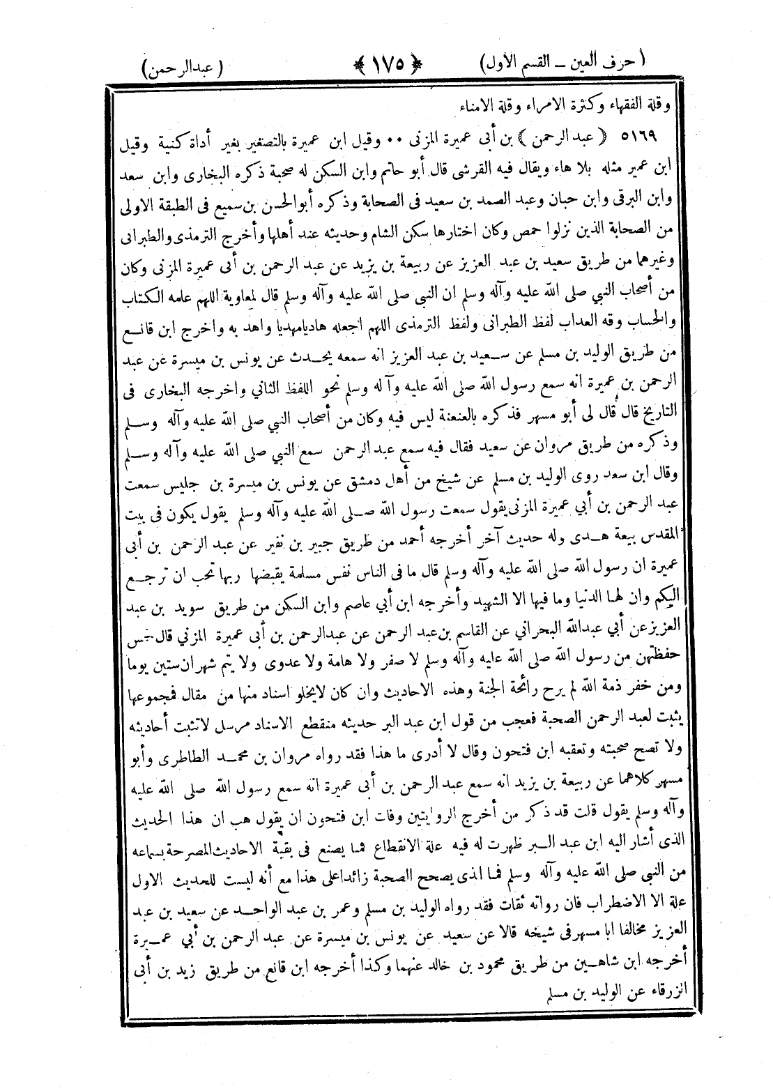 <175> وقلة الفقهاء وكثرة الأمراء وقلة الأمناء عبد الرحمن بن أبي عميرة المزني وقيل بن عميرة بالتصغير بغير أداة كنية وقيل بن عمير مثله بلا هاء ويقال فيه القرشي قال أبو حاتم وابن السكن له صحبة ذكره البخاري وابن سعد وابن البرقي وابن حبان وعبد الصمد بن سعيد في الصحابة وذكره أبو الحسن بن سميع في الطبقة الأولى من الصحابة الذين نزلوا حمص وكان اختارها سكن الشام وحديثه عند أهلها وأخرج الترمذي والطبراني وغيرهما من طريق سعيد بن عبد العزيز عن ربيعة بن يزيد عن عبد الرحمن بن أبي عميرة المزني وكان من أصحاب النبي صلى الله عليه وسلم أن النبي صلى الله عليه وسلم قال لمعاوية اللهم علمه الكتاب والحساب وقه العذاب لفظ الطبراني ولفظ الترمذي اللهم اجعله هاديا مهديا واهد به وأخرج بن قانع من طريق الوليد بن مسلم عن سعيد بن عبد العزيز أنه سمعه يحدث عن يونس بن ميسرة عن عبد الرحمن بن أبي عميرة أنه سمع رسول الله صلى الله عليه وسلم نحو اللفظ الثاني وأخرجه البخاري في التاريخ قال قال لي أبو مسهر فذكره بالعنعنة ليس فيه وكان من أصحاب النبي صلى الله عليه وسلم وذكره من طريق مروان عن سعيد فقال فيه سمع عبد الرحمن سمع النبي صلى الله عليه وسلم وقال بن سعد روى الوليد بن مسلم عن شيخ من أهل دمشق عن يونس بن ميسرة بن حلبس سمعت عبد الرحمن بن أبي عميرة المزني يقول سمعت رسول الله صلى الله عليه وسلم يقول يكون في بيت المقدس بيعة هدى وله حديث آخر أخرجه أحمد من طريق جبير بن نفير عن عبد الرحمن بن أبي عميرة أن رسول الله صلى الله عليه وسلم قال ما في الناس نفس مسلمة يقبضها ربها تحب أن ترجع إليكم وإن لها الدنيا وما فيها إلا الشهيد وأخرجه بن أبي عاصم وابن السكن من طريق سويد بن عبد العزيز عن أبي عبد الله البحراني عن القاسم بن عبد الرحمن عن عبد الرحمن بن أبي عميرة المزني قال خمس حفظتهن من رسول الله صلى الله عليه وسلم لا صفر ولا هامة ولا عدوي ولا يتم شهران ستين يوما ومن أخفر ذمة الله لم يرح رائحة الجنة وهذه الأحاديث وإن كان لا يخلو إسناد منها من مقال فمجموعها يثبت لعبد الرحمن الصحبة فعجب من قول بن عبد البر حديثه منقطع الإسناد مرسل لا تثبت أحاديثه ولا تصح صحبته وتعقبه بن فتحون وقال لا أدري ما هذا فقد رواه مروان بن محمد الطاطري وأبو مسهر كلاهما عن ربيعة بن يزيد أنه سمع عبد الرحمن بن أبي عميرة أنه سمع رسول الله صلى الله عليه وسلم يقول قلت قد ذكر من أخرج الروايتين وفات بن فتحون أن يقول هب أن هذا الحديث الذي أشار إليه بن عبد البر ظهرت له فيه علة الانقطاع فما يصنع في بقية الأحاديث المصرحة بسماعه من النبي صلى الله عليه وسلم فما الذي يصحح الصحبة زائدا على هذا مع أنه ليست للحديث الأول علة الاضطراب فإن روايته ثقات فقد رواه الوليد بن مسلم وعمر بن عبد الواحد عن سعيد بن عبد العزيز فخالفا أبا مسهر في شيخه قالا سعيد عن يونس بن ميسرة عن عبد الرحمن بن أبي عميرة أخرجه بن شاهين من طريق محمود بن خالد عنهما وكذا أخرجه بن قانع من طريق زيد بن أبي الزرقاء عن الوليد بن مسلم §