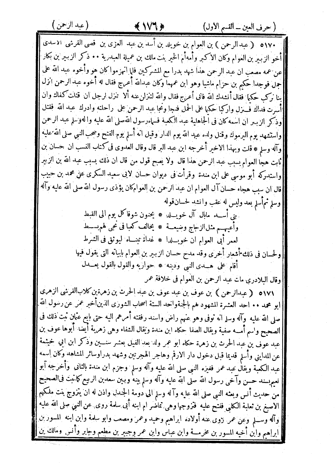 <176> عبد الرحمن بن العوام بن خويلد بن أسد بن عبد العزي بن قصي القرشي الأسدي أخو الزبير بن العوام وكان الأكبر وأمه أم الخير بنت مالك بن عميلة العبدرية ذكر الزبير بن بكار عن عمه مصعب أن عبد الرحمن هذا شهد بدرا مع المشركين فلما انهزموا كان هو وأخوه عبد الله على جمل فوجدا حكيم بن حزام ماشيا وهو بن عمهما وكان عبد الله أعرج فقال له أخوه عبد الرحمن انزل بنا نركب حكيما فقال أنشدك الله فإني أعرج فقال والله لتنزلن عنه ألا تنزل لرجل إن قتلت كفاك وإن أسرت فداك فنزل وأركبا حكيما على الجمل فنجا ونجا عبد الرحمن على راحلته وأدرك عبد الله فقتل وذكر الزبير أن اسمه كان في الجاهلية عبد الكعبة فسماه رسول الله صلى الله عليه وسلم عبد الرحمن واستشهد يوم اليرموك وقتل ولده عبد الله يوم الدار وقيل إنه أسلم يوم الفتح وصحب النبي صلى الله عليه وسلم قلت وبهذا الأخير أخرجه بن عبد البر قال وقال العدوي في كتاب النسب إن حسان بن ثابت هجا العوام بسبب عبد الرحمن هذا قال ولا يصح قول من قال إن ذلك بسبب عبد الله بن الزبير واستدركه أبو موسى علي بن منده وقرأت في ديوان حسان لأبي سعيد السكري عن محمد بن حبيب قال إن سبب هجاء حسان آل العوام أن عبد الرحمن بن العوام كان يؤذي رسول الله صلى الله عليه وسلم ثم أسلم بعد وليس له عقب وأنشد لحسان قوله بني أسد ما بال آل خويلد يحنون شوقا كل يوم إلى القبط وأعينهم مثل الزجاج وصيغة يخالف كعبا في لحي لهم ثط لعمر أبي العوام إن خويلدا غداة تبناه ليوثق في الشرط ولحسان في ذلك أشعار أخرى وقد مدح حسان الزبير بن العوام بأبياته التي يقول فيها أقام على هدى النبي ودينه حواريه والقول بالقول يعدل وقال البلاذري مات عبد الرحمن بن العوام في خلافة عمر عبد الرحمن بن عوف بن عبد عوف بن عبد الحارث بن زهرة بن كلاب القرشي الزهري أبو محمد أحد العشرة المشهود لهم بالجنة وأحد الستة أصحاب الشورى الذي أخبر عمر عن رسول الله صلى الله عليه وسلم أنه توفي وهو عنهم راض وأسند رفقته أمرهم إليه حتى بايع عثمان ثبت ذلك في الصحيح واسم أمه صفية ويقال الصفاء حكاه بن منده ويقال الشفاء وهي زهرية أيضا أبوها عوف بن عبد عوف بن عبد الحارث بن زهرة حكاه أبو عمر ولد بعد الفيل بعشر سنين وذكره بن أبي خيثمة عن المدائني وأسلم قديما قبل دخول دار الأرقم وهاجر الهجرتين وشهد بدرا وسائر المشاهد وكان اسمه عبد الكعبة ويقال عبد عمرو فغيره النبي صلى الله عليه وسلم وجزم بن منده بالثاني وأخرجه أبو نعيم بسند حسن وآخى رسول الله صلى الله عليه وسلم بينه وبين سعد بن الربيع كما ثبت في الصحيح من حديث أنس وبعثه النبي صلى الله عليه وسلم إلى دومة الجندل وأذن له أن يتزوج بنت ملكهم الاصبغ بن ثعلبة الكلبي ففتح عليه فتزوجها وهي تماضر أم ابنه أبي سلمة روى عن النبي صلى الله عليه وسلم وعن عمر روى عنه أولاده إبراهيم وحميد وعمر ومصعب وأبو سلمة وابن ابنه المسور بن إبراهيم وابن أخته المسور بن مخرمة وابن عباس وابن عمر وجبير بن مطعم وجابر وأنس ومالك بن §