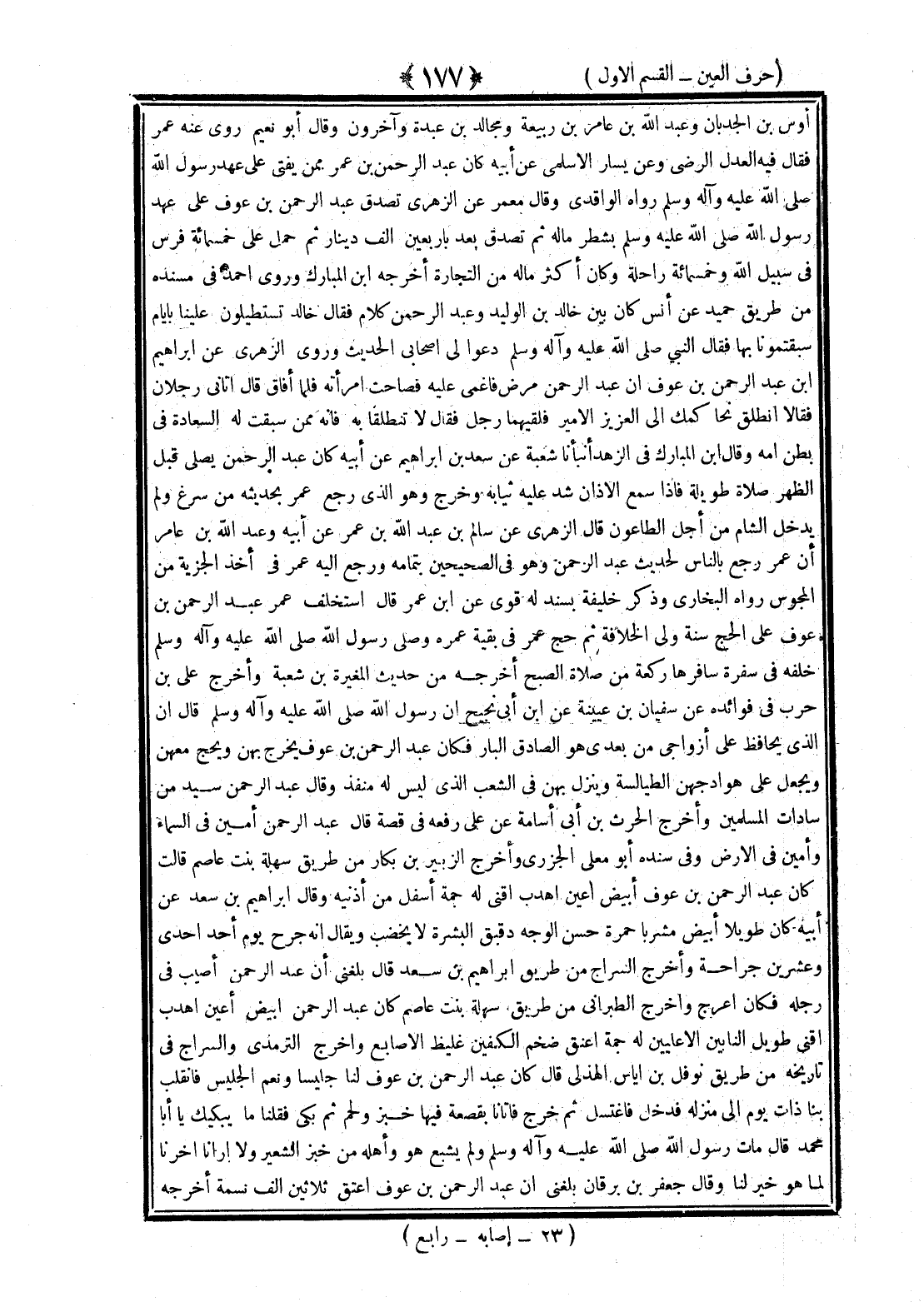 <177> أوس بن الحدثان وعبد الله بن عامر بن ربيعة وبجالة بن عبدة وآخرون وقال أبو نعيم روى عنه عمر فقال فيه العدل الرضى وعن نيار الأسلمي عن أبيه كان عبد الرحمن ممن يفتى على عهد رسول الله صلى الله عليه وسلم رواه الواقدي وقال معمر عن الزهري تصدق عبد الرحمن بن عوف على عهد رسول الله صلى الله عليه وسلم بشطر ماله ثم تصدق بعد بأربعين ألف دينار ثم حمل على خمسمائة فرس في سبيل الله وخمسمائة راحلة وكان أكثر ماله من التجارة أخرجه بن المبارك وروى أحمد في مسنده من طريق حميد عن أنس كان بين خالد بن الوليد وعبد الرحمن كلام فقال خالد تستطيلون علينا بأيام سبقتمونا بها فقال النبي صلى الله عليه وسلم دعوا لي أصحابي الحديث وروى الزهري عن إبراهيم عن عبد الرحمن بن عوف أن عبد الرحمن مرض فأغمي عليه فصاحت امرأته فلما أفاق قال أتاني رجلان فقالا انطلق نحاكمك إلى العزيز الأمين فلقيهما رجل فقال لا تنطلقا به فإنه ممن سبقت له السعادة في بطن أمه وقال بن المبارك في الزهد أنبأنا شعبة عن سعيد بن إبراهيم عن أبيه كان عبد الرحمن يصلي قبل الظهر صلاة طويلة فإذا سمع الأذان شد عليه ثيابه وخرج وهو الذي رجع عمر بحديثه من سرغ ولم يدخل الشام من أجل الطاعون قال الزهري عن سالم بن عبد الله بن عمر عن أبيه وعبد الله بن عامر إن عمر رجع بالناس لحديث عبد الرحمن وهو في الصحيحين بتمامه ورجع إليه عمر في أخذ الجزية من المجوس رواه البخاري وذكر خليفة بسند له قوي عن بن عمر قال استخلف عمر عبد الرحمن بن عوف على الحج سنة ولي الخلافة ثم حج عمر في بقية عمره وصلى رسول الله صلى الله عليه وسلم خلفه في سفرة سافرها ركعة من صلاة الصبح أخرجه من حديث المغيرة بن شعبة وأخرج علي بن حرب في فوائده عن سفيان بن عيينة عن بن أبي نجيح أن رسول الله صلى الله عليه وسلم قال الذي يحافظ على أزواجي من بعدي هو الصادق البار فكان عبد الرحمن بن عوف يخرج بهن ويحج معهن ويجعل على هوادجهن الطيالسة وينزل بهن في الشعب الذي ليس له منفذ وقال عمر عبد الرحمن سيد من سادات المسلمين وأخرج الحارث بن أبي أسامة عن علي رفعه في قصة قال عبد الرحمن أمين في السماء وأمين في الأرض وفي سنده أبو معلى الجزري وأخرج الزبير بن بكار من طريق سهلة بنت عاصم قالت كان عبد الرحمن بن عوف أبيض أعين أهدب أقنى له جمة أسفل من أذنيه وقال إبراهيم بن سعد عن أبيه كان طويلا أبيض مشربا حمرة حسن الوجه دقيق البشرة لا يخضب ويقال إنه جرح يوم أحد إحدى وعشرين جراحة وأخرج السراج من طريق إبراهيم بن سعد قال بلغني أن عبد الرحمن أصيب في رجله فكان أعرج وأخرج الطبراني من طريق سهلة بنت عاصم كان عبد الرحمن أبيض أعين أهدب الأشعار اقنى طويل النابين الأعليين له جمة أعنق ضخم الكفين غليظ الأصابع وأخرج الترمذي والسراج في تاريخه من طريق نوفل بن إياس الهذلي قال كان عبد الرحمن بن عوف لنا جليسا ونعم الجليس فانقلب بنا ذات يوم إلى منزله فدخل فاغتسل ثم خرج فأتانا بقصعة فيها خبز ولحم ثم بكى فقلنا ما يبكيك يا أبا محمد قال مات رسول الله صلى الله عليه وسلم ولم يشبع هو وأهله من خبز الشعير ولا أرانا أخرنا لما هو خير لنا وقال جعفر بن برقان بلغني أن عبد الرحمن بن عوف أعتق ثلاثين ألف نسمة أخرجه §