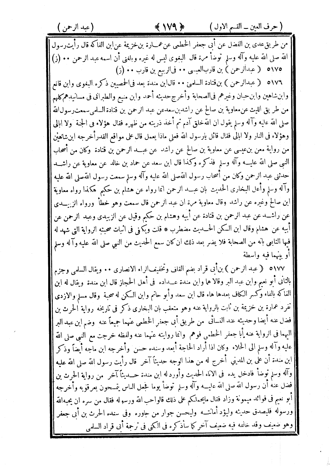 <179> من طريق عدي بن الفضل عن أبي جعفر الخطمي عن عمارة بن خزيمة عن بن الفاكه قال رأيت رسول الله صلى الله عليه وسلم توضأ مرة قال البغوي ليس له غيره وبلغني أن اسمه عبد الرحمن عبد الرحمن بن قارب العبسي في الربيع بن قارب عبد الرحمن بن قتادة السلمي قال بن منده يعد في الحمصيين ذكره البغوي وابن قانع وابن شاهين وابن حبان وغيرهم في الصحابة وأخرج حديثه أحمد وابن منيع والطبراني في مسانيدهم كلهم من طريق الليث عن معاوية بن صالح عن راشد بن سعد عن عبد الرحمن بن قتادة السلمي سمعت رسول الله صلى الله عليه وسلم يقول إن الله خلق آدم ثم أخذ ذريته من ظهره فقال هؤلاء في الجنة ولا أبالي وهؤلاء في النار ولا أبالي فقال قائل يا رسول الله فعلى ماذا نعمل قال على مواقع القدر وأخرجه بن شاهين من رواية معن بن عيسى عن معاوية بن صالح عن راشد عن عبد الرحمن بن قتادة وكان من أصحاب النبي صلى الله عليه وسلم وسلم فذكره وكذا قال بن سعد عن حماد بن خالد عن معاوية عن راشد حدثني عبد الرحمن وكان من أصحاب رسول الله صلى الله عليه وسلم سمعت رسول الله صلى الله عليه وسلم وأعل البخاري الحديث بأن عبد الرحمن إنما رواه عن هشام بن حكيم هكذا رواه معاوية بن صالح وغيره عن راشد وقال معاوية مرة إن عبد الرحمن قال سمعت وهو خطأ ورواه الزبيدي عن راشد عن عبد الرحمن بن قتادة عن أبيه وهشام بن حكيم وقيل عن الزبيدي وعبد الرحمن عن أبيه عن هشام وقال بن السكن الحديث مضطرب قلت ويكفي في إثبات صحبته الرواية التي شهد له فيها التابعي بأنه من الصحابة فلا يضر بعد ذلك إن كان سمع الحديث من النبي صلى الله عليه وسلم أو بينهما فيه واسطة عبد الرحمن بن أبي قراد بضم القاف وتخفيف الراء الأنصاري ويقال السلمي وجزم بالثاني أبو نعيم وابن عبد البر وقالا هما وابن منده عداده في أهل الحجاز قال بن منده ويقال له بن الفاكه بالفاء وكسر الكاف بعدها هاء قال بن سعد وأبو حاتم وابن السكن فيه صحبة وقال مسلم والأزدي تفرد عمارة بن خزيمة بن ثابت بالرواية عنه وهو متعقب بأن البخاري ذكر في تاريخه رواية الحارث بن فضيل عنه أيضا وحديثه عند النسائي من طريق أبي جعفر الخطمي عنهما جميعا عنه وضم بن عبد البر إليهما في الرواية عنه أبا جعفر الخطمي فوهم وإنما روايته عنهما عنه ولفظه خرجت مع النبي صلى الله عليه وسلم إلى الخلاء وكان إذا أراد الحاجة أبعد وسنده حسن وأخرجه بن ماجة أيضا وذكر بن منده أن علي بن المديني أخرج له من هذا الوجه حديثا آخر قال رأيت رسول الله صلى الله عليه وسلم توضأ فأدخل يده في الإناء الحديث وأورد له بن منده حديثا آخر من رواية الحارث بن فضيل عنه أن رسول الله صلى الله عليه وسلم توضأ يوما فجعل الناس يتمسحون بعرقوبه وأخرجه أبو نعيم في فوائد ميمونة وزاد فقال ما يحملكم على ذلك قالوا حب الله ورسوله فقال من سره أن يحبه الله ورسوله فليصدق حديثه وليؤد أمانته وليحسن جوار من جاوره وفي سنده الحارث بن أبي جعفر وهو ضعيف وقد خالفه فيه ضعيف آخر كما سأذكره في الكنى في ترجمة أبي قراد السلمي §