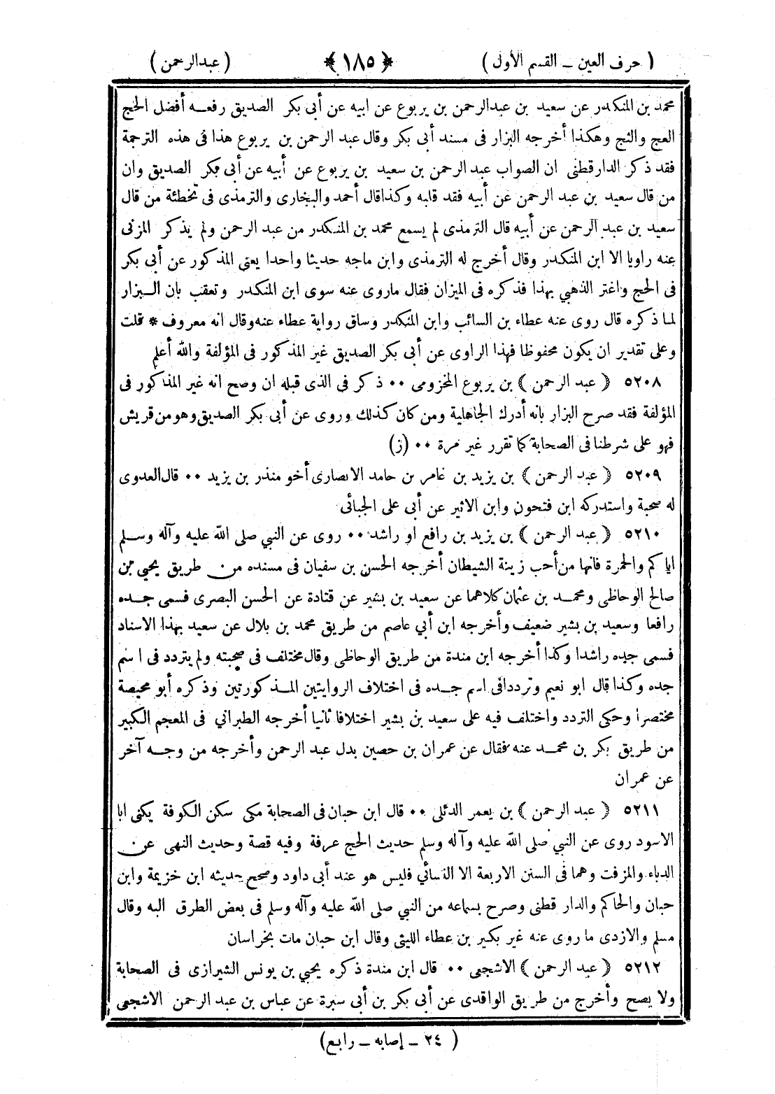 <185> محمد بن المنكدر عن سعيد بن عبد الرحمن بن يربوع عن أبيه عن أبي بكر الصديق رفعه أفضل الحج العج والثج وهكذا أخرجه البزار في مسند أبي بكر وقال عبد الرحمن بن يربوع هذا أدرك الجاهلية قلت ولا دخول لعبد الرحمن بن يربوع هذا في هذه الترجمة فقد ذكر الدارقطني أن الصواب عبد الرحمن بن سعيد بن يربوع عن أبيه عن أبي بكر الصديق وأن من قال سعيد بن عبد الرحمن عن أبيه فقد قلبه وكذا قال أحمد والبخاري والترمذي في تخطئة من قال سعيد بن عبد الرحمن عن أبيه قال الترمذي لم يسمع محمد بن المنكدر من عبد الرحمن ولم يذكر المزي عنه راويا إلا بن المنكدر وقال أخرج له الترمذي وابن ماجة حديثا واحدا يعني المذكور عن أبي بكر في الحج واغتر الذهبي بهذا فذكره في الميزان فقال ما روى عنه سوى بن المنكدر وتعقب بأن البزار لما ذكره قال روى عنه عطاء بن السائب وابن المنكدر وساق رواية عطاء عنه وقال إنه معروف قلت وعلى تقدير أن يكون محفوظا فهذا الراوي عن أبي بكر الصديق غير المذكور في المؤلفة والله أعلم عبد الرحمن بن يربوع المخزومي ذكر في الذي قبله إن وضح أنه غير المذكور في المؤلفة فقد صرح البزار بأنه أدرك الجاهلية ومن كان كذلك وروى عن أبي بكر الصديق وهو من قريش فهو على شرطنا في الصحابة كما تقرر غير مرة عبد الرحمن بن يزيد بن عامر بن حامدة الأنصاري أخو منذر بن يزيد قال العدوي له صحبة واستدركه بن فتحون وابن الأثير عن أبي علي الجياني عبد الرحمن بن يزيد بن رافع أو راشد روى عن النبي صلى الله عليه وسلم إياكم والحمرة فإنها من أحب زينة الشيطان أخرجه الحسن بن سفيان في مسنده من طريق يحيى بن صالح الوحاظي ومحمد بن عثمان كلاهما عن سعيد بن بشير عن قتادة عن الحسن البصري فسمى جده رافعا وسعيد بن بشير ضعيف وأخرجه بن أبي عاصم من طريق محمد بلال عن سعيد بهذا الإسناد فسمى جده راشدا وكذا أخرجه بن منده من طريق الوحاظي وقال مختلف في صحبته ولم يتردد في اسم جده وكذا قال أبو نعيم وتردد في اسم جده في اختلاف الروايتين المذكورتين وذكره أبو محيصة مختصرا وحكى التردد واختلف فيه على سعيد بن بشير اختلافا ثانيا أخرجه الطبراني في المعجم الكبير من طريق بكر بن محمد عنه فقال عن عمران بن حصين بدل عبد الرحمن وأخرجه من وجه آخر عن عمران عبد الرحمن بن يعمر الدئلي قال بن حبان في الصحابة مكي سكن الكوفة يكنى أبا الأسود روى عن النبي صلى الله عليه وسلم حديث الحج عرفة وفيه قصة وحديث النهي عن الدباء والمزفت وهما في السنن الأربعة إلا النسائي فليس هو عند أبي داود وصحح حديثه بن خزيمة وابن حبان والحاكم والدارقطني وصرح بسماعه من النبي صلى الله عليه وسلم في بعض الطرق إليه وقال مسلم والأزدي ما روى عنه غير بكير بن عطاء الليثي وقال بن حبان مات بخراسان عبد الرحمن الأشجعي قال بن منده ذكره يحيى بن يونس الشيرازي في الصحابة ولا يصح وأخرج من طريق الواقدي عن أبي بكر بن أبي سبرة عن عباس بن عبد الرحمن الأشجعي §
