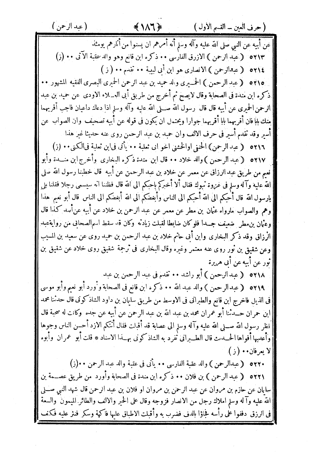 <186> عن أبيه عن النبي صلى الله عليه وسلم أنه أمرهم أن يسنوا من آثارهم يومئذ عبد الرحمن الأزرقي الفارسي ذكره بن قانع وهو والد عقبة الآتي عبد الرحمن الأنصاري هو بن أبي لبيبة تقدم عبد الرحمن الحميري والد حميد بن عبد الرحمن الحميري البصري الفقيه المشهور ذكره بن منده في الصحابة وقال لا يصح ثم أخرج من طريق أبي العلاء الأودي عن حميد بن عبد الرحمن الحميري عن أبيه قال قال رسول الله صلى الله عليه وسلم إذا دعاك داعيان فأجب أقربهما منك جوارا ويحتمل أن يكون في قوله عن أبيه تصحيف وأن الصواب عن أسير وقد تقدم أسير في حرف الألف وأن حميد بن عبد الرحمن روى عنه حديثا غير هذا عبد الرحمن الحنفي أو الخشني أخو أبي ثعلبة يأتي في بن ثعلبة في الكنى عبد الرحمن والد خلاد قال بن منده ذكره البخاري وأخرج بن منده وأبو نعيم من طريق عبد الرزاق عن معمر عن خلاد بن عبد الرحمن عن أبيه قال خطبنا رسول الله صلى الله عليه وسلم في غزوة تبوك فقال ألا أخبركم بأحبكم إلى الله قال فظننا أنه سيسمي رجلا فقلنا بلى يا رسول الله قال أحبكم إلى الله أحبكم إلى الناس وأبغضكم إلى الله أبغضكم إلى الناس قال أبو نعيم هذا وهم والصواب ما رواه عثمان بن مطر عن معمر عن عبد الرحمن بن خلاد عن أبيه عن أنس كذا قال وعثمان بن مطر ضعيف جدا فلو كان ضابطا لقبلت زيادته وكان قد سقط اسم الصحابي من رواية عبد الرزاق وقد ذكر البخاري وابن أبي حاتم خلاد بن عبد الرحمن بن حميد روى عن سعيد بن المسيب وعن شقيق بن ثور روى عنه معتمر وغيره وقال البخاري في ترجمة شقيق روى خلاد عن شقيق بن ثور عن أبيه عن أبي هريرة عبد الرحمن أبو راشد تقدم في عبد الرحمن بن عبد عبد الرحمن والد عبد الله ذكره بن قانع في الصحابة وأورده أبو نعيم وأبو موسى في الذيل فأخرج بن قانع والطبراني في الأوسط من طريق سليمان بن داود الشاذكوني قال حدثنا محمد بن حمران حدثنا أبو عمران محمد بن عبد الله بن عبد الرحمن عن أبيه عن جده وكانت له صحبة قال نظر رسول الله صلى الله عليه وسلم إلى عصابة قد أقبلت فقال أتتكم الأزد أحسن الناس وجوها وأعذبها أفواها الحديث قال الطبراني تفرد به الشاذكوني بهذا الإسناد قلت أبو عمران وأبوه لا يعرفان عبد الرحمن والد عقبة الفارسي يأتي في عقبة والد عبد الرحمن عبد الرحمن بن فلان ذكره بن منده في الصحابة وأورد من طريق عصمة بن سليمان عن حازم بن مروان عن عبد الرحمن بن مروان أو فلان بن عبد الرحمن قال شهد النبي صلى الله عليه وسلم إملاك رجل من الأنصار فزوجه وقال على الخير والإلف والطائر الميمون والسعة في الرزق دففوا على رأسه فجاءوا بالدف فضرب به وأقبلت الأطباق عليها فاكهة وسكر فنثر عليه فكف §