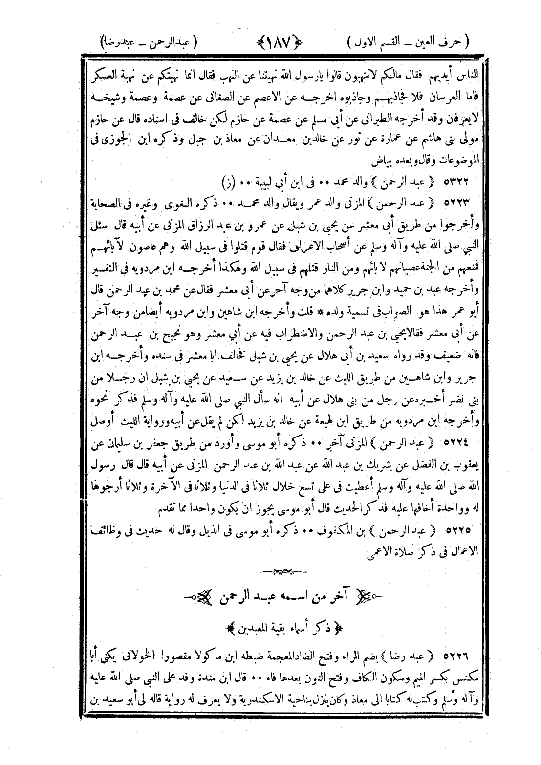 <187> الناس أيديهم فقال ما لكم لا تنتهبون قالوا يا رسول الله نهيتنا عن النهب فقال إنما نهيتكم عن نهبة العسكر فأما العرسان فلا فجاذبهم وجاذبوه أخرجه عن الأصم عن الصغاني عن عصمة وعصمة وشيخه لا يعرفان وقد أخرجه الطبراني عن أبي مسلم عن عصمة عن حازم لكن خالف في إسناده قال عن حازم مولى بني هاشم عن عمارة عن ثور عن خالد بن معدان عن معاذ بن جبل وذكره بن الجوزي في الموضوعات وقال عبد الرحمن والد محمد في بن أبي لبينة عبد الرحمن المزني والد عمر ويقال والد محمد ذكره البغوي وغيره في الصحابة وأخرجوا من طريق أبي معشر عن يحيى بن شبل عن عمرو بن عبد الرزاق المزني عن أبيه قال سئل النبي صلى الله عليه وسلم عن أصحاب الأعراف فقال قوم قتلوا في سبيل الله وهم عاصون لآبائهم فمنعهم من الجنة عصيانهم لآبائهم ومن النار قتلهم في سبيل الله وهكذا أخرجه بن مردويه في التفسير وأخرجه عبد بن حميد وابن جرير كلاهما من وجه آخر عن أبي معشر فقالا عن محمد بن عبد الرحمن قال أبو عمر هذا هو الصواب في تسمية ولده قلت وأخرجه بن شاهين وابن مردويه أيضا من وجه آخر عن أبي معشر فقالا يحيى بن عبد الرحمن والاضطراب فيه عن أبي معشر وهو نجيح بن عبد الرحمن فإنه ضعيف وقد رواه سعيد بن أبي هلال عن يحيى بن شبل فخالف أبا معشر في سنده وأخرجه بن جرير وابن شاهين من طريق الليث عن خالد بن يزيد عن سعيد عن يحيى بن شبل أن رجلا من بني نصر أخبره عن رجل من بني هلال عن أبيه أنه أخبره أنه سأل النبي صلى الله عليه وسلم فذكر نحوه وأخرجه بن مردويه من طريق بن لهيعة عن خالد بن يزيد لكن لم يقل عن أبيه ورواية الليث أوصل عبد الرحمن المزني آخر ذكره أبو موسى وأورد من طريق جعفر بن سليمان عن يعقوب بن الفضل عن شريك بن عبد الله عن عبد الله بن عبد الرحمن المزني عن أبيه قال قال رسول الله صلى الله عليه وسلم أعطيت في علي تسع خلال ثلاثا في الدنيا وثلاثا في الآخرة وثلاثا أرجوها له وواحدة أخافها عليه فذكر الحديث قال أبو موسى يجوز أن يكون واحدا مما تقدم عبد الرحمن المكفوف ذكره أبو موسى في الذيل وقال له حديث في وظائف الأعمال في ذكر صلاة الأعمى آخر من اسمه عبد الرحمن ذكر أسماء بقية المعبدين عبد رضا بضم الراء وفتح الضاد المعجمة ضبطه بن ماكولا مقصورا الخولاني يكنى أبا مكنف بكسر الميم وسكون الكاف وفتح النون بعدها فاء قال بن منده وفد على النبي صلى الله عليه وسلم وكتب له كتابا إلى معاذ وكان ينزل بناحية الإسكندرية ولا يعرف له رواية قاله لي أبو سعيد §