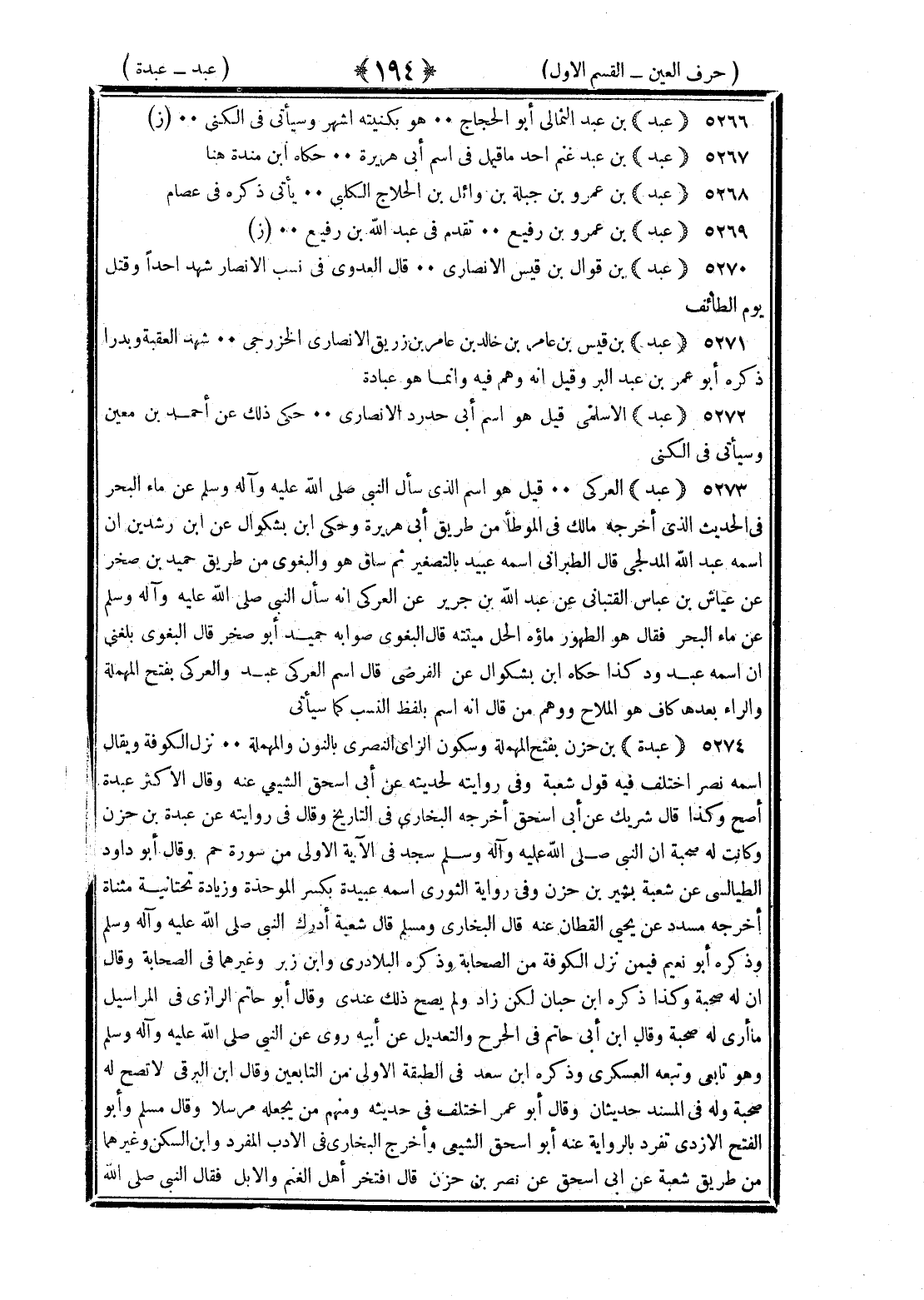 <194> عبد بن عبد الثمالي أبو الحجاج هو بكنيته أشهر وسيأتي في الكنى عبد بن عبد غنم أحد ما قيل في اسم أبي هريرة حكاه بن منده هنا عبد بن عمرو بن جبلة بن وائل بن الجلاح الكلبي يأتي ذكره في عصام عبد بن عمرو بن رفيع تقدم في عبد الله بن رفيع عبد بن قوال بن قيس الأنصاري قال العدوي في نسب الأنصار شهد أحدا وقتل يوم الطائف عبد بن قيس بن عامر بن خالد بن عامر بن زريق الأنصاري الخزرجي شهد العقبة وبدرا ذكره أبو عمر بن عبد البر وقيل إنه وهم فيه وإنما هو عبادة عبد الأسلمي قيل هو اسم أبي حدرد الأنصاري حكى ذلك عن أحمد بن معين وسيأتي في الكنى عبد العركي قيل هو اسم الذي سأل النبي صلى الله عليه وسلم عن ماء البحر في الحديث الذي أخرجه مالك في الموطأ من طريق أبي هريرة وحكى بن بشكوال عن بن رشدين أن اسمه عبد الله المدلجي قال الطبراني اسمه عبيد بالتصغير ثم ساق هو والبغوي من طريق حميد بن صخر عن عياش بن عباس القتباني عن عبد الله بن جرير عن العركي أنه سأل النبي صلى الله عليه وسلم عن ماء البحر فقال هو الطهور ماؤه الحل ميتته قال البغوي صوابه حميد أبو صخر وقال بلغني أن اسمه عبد ود وكذا حكاه بن بشكوال عن بن الفرضي قال اسم العركي عبد والعركي بفتح المهملة والراء بعدها كاف هو الملاح ووهم من قال إنه اسم بلفظ النسب كما سيأتي عبدة بن حزن بفتح المهملة وسكون الزاي النصري بالنون والمهملة نزل الكوفة ويقال اسمه نصر اختلف فيه قول شعبة وفي روايته لحديثه عن أبي إسحاق السبيعي عنه وقال الأكثر عبدة أصح وكذا قال شريك عن أبي إسحاق أخرجه البخاري في التاريخ وقال في روايته عن عبدة بن حزن وكانت له صحبة أن النبي صلى الله عليه وسلم سجد في الآية الأولى من صورة حم وقال أبو داود الطيالسي عن شعبة بشير بن حزن وفي رواية الثوري اسمه عبيدة بكسر الموحدة وزيادة تحتانية مثناة أخرجه مسدد عن يحيى القطان عنه قال البخاري ومسلم قال شعبة أدرك النبي صلى الله عليه وسلم وذكره أبو نعيم فيمن نزل الكوفة من الصحابة وذكره البلاذري وابن زبر وغيرهما في الصحابة وقال بن السكن يقال إنه له صحبة وكذا ذكره بن حبان لكن زاد ولم يصح ذلك عندي وقال أبو حاتم الرازي في المراسيل ما أرى له صحبة وقال بن أبي حاتم في الجرح والتعديل عن أبيه روى عن النبي صلى الله عليه وسلم وهو تابعي وتبعه العسكري وذكره بن سعد في الطبقة الأولى من التابعين وقال بن البرقي لا تصح له صحبة وله في المسند حديثان وقال أبو عمر اختلف في حديثه ومنهم من يجعله مرسلا وقال مسلم وأبو الفتح الأزدي تفرد بالرواية عنه أبو إسحاق السبيعي وأخرج البخاري في الأدب المفرد وابن السكن وغيرهما من طريق شعبة عن أبي إسحاق عن نصر بن حزن قال افتخر أهل الغنم والإبل فقال النبي صلى الله §