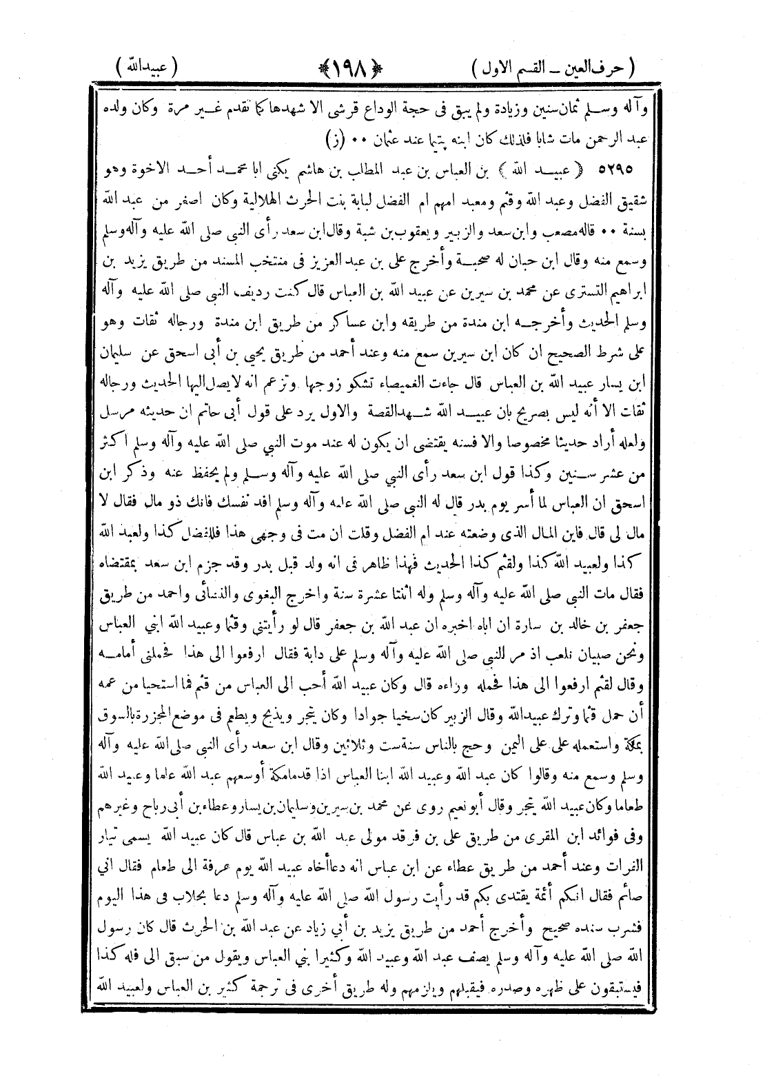 <198> وسلم ثمان سنين وزيادة ولم يبق في حجة الوداع قرشي إلا شهدها كما تقدم غير مرة وكأن ولده عبد الرحمن مات شابا فلذلك كان ابنه يتيما عند عثمان عبيد الله بن العباس بن عبد المطلب بن هاشم يكنى أبا محمد أحد الإخوة وهو شقيق الفضل وعبد الله وقثم ومعبد أمهم أم الفضل لبابة بنت الحارث الهلالية وكان أصغر من عبد الله بسنة قاله مصعب وابن سعد والزبير ويعقوب بن شيبة وقال بن سعد رأى النبي صلى الله عليه وسلم وسمع منه وقال بن حبان له صحبة وأخرج علي بن عبد العزيز في منتخب المسند من طريق يزيد بن إبراهيم التستري عن محمد بن سيرين عن عبيد الله بن العباس قال كنت رديف النبي صلى الله عليه وسلم الحديث وأخرجه بن منده من طريقه وابن عساكر من طريق بن منده ورجاله ثقات وهو على شرط الصحيح إن كان بن سيرين سمع منه وعند أحمد من طريق يحيى بن أبي إسحاق عن سليمان بن يسار عن عبيد الله بن العباس قال جاءت الغميصاء تشكو زوجها وتزعم أنه لا يصل إليها الحديث ورجاله ثقات إلا أنه ليس بصريح فإن عبيد الله شهد القصة والأول يرد على قول أبي حاتم إن حديثه مرسل ولعله أراد حديثا مخصوصا وإلا فسنه تقتضي أن يكون له عند موت النبي صلى الله عليه وسلم أكثر من عشر سنين وكذا قول بن سعد رأى النبي صلى الله عليه وسلم ولم يحفظ عنه وذكر بن إسحاق أن العباس لما أسر يوم بدر قال له النبي صلى الله عليه وسلم أفد نفسك فإنك ذو مال فقال لا مال لي قال فأين المال الذي وضعته عند أم الفضل وقلت إن مت في وجهي هذا فللفضل كذا ولعبد الله كذا ولعبيد الله كذا ولقثم كذا الحديث فهذا ظاهر في أنه ولد قبل بدر وقد جزم ابن سعد بمقتضاه فقال مات النبي صلى الله عليه وسلم وله اثنتا عشرة سنة وأخرج البغوي والنسائي وأحمد من طريق جعفر بن خالد بن سارة أن أباه أخبره أن عبد الله بن جعفر قال لو رأيتني وقثما وعبيد الله ابني العباس ونحن صبيان نلعب إذ مر النبي صلى الله عليه وسلم على دابة فقال ارفعوا إلى هذا فحملني أمامه وقال لقثم ارفعوا إلى هذا فحمله وراءه قال وكان عبيد الله أحب إلى العباس من قثم فما استحيا من عمه أن حمل قثما وترك عبيد الله وقال الزبير كان سخيا جوادا وكان ينحر ويذبح ويطعم في موضع المجزرة بالسوق بمكة واستعمله علي على اليمن وحج بالناس سنة ست وثلاثين وقال بن سعد رأى النبي صلى الله عليه وسلم وسمع منه وقالوا كان عبد الله وعبيد الله ابنا العباس إذا قدما مكة أوسعهم عبد الله علما وعبيد الله طعاما وكان عبيد الله يتجر وقال أبو نعيم روى عن محمد بن سيرين وسليمان بن يسار وعطاء بن أبي رباح وغيرهم وفي فوائد بن المقري من طريق علي بن فرقد مولى عبد الله بن عباس قال كان عبيد الله يسمى تيار الفرات وعند أحمد من طريق عطاء عن بن عباس أنه دعا أخاه عبيد الله يوم عرفة إلى طعام فقال إني صائم فقال إنكم أئمة يقتدى بكم قد رأيت رسول الله صلى الله عليه وسلم دعا بحلاب في هذا اليوم فشرب سنده صحيح وأخرج أحمد من طريق يزيد بن أبي زياد عن عبد الله بن الحارث قال كان رسول الله صلى الله عليه وسلم يصف عبد الله وعبيد الله وكثير ابني العباس ويقول من سبق إلي فله كذا فيستبقون على ظهره وصدره فيقبلهم ويلزمهم وله طريق أخرى في ترجمة كثير بن العباس ولعبيد الله §