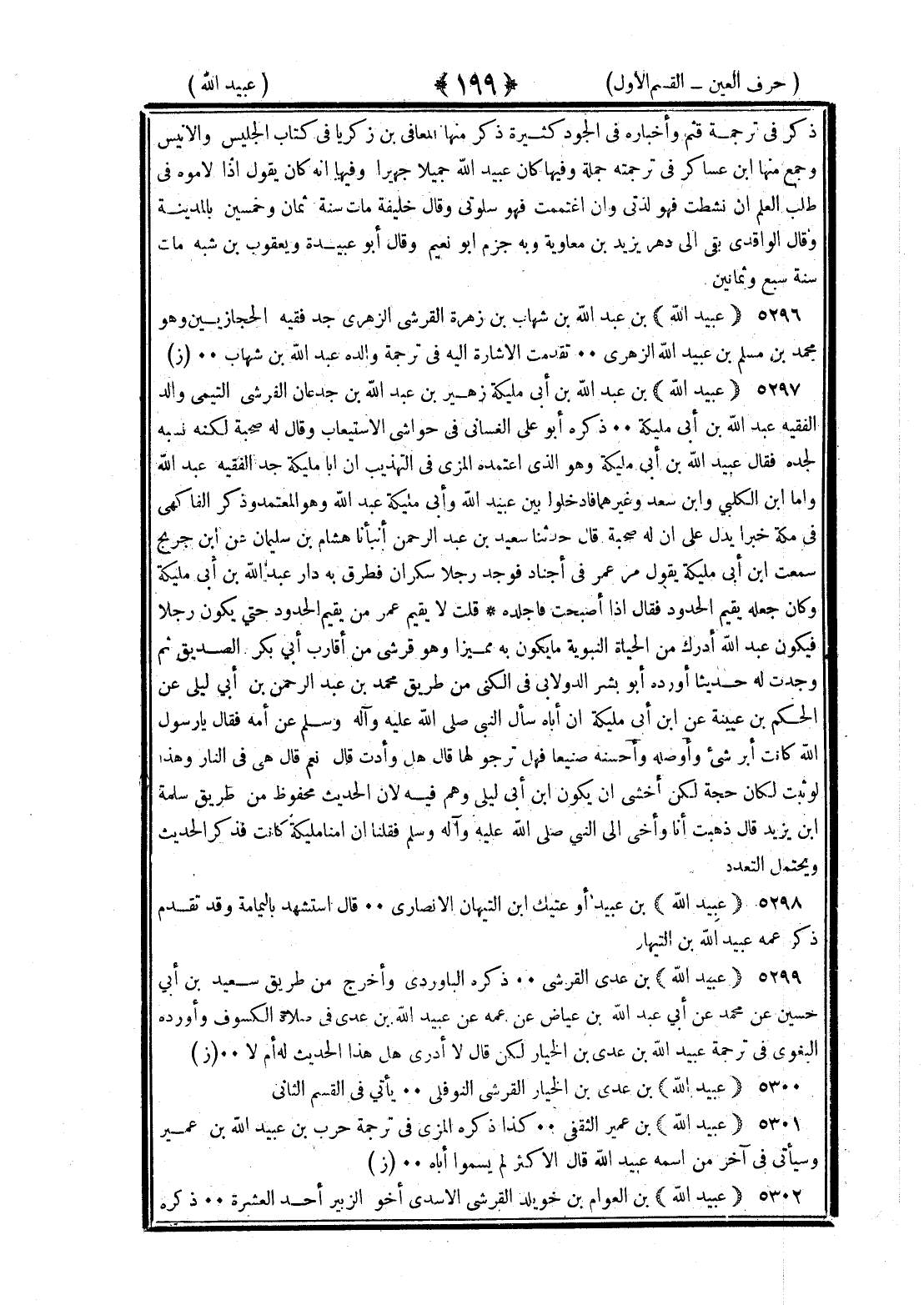 <199> ذكر في ترجمة قثم وأخباره في الجود كثيرة ذكر منها المعافى بن زكريا في كتاب الجليس والأنيس وجمع منها بن عساكر في ترجمته جملة وفيها كان عبيد الله جميلا جهيرا وفيها أنه كان يقول إذا لاموه في طلب العلم إن نشطت فهو لذتي وإن اغتممت فهو سلوتي وقال خليفة مات سنة ثمان وخمسين بالمدينة وقال الواقدي بقي إلى دهر يزيد بن معاوية وبه جزم أبو نعيم وقال أبو عبيدة ويعقوب بن شيبة مات سنة سبع وثمانين عبيد الله بن عبد الله بن شهاب بن زهرة القرشي الزهري جد فقيه الحجاز بن شهاب وهو محمد بن مسلم بن عبيد الله الزهري تقدمت الإشارة إليه في ترجمة والده عبد الله بن شهاب عبيد الله بن عبد بن أبي مليكة زهير بن عبد الله بن جدعان القرشي التيمي والد الفقيه عبد الله بن أبي مليكة ذكره أبو علي الغساني في حواشي الاستيعاب وقال له صحبة لكنه نسبه لجده فقال عبيد الله بن أبي مليكة وهو الذي اعتمده المزي في التهذيب أن أبا مليكة جد الفقيه عبد الله وأما بن الكلبي وابن سعد وغيرهما فأدخلوا بين عبيد الله وأبي مليكة عبد الله وهو المعتمد وذكر الفاكهي في كتاب مكة خبرا يدل على أن له صحبة قال حدثنا سعيد بن عبد الرحمن أنبأنا هشام بن سليمان عن بن جريج سمعت بن أبي مليكة يقول مر عمر في أجناد فوجد رجلا سكران فطرق به دار عبد الله بن أبي مليكة وكان جعله يقيم الحدود فقال إذا أصبحت فاجلده قلت لا يقيم عمر من يقيم الحدود حتى يكون رجلا فيكون عبد الله أدرك من الحياة النبوية ما يكون به مميزا وهو قرشي من أقارب أبي بكر الصديق ثم وجدت له حديثا أورده أبو بشر الدولابي في الكنى من طريق محمد بن عبد الرحمن بن أبي ليلى عن الحكم بن عيينة عن بن أبي مليكة أن أباه سأل النبي صلى الله عليه وسلم عن أمه فقال يا رسول الله كانت أبر شيء وأوصله وأحسنه صنيعا فهل ترجو لها قال هل وأدت قال نعم قال هي في النار وهذا لو ثبت لكان حجة لكن أخشى أن يكون بن أبي ليلى وهم فيه فإن الحديث محفوظ من طريق سلمة بن يزيد قال ذهبت أنا وأخي إلى النبي صلى الله عليه وسلم فقلنا إن أمنا مليكة كانت فذكر الحديث ويحتمل التعدد عبيد الله بن عبيد أو عتيك بن التيهان الأنصاري قال أبو عمر استشهد باليمامة وقد تقدم ذكر عمه عبيد الله بن التيهان عبيد الله بن عدي القرشي ذكره الباوردي وأخرج من طريق سعيد بن أبي حسين عن محمد عن أبي عبد الله بن عياض عن عمه عن عبيد الله بن عدي في صلاة الكسوف وأورده البغوي في ترجمة عبيد الله بن عدي بن الخيار لكن قال لا أدري هل هذا الحديث له أم لا عبيد الله بن عدي بن الخيار القرشي النوفلي يأتي في القسم الثاني عبيد الله بن عمير الثقفي كذا ذكره المزي في ترجمة حرب بن عبيد الله بن عمير وسيأتي في آخر من اسمه عبيد الله قال الأكثر لم يسموا أباه عبيد الله بن العوام بن خويلد القرشي الأسدي أخو الزبير أحد العشرة ذكره §