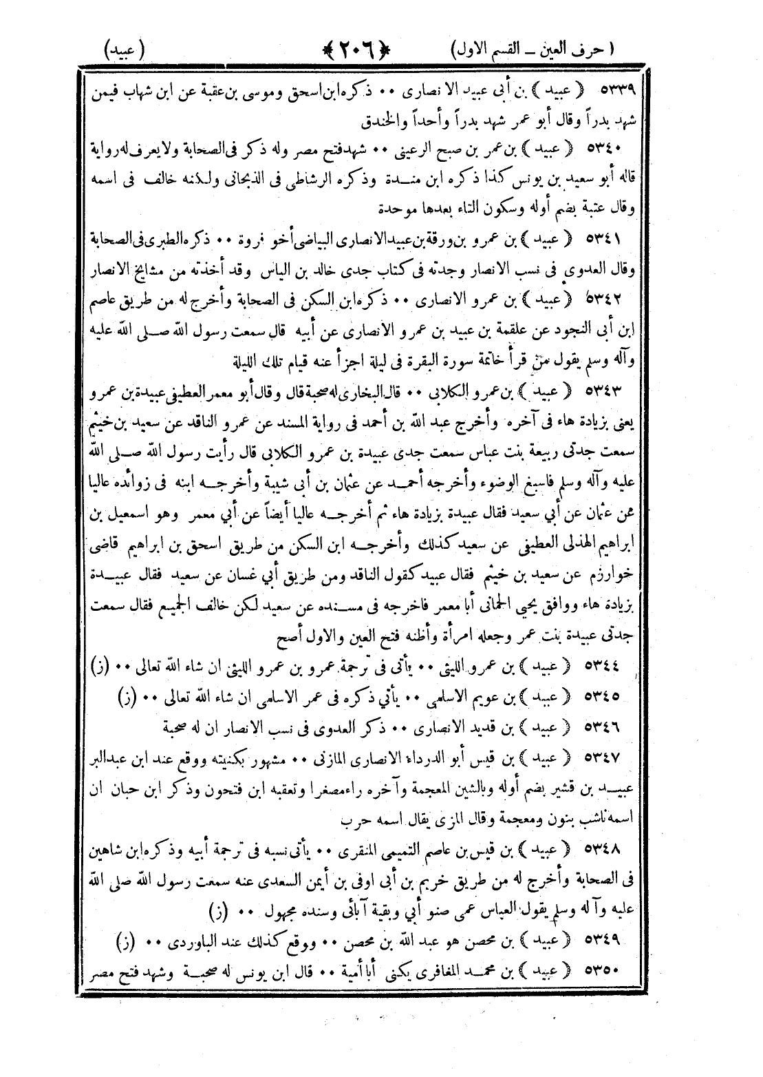 <206> عبيد بن أبي عبيد الأنصاري ذكره بن إسحاق وموسى بن عقبة عن بن شهاب فيمن شهد بدرا وقال أبو عمر شهد بدرا وأحدا والخندق عبيد بن عمر بن صبح الرعيني شهد فتح مصر وله ذكر في الصحابة ولا يعرف له رواية قاله أبو سعيد بن يونس كذا ذكره بن منده وذكره الرشاطي في الذبحاني ولكنه خالف في اسمه وقال عتبة بضم أوله وسكون التاء بعدها موحدة عبيد بن عمرو بن ودقة بن عبيد الأنصاري البياضي أخو فروة ذكره الطبري في الصحابة وقال العدوي في نسب الأنصار وجدته في كتاب جدي خالد بن الياس وقد أخذته من مشايخ الأنصار عبيد بن عمرو الأنصاري ذكره بن السكن في الصحابة وأخرج له من طريق عاصم بن أبي النجود عن علقمة بن عبيد بن عمرو الأنصاري عن أبيه قال سمعت رسول الله صلى الله عليه وسلم يقول من قرأ خاتمة سورة البقرة في ليلة أجزأت عنه قيام تلك الليلة عبيد بن عمرو الكلابي قال البخاري له صحبة قال وقال أبو معمر الغطيفي عبيدة بن عمرو يعني بزيادة هاء في آخره وأخرج عبد الله بن أحمد في رواية المسند عن عمرو الناقد عن سعيد بن خثيم سمعت جدتي ربيعة بنت عباس سمعت جدي عبيدة بن عمرو الكلابي قال رأيت رسول الله صلى الله عليه وسلم فأسبغ الوضوء وأخرجه أحمد بن عثمان بن أبي شيبة وأخرجه ابنه في زوائده عاليا عن عثمان عن سعيد فقال عبيدة بزيادة هاء ثم أخرجه عاليا أيضا عن أبي معمر وهو إسماعيل بن إبراهيم الهذلي الغطيفي عن سعيد كذلك وأخرجه بن السكن من طريق إسحاق بن إبراهيم قاضي خوارزم عن سعيد بن خثيم فقال عبيد كقول الناقد ومن طريق أبي غسان عن سعيد فقال عبيدة بزيادة هاء ووافق يحيى الحماني أبا معمر فأخرجه في مسنده عن سعيد لكن خالف الجميع فقال سمعت جدتي عبيدة بنت عمرو جعله امرأة وأظنه فتح العين والأول أصح عبيد بن عمرو الليثي يأتي في ترجمة عمرو بن عمرو الليثي إن شاء الله تعالى عبيد بن عويم الأسلمي يأتي ذكره في عمر الأسلمي إن شاء الله تعالى عبيد بن قديد الأنصاري ذكر العدوي في نسب الأنصار أن له صحبة عبيد بن قيس أبو الدرداء الأنصاري المازني مشهور بكنيته ووقع عند بن عبد البر عبيد بن قشير بضم أوله وبالشين المعجمة وآخره راء مصغرا وتعقبه بن فتحون وذكر بن حبان أن اسمه ناشب بنون ومعجمة وقال المزي يقال اسمه حرب عبيد بن قيس بن عاصم التميمي المنقري يأتي نسبه في ترجمة أبيه وذكره بن شاهين في الصحابة وأخرج له من طريق خريم بن أبي أوفى بن أيمن السعدي عنه سمعت رسول الله صلى الله عليه وسلم يقول العباس عمي صنو أبي وبقية آبائي وسنده مجهول عبيد بن محصن هو عبد الله بن محصن ووقع كذلك عند الباوردي عبيد بن محمد المعافري يكنى أبا أمية قال بن يونس له صحبة وشهد فتح مصر §