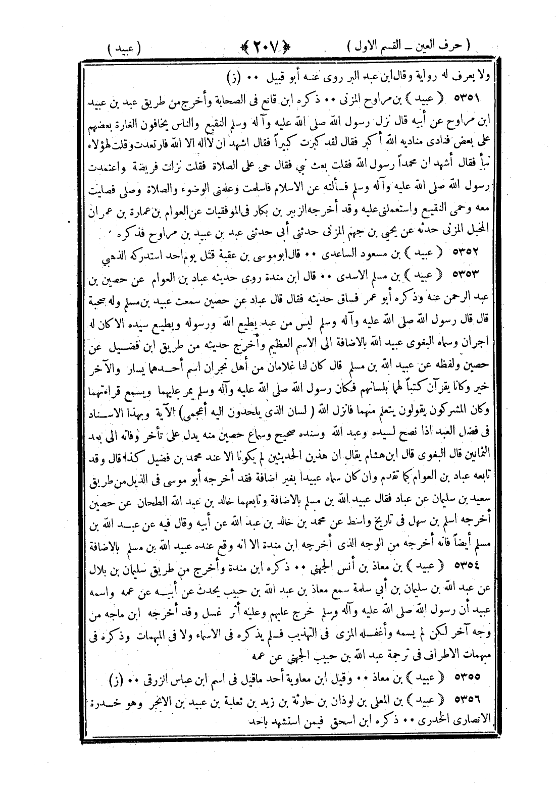 <207> ولا يعرف له رواية وقال بن عبد البر روى عنه أبو قبيل عبيد بن مراوح المزني ذكره بن قانع في الصحابة وأخرج من طريق عبد بن عبيد بن مراوح عن أبيه قال نزل رسول الله صلى الله عليه وسلم البقيع والناس يخافون الغارة بعضهم على بعض فنادى مناديه الله أكبر فقال لقد كبرت كبيرا فقال أشهد أن لا إله إلا الله فارتعدت وقلت لهؤلاء نبأ فقال أشهد أن محمدا رسول الله فقلت بعث نبي فقال حي على الصلاة فقلت نزلت فريضة واعتمدت رسول الله صلى الله عليه وسلم فسألته عن الإسلام فأسلمت وعلمني الوضوء والصلاة وصلى فصليت معه وحمى البقيع واستعملني عليه وقد أخرجه الزبير بن بكار في الموفقيات عن العوام بن عمار بن عمارة بن عمران المخبل المزني حدثه عن يحيى بن جهم المزني حدثني أبي حدثني عبد بن عبيد بن مراوح فذكره عبيد بن مسعود الساعدي قال موسى بن عقبة قتل يوم أحد استدركه الذهبي عبيد بن مسلم الأسدي قال بن منده روى حديثه عباد بن العوام عن حصين بن عبد الرحمن عنه وذكره أبو عمر فساق حديثه فقال قال عباد عن حصين سمعت عبيد بن مسلم وله صحبة قال قال رسول الله صلى الله عليه وسلم ليس من عبد يطيع الله ورسوله ويطيع سيده إلا كان له أجران وسماه البغوي عبيد الله بالإضافة إلى الاسم العظيم وأخرج حديثه من طريق بن فضيل عن حصين ولفظه عن عبيد الله بن مسلم قال كان لنا غلامان من أهل نجران اسم أحدهما يسار والآخر جبر وكانا يقرآن كتبا لهما بلسانهما فكان رسول الله صلى الله عليه وسلم يمر عليهما ويسمع قراءتهما وكان المشركون يقولون يتعلم منهما فأنزل الله لسان الذي يلحدون إليه أعجمي الآية وبهذا الإسناد في فضل العبد إذا نصح لسيده وعبد الله وسنده صحيح وسماع حصين منه يدل على تأخر وفاته إلى بعد الثمانين قال البغوي قال أبو هشام يقال إن هذين الحديثين لم يكونا إلا عند محمد بن فضيل كذا قال وقد تابعه عباد بن العوام كما تقدم وإن كان سماه عبيدا بغير إضافة فقد أخرجه أبو موسى في الذيل من طريق سعيد بن سليمان عن عباد فقال عبيد الله بن مسلم بالإضافة وتابعهما خالد بن عبد الله الطحان عن حصين أخرجه أسلم بن سهل في تاريخ واسط عن محمد بن خالد بن عبد الله عن أبيه وقال فيه عن عبيد الله بن مسلم أيضا فإنه أخرجه من الوجه الذي أخرجه بن منده إلا أنه وقع عنده عبيد الله بن مسلم بالإضافة عبيد بن معاذ بن أنس الجهني ذكره بن منده وأخرج من طريق سليمان بن بلال عن عبد الله بن سليمان بن أبي سلمة سمع معاذ بن عبد الله بن حبيب يحدث عن أبيه عن عمه واسمه عبيد أن رسول الله صلى الله عليه وسلم خرج عليهم وعليه أثر غسل وقد أخرجه بن ماجة من وجه آخر لكن لم يسمه وأغفله المزي في التهذيب فلم يذكره في الأسماء ولا في المبهمات وذكره في مبهمات الأطراف في ترجمة عبد الله بن حبيب الجهني عن عمه عبيد بن معاذ وقيل بن معاوية أحد ما قيل في اسم أبي عياش الزرقي عبيد بن المعلى بن لوذان بن حارثة بن زيد بن ثعلبة بن عبيد بن الأبجر وهو خدرة الأنصاري الخدري ذكره بن إسحاق فيمن استشهد بأحد §