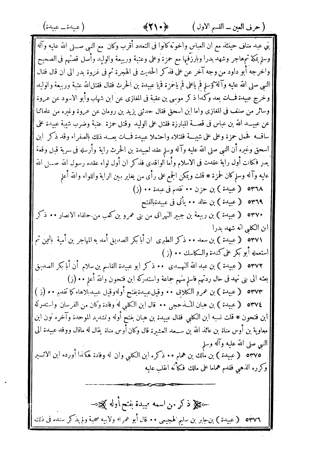 <210> بني عبد مناف حينئذ مع أن العباس وإخوته كانوا في التعدد أقرب وكان مع النبي صلى الله عليه وسلم بمكة ثم هاجر وشهد بدرا وبارز فيها حمزة وعلى عتبة وربيعة والوليد وأصل قصتهم في الصحيح وأخرجه أبو داود من وجه آخر عن علي فذكر الحديث في الهجرة ثم في غزوة بدر إلى أن قال فقال النبي صلى الله عليه وسلم قم يا علي قم يا حمزة قم يا عبيدة بن الحارث قال فقتل الله عتبة وربيعة والوليد وجرح عبيدة فمات بعد وكذا ذكره موسى بن عقبة في المغازي عن بن شهاب وأبو الأسود عن عروة وسائر من صنف في المغازي وأما بن إسحاق فقال حدثني يزيد بن رومان عن عروة وغيره من علمائنا عن عبيد الله بن عباس في قصة المبارزة فقتل علي الوليد وقتل حمزة عتبة وضرب شيبة عبيدة على ساقه فحمل حمزة وعلي على شيبة فقتلاه واحتملا عبيدة فمات بعد ذلك بالصفراء وقد ذكر بن إسحاق وغيره أن النبي صلى الله عليه وسلم عقد لعبيدة بن الحارث راية وأرسله في سرية قبل وقعة بدر فكانت أول راية عقدت في الإسلام وأما الواقدي فذكر أن أول لواء عقده رسول الله صلى الله عليه وسلم كان لحمزة قلت ويمكن الجمع على رأي من يغاير بين الراية واللواء والله أعلم عبيدة بن حزن تقدم في عبدة عبيدة بن خالد يأتي في عبيدة بالفتح عبيدة بن ربيعة بن جبير النهراني من بني عمرو بن كعب من حلفاء الأنصار ذكر بن الكلبي أنه شهد بدرا عبيد بن سعد ذكر الطبري أن أبا بكر الصديق أمد به المهاجر بن أمية باليمن ثم استعمله أبو بكر على كندة والسكاسك عبيدة بن عبد الله النهدي ذكر أبو عبيد القاسم بن سلام أن أبا بكر الصديق بعثه إلى بني نهد في حال ردتهم فأسلم منهم جماعة واستدركه بن فتحون والله أعلم عبيدة بن عمرو الكلابي وقيل عبيدة بفتح أوله وقيل عبيد بلا هاء كما تقدم عبيدة بن هبان المذحجي قال بن الكلبي له وفادة وكان من الفرسان واستدركه بن فتحون قلت نسبه بن الكلبي فقال عبيدة بن هبان بفتح أوله وتشديد الموحدة وآخره نون بن معاوية بن أوس مناة بن عائذ الله بن سعد العشيرة قال وكان أوس مناة يقال له ماقان ووفد عبيدة إلى النبي صلى الله عليه وسلم عبيدة بن مالك بن همام ذكره بن الكلبي وأن له وفادة هكذا أورده بن الأثير وكرره الذهبي فقدم هماما على مالك فكأنه انقلب عليه ذكر من اسمه عبيدة بفتح أوله عبيدة بن جابر بن سليم الهجيمي قال أبو عمر له ولأبيه صحبة ولم يذكر سنده في ذلك §