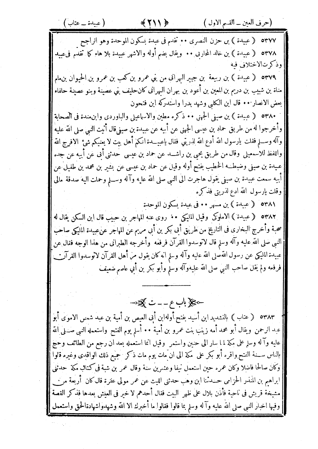 <211> عبيدة بن حزن النصري تقدم في عبدة بسكون الموحدة وهو الراجح عبيدة بن خالد المحاربي ويقال بضم أوله والأشهر عبيد بلا هاء كما تقدم في عبيد وذكرت الاختلاف فيه عبيدة بن ربيعة بن جبير البهراني من بني عمرو بن كعب بن عمرو بن الحيون بن تام مناة بن شبيب بن دريم بن القين بن أهود بن بهراء البهراني كان حليف بني غصينة وبنو غصينة حلفاء بعض الأنصار قال بن الكلبي وشهد بدرا واستدركه بن فتحون عبيدة بن صيفي الجهني ذكره مطين والإسماعيلي والباوردي وابن منده في الصحابة وأخرجوا له من طريق حماد بن عيسى الجهني عن أبيه عن عبيدة بن صيفي قال أتيت النبي صلى الله عليه وسلم فقلت يا رسول الله ادع الله لذريتي فقال يا عبيدة إنكم أهل البيت لا يعنيكم شيء إلا فرج الله واللفظ لإسماعيل وقال من طريق يحيى بن راشد عن حماد بن عيسى حدثني أبي عن أبيه عن جده عبيدة بن صيفي وضبطه الخطيب بفتح أوله وقيل عن حماد بن عيسى عن بشير بن محمد بن طفيل عن أبيه سمعت عبيدة بن صيفي يقول هاجرت إلى النبي صلى الله عليه وسلم وحملت إليه صدقة مالي وقلت يا رسول الله ادع لذريتي فذكره عبيدة بن مسهر في عبدة بسكون الموحدة عبيدة الأملوكي وقيل المليكي روى عنه المهاجر بن حبيب قال بن السكن يقال له صحبة وأخرج البخاري في التاريخ من طريق أبي بكر بن أبي مريم عن المهاجر عن عبيدة المليكي صاحب النبي صلى الله عليه وسلم قال لا توسدوا القرآن لم يرفعه وأخرجه الطبراني من هذا الوجه فقال عن عبيدة المليكي عن رسول الله صلى الله عليه وسلم أنه كان يقول يا أهل القرآن توسدوا القرآن فرفعه ولم يقل صاحب النبي صلى الله عليه وسلم وأبو بكر بن أبي مريم ضعيف العين بعدها التاء عتاب بالتشديد بن أسيد بفتح أوله بن أبي العيص بن أمية بن عبد شمس الأموي أبو عبد الرحمن ويقال أبو محمد أمه زينب بنت عمرو بن أمية أسلم يوم الفتح واستعمله النبي صلى الله عليه وسلم على مكة لما سار إلى حنين واستمر وقيل إنما استعمله بعد أن رجع من الطائف وحج بالناس سنة الفتح وأقره أبو بكر على مكة إلى أن مات يوم مات ذكر جميع ذلك الواقدي وغيره قالوا وكان صالحا فاضلا وكان عمره حين استعمل نيفا وعشرين سنة وقال عمر بن شبة في كتاب مكة حدثني إبراهيم بن المنذر الحزامي حدثنا بن وهب حدثني الليث عن عمرو مولى عفرة قال كان أربعة من مشيخة قريش في ناحية فأذن بلال على ظهر البيت فقال أحدهم لا خير في العيش بعدها فذكر القصة وفيها إخبار النبي صلى الله عليه وسلم بما قالوا فقالوا ما أخبرك إلا الله وشهدوا شهادة الحق واستعمل §