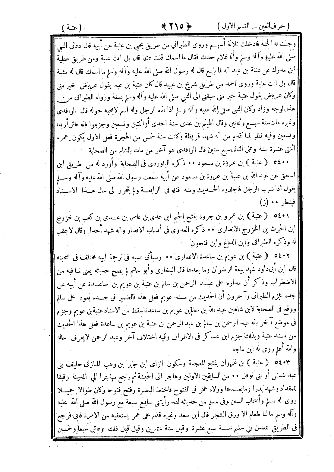 <215> وجبت له الجنة فأدخلت ثلاثة أسهم وروى الطبراني من طريق يحيى بن عتبة عن أبيه قال دعاني النبي صلى الله عليه وسلم وأنا غلام حدث فقال ما اسمك قلت عتلة قال بل أنت عتبة ومن طريق عطية بن مدرك عن عتبة بن عبد أنه لما بايع قال له رسول الله صلى الله عليه وسلم ما اسمك قال نشبة قال بل أنت عتبة وروى أحمد من طريق شريح بن عبيد قال كان عتبة بن عبد يقول عرباض خير مني وكان عرباض يقول عتبة خير مني سبقني إلى النبي صلى الله عليه وسلم بسنة ورواه الطبراني من هذا الوجه وزاد وكان النبي صلى الله عليه وسلم إذا أتاه الرجل وله اسم لا يحبه حوله قال الواقدي وغيره مات سنة سبع وثمانين وقال الهيثم بن عدي سنة إحدى أو اثنتين وسبعين وجزموا بأنه عاش أربعا وتسعين وفيه نظر لما تقدم من أنه شهد قريظة وكانت سنة خمس من الهجرة فعلى الأول يكون عمره فيها اثنتي عشرة سنة وعلى الثاني سبع سنين قال الواقدي هو آخر من مات بالشام من الصحابة عتبة بن عروة بن مسعود ذكره الباوردي في الصحابة وأورد له من طريق بن إسحاق عن عبد الله بن عتبة بن عروة بن مسعود عن أبيه سمعت رسول الله صلى الله عليه وسلم يقول إذا شرب الرجل فاجلدوه الحديث ومنه قتله في الرابعة ولم يتحرر لي حال هذا الإسناد فينظر عتبة بن عمرو بن جروة بفتح الجيم بن عدي بن عامر بن عدي بن كعب بن خزرج بن الحارث بن الخزرج الأنصاري ذكره العدوي في أنساب الأنصار وأنه شهد أحدا وقال لا عقب له وذكره الطبراني وابن الدباغ وابن فتحون عتبة بن عويم بن ساعدة الأنصاري وسيأتي نسبه في ترجمة أبيه مختلف في صحبته قال بن أبي داود شهد بيعة الرضوان وما بعدها قال البخاري وأبو حاتم لم يصح حديثه يعني لما فيه من الاضطراب وذكر أن مداره على عبد الرحمن بن سالم بن عتبة بن عويم بن ساعدة عن أبيه عن جده فجزم الطبراني وآخرون أن الحديث من مسند عويم فعلى هذا فالضمير في جده يعود على سالم ووقع في الصحابة لابن شاهين عبد الله بن سالم بن عويم بن ساعدة أسقط من الإسناد عتبة بن عويم وجزم في موضع آخر بأنه عبد الرحمن بن سالم بن عبد الرحمن بن عتبة بن عويم بن ساعدة فعلى هذا الحديث من مسند عتبة وبذلك جزم بن عساكر في الأطراف وفيه اختلاف آخر وعبد الرحمن لا يعرف حاله والله أعلم روى له بن ماجة عتبة بن غزوان بفتح المعجمة وسكون الزاي بن جابر بن وهب المازني حليف بني عبد شمس أو بني نوفل من السابقين الأولين وهاجر إلى الحبشة ثم رجع مهاجرا إلى المدينة رفيقا للمقداد وشهد بدرا وما بعدها وولاه عمر في الفتوح فاختط البصرة وفتح فتوحا وكان طويلا جميلا روى له مسلم وأصحاب السنن وفي مسلم من حديثه لقد رأيتني سابع سبعة مع رسول الله صلى الله عليه وسلم ما لنا طعام إلا ورق الشجر قال بن سعد وغيره قدم على عمر يستعفيه من الإمرة فأبى فرجع في الطريق بمعدن بني سليم سنة سبع عشرة وقيل سنة عشرين وقيل قبل ذلك وعاش سبعا وخمسين §