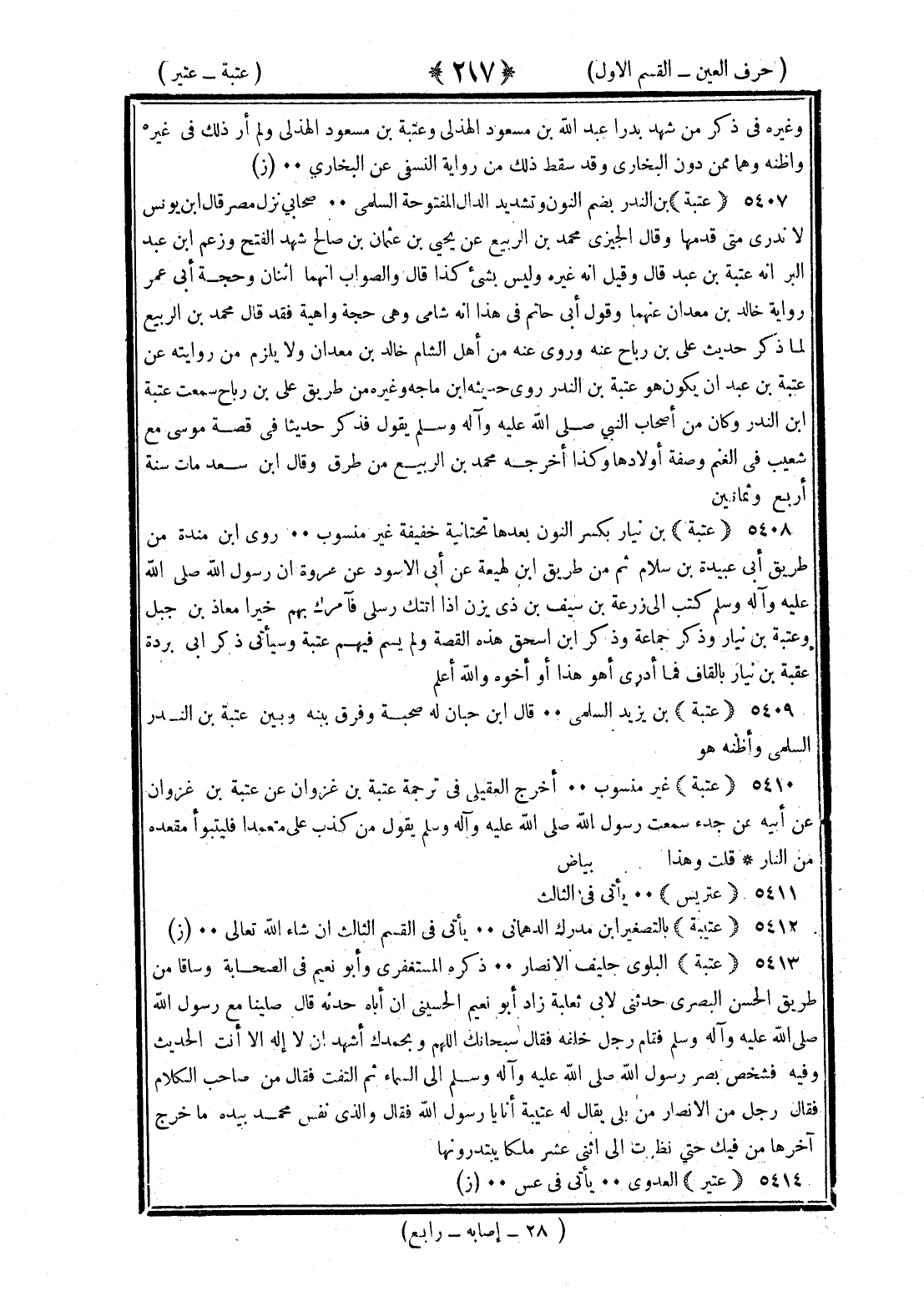 <217> وغيره في ذكر من شهد بدرا عبد الله بن مسعود الهذلي أخو عتبة بن مسعود الهذلي ولم أر ذلك في غيره وأظنه وهما ممن دون البخاري وقد سقط ذلك من رواية النسفي عن البخاري عتبة بن الندر بضم النون وتشديد الدال المفتوحة السلمي صحابي نزل مصر قال بن يونس لا يدري متى قدمها وقال الجيزي محمد بن الربيع عن يحيى بن عثمان بن صالح شهد الفتح وزعم بن عبد البر أنه عتبة بن عبد قال وقيل إنه غيره وليس بشيء كذا قال والصواب أنهما اثنان وحجة أبي عمر رواية خالد بن معدان عنهما وقول أبي حاتم في هذا إنه شامي وهي حجة واهية فقد قال محمد بن الربيع لما ذكر حديث علي بن رباح عنه وروى عنه من أهل الشام خالد بن معدان ولا يلزم من روايته عن عتبة بن عبد أن يكون هو عتبة بن الندر روى حديثه بن ماجة وغيره من طريق علي بن رباح سمعت عتبة بن الندر وكان من أصحاب النبي صلى الله عليه وسلم يقول فذكر حديثا في قصة موسى مع شعيب في الغنم وصفة أولادها وكذا أخرجه محمد بن الربيع من طرق وقال بن سعد مات سنة أربع وثمانين عتبة بن نيار بكسر النون بعدها تحتانية خفيفة غير منسوب روى بن منده من طريق أبي عبيدة بن سلام ثم من طريق بن لهيعة عن أبي الأسود عن عروة أن رسول الله صلى الله عليه وسلم كتب إلى زرعة بن سيف بن ذي يزن إذا أتتك رسلي فآمرك بهم خيرا معاذ بن جبل وعتبة بن نيار وذكر جماعة وذكر بن إسحاق هذه القصة ولم يسم فيهم عتبة وسيأتي ذكر أبي بردة عقبة بن نيار بالقاف فما أدري أهو هذا أو أخوه والله أعلم عتبة بن يزيد السلمي قال بن حبان له صحبة وفرق بينه وبين عتبة بن الندر السلمي وأظنه هو عتبة غير منسوب أخرج العقيلي في ترجمة عتبة بن غزوان عن عتبة بن غزوان عن أبيه عن جده سمعت رسول الله صلى الله عليه وسلم يقول من كذب علي متعمدا فليتبوأ مقعده من النار قلت وهذا عتريس يأتي في الثالث عتيبة بالتصغير بن مدرك الدهماني يأتي في القسم الثالث إن شاء الله تعالى عتيبة البلوي حليف الأنصار ذكره المستغفري وأبو نعيم في الصحابة وساقا من طريق الحسن البصري حدثني بن لأبي ثعلبة زاد أبو نعيم الخشني أن أباه حدثه قال صلينا مع رسول الله صلى الله عليه وسلم فقام رجل خلفه فقال سبحانك اللهم وبحمدك أشهد أن لا إله إلا أنت الحديث وفيه فشخص بصر رسول الله صلى الله عليه وسلم إلى السماء ثم التفت فقال من صاحب الكلام فقال رجل من الأنصار من بلي يقال له عتيبة أنا يا رسول الله فقال والذي نفس محمد بيده ما خرج آخرها من فيك حتى نظرت إلى اثني عشر ملكا يبتدرونها عتير العذري يأتي في عس §