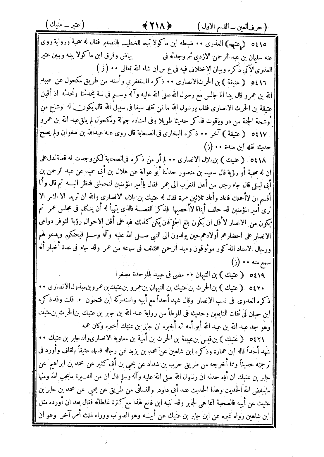 <218> عتير العذري ضبطه بن ماكولا تبعا للخطيب بالتصغير فقال له صحبة ورواية روى عنه سليمان بن عبد الرحمن الأزدي ثم وجدته في وفرق بن ماكولا بينه وبين عتير العذري الآتي ذكره وبيان الاختلاف فيه في العين والسين إن شاء الله تعالى عتيقة بن الحارث الأنصاري ذكره المستغفري وأسند من طريق مكحول عن عبيد الله بن عمرو قال بينما أنا جالس مع رسول الله صلى الله عليه وسلم في لمة يحدثنا ونحدثه إذ أقبل عتيقة بن الحارث الأنصاري فقال يا رسول الله ما لمن تقلد سيفا في سبيل الله قال يكون له وشاح من أوشحة الجنة من در وياقوت فذكر حديثا طويلا وفي إسناده جهالة ومكحول لم يلق عبد الله بن عمرو عتيقة آخر ذكره البخاري في الصحابة قال روى عنه عبد الله بن صفوان ولم يصح حديثه ذكره بن منده عتيك بن بلال الأنصاري ولم أر من ذكره في الصحابة لكن وجدت له قصة تدل على أن له صحبة أو رؤية قال سعيد بن منصور حدثنا أبو عوانة عن هلال بن أبي حميد عن عبد الرحمن بن أبي ليلى قال جاء رجل من أهل المغرب إلى عمر فقال يا أمير المؤمنين لتحملني فنظر إليه ثم قال وأنا أقسم ألا أحملك فأعاد وأعاد ثلاثين مرة فقال له عتيك بن بلال الأنصاري والله إن تريد إلا الشر ألا ترى أن أمير المؤمنين قد حلف أيمانا لا أحصيها فذكر القصة فالذي يتهيأ أن يتكلم في مجلس عمر ثم يكون من الأنصار ألا أقل أن يكون بلغ الحلم فإن يكن كذلك فله على أقل الأحوال رؤية لتوفر دواعي الأنصار على إحضارهم أولادهم حين يولدون إلى النبي صلى الله عليه وسلم فيحنكهم ويدعو لهم ورجال الإسناد المذكور موثوقون وعبد الرحمن مختلف في سماعه من عمر وقد جاء في عدة أخبار أنه سمع منه عتيك بن التيهان مضى في عبيد بالموحدة مصغرا عتيك بن الحارث بن عتيك بن النعمان بن عمرو بن عتيك بن عمرو بن مبذول الأنصاري ذكره العدوي في نسب الأنصار وقال شهد أحدا مع أبيه واستدركه بن فتحون قلت وقد ذكره بن حبان في ثقات التابعين وحديثه في الموطأ من رواية عبد الله بن جابر بن عتيك بن الحارث بن عتيك وهو جد عبد الله بن عبد الله أبو أمه أنه أخبره أن جابر بن عتيك أخبره وكان عمه عتيك بن قيس بن هيشة بن الحارث بن أمية بن معاوية الأنصاري والد جابر بن عتيك شهد أحدا قاله بن عمارة وذكره بن شاهين عن محمد بن يزيد عن رجاله فسماه عتيقا بالقاف وأورد في ترجمته حديثا ومما أخرجه من طريق حرب بن شداد عن يحيى بن أبي كثير عن محمد بن إبراهيم عن جابر بن عتيك أن أباه حدثه أن رسول الله صلى الله عليه وسلم قال إن من الغيرة ما يحب الله ومنها ما يبغض الله الحديث وهذا الحديث عند أبي داود والنسائي من طريق عن يحيى عن محمد بن جابر بن عتيك عن أبيه فالصحبة إنما هي لجابر وقد تنبه بن قانع لهذا مع كثرة غلطاته فقال بعد أن أورده مثل بن شاهين رواه غيره عن بن جابر بن عتيك عن أبيه وهو الصواب ووراء ذلك أمر آخر وهو أن §