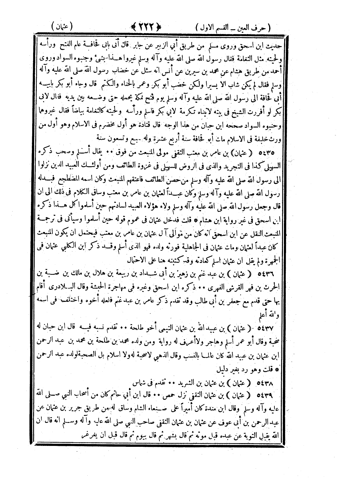 <222> حديث بن إسحاق وروى مسلم من طريق أبي الزبير عن جابر قال أتى بأبي قحافة عام الفتح ورأسه ولحيته مثل الثغامة فقال رسول الله صلى الله عليه وسلم غيروا هذا بشيء وجنبوه السواد وروى أحمد من طريق هشام عن محمد بن سيرين عن أنس أنه سئل عن خضاب رسول الله صلى الله عليه وسلم فقال لم يكن شاب إلا يسيرا ولكن خضب أبو بكر وعمر بالحناء والكتم قال وجاء أبو بكر بأبيه أبي قحافة إلى رسول الله صلى الله عليه وسلم يوم فتح مكة يحمله حتى وضعه بين يديه فقال لأبي بكر لو أقررت الشيخ في بيته لأتيناه تكرمة لأبي بكر فأسلم ورأسه ولحيته كالثغامة بياضا فقال غيروهما وجنبوه السواد صححه بن حبان من هذا الوجه قال قتادة هو أول مخضوب في الإسلام وهو أول من ورث خليفة في الإسلام مات أبو قحافة سنة أربع عشرة وله سبع وتسعون سنة عثمان بن عامر بن معتب الثقفي مولى المنبعث من فوق يقال أسلم وصحب ذكره السهيلي كذا في التجريد والذي في الروض للسهيلي في غزوة الطائف ومن أولئك العبيد الذين نزلوا إلى رسول الله صلى الله عليه وسلم من حصن الطائف فأعتقهم المنبعث وكان اسمه المضطجع فبدله رسول الله صلى الله عليه وسلم وكان عبدا لعثمان بن عامر بن معتب وساق الكلام في ذلك إلى أن قال وجعل رسول الله صلى الله عليه وسلم ولاء هؤلاء العبيد لسادتهم حين أسلموا كل هذا ذكره بن إسحاق في غير رواية بن هشام قلت فدخل عثمان في عموم قوله حين أسلموا وسيأتي في ترجمة المنبعث النقل عن بن إسحاق أنه كان من موالي آل عثمان بن عامر بن معتب فيحتمل أن يكون المنبعث كان عبدا لعثمان ومات عثمان في الجاهلية فورثه ولده فهو الذي أسلم وقد ذكر بن الكلبي عثمان في الجمهرة ولم يقل إن عثمان أسلم كعادته وقد كتبته هنا على الاحتمال عثمان بن عبد غنم بن زهير بن أبي شداد بن ربيعة بن هلال بن مالك بن ضبة بن الحارث بن فهر القرشي الفهري ذكره بن إسحاق وغيره في مهاجرة الحبشة وقال البلاذري أقام بها حتى قدم مع جعفر بن أبي طالب وقد تقدم ذكر عامر بن عبد غنم فلعله أخوه واختلف في اسمه والله أعلم عثمان بن عبيد الله بن عثمان التيمي أخو طلحة تقدم نسبه فيه قال بن حبان له صحبة وقال أبو عمر أسلم وهاجر ولا أعرف له رواية ومن ولده محمد بن طلحة بن محمد بن عبد الرحمن بن غنم بن عبد الله كان عالما بالنسب وقال الذهبي لا صحبة له ولا إسلام بل الصحبة لولده عبد الرحمن قلت وهو رد بغير دليل عثمان بن عثمان بن الشريد تقدم في شماس عثمان بن عثمان الثقفي نزل حمص قال بن أبي حاتم كان من أصحاب النبي صلى الله عليه وسلم وقال بن منده كان أميرا على صنعاء الشام وساق له من طريق حريز بن عثمان عن عبد الرحمن بن أبي عوف عن عثمان بن عثمان الثقفي صاحب النبي صلى الله عليه وسلم أنه قال إن الله يقبل التوبة عن عبده قبل موته ثم قال بشهر ثم قال بيوم ثم قال قبل أن يغرغر §