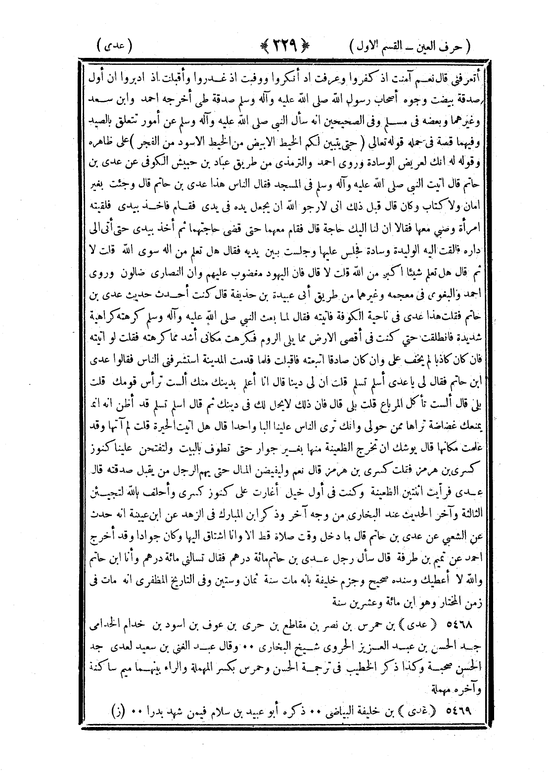 <229> أتعرفني قال نعم آمنت إذ كفروا وعرفت إذ أنكروا ووفيت إذ غدروا وأقبلت إذ أدبروا إن أول صدقة بيضت وجوه أصحاب رسول الله صلى الله عليه وسلم صدقة طي أخرجه أحمد وابن سعد وغيرهما وبعضه في مسلم وفي الصحيحين أنه سأل النبي صلى الله عليه وسلم عن أمور تتعلق بالصيد وفيهما قصة في حمله قوله تعالى حتى يتبين لكم الخيط الأبيض من الخيط الأسود من الفجر على ظاهره وقوله له إنك لعريض الوساد وروى أحمد والترمذي من طريق عباد بن حبيش الكوفي عن عدي بن حاتم قال أتيت النبي صلى الله عليه وسلم في المسجد فقال الناس هذا عدي بن حاتم قال وجئت بغير أمان ولا كتاب وكان قال قبل ذلك إني لأرجو الله أن يجعل يده في يدي فقام فأخذ بيدي فلقيته امرأة وصبي معها فقالا أنا لنا إليك حاجة فقام معهما حتى قضى حاجتهما ثم أخذ بيدي حتى أتى إلى داره فألقت إليه الوليدة وسادة فجلس عليها وجلست بين يديه فقال هل تعلم من إله سوى الله قلت لا ثم قال هل تعلم شيئا أكبر من الله قلت له قال فإن اليهود مغضوب عليهم وإن النصارى ضالون وروى أحمد والبغوي في معجمه وغيرهما من طريق أبي عبيدة بن حذيفة قال كنت أحدث حديث عدي بن حاتم فقلت هذا عدي في ناحية الكوفة فأتيته فقال لما بعث النبي صلى الله عليه وسلم كرهته كراهية شديدة فانطلقت حتى كنت في أقصى الأرض مما يلي الروم فكرهت مكاني أشد من كراهته فقلت لو أتيته فإن كان كاذبا لم يخف علي وإن كان صادقا أتبعته فأقبلت فلما قدمت المدينة استشرفني الناس فقالوا عدي بن حاتم فأتيته فقال لي يا عدي أسلم تسلم قلت إني لي دينا قال أنا أعلم بدينك منك ألست ترأس قومك قلت بلي قال ألست تأكل المرباع قلت بلى قال فإن ذلك لا يحل لك في دينك ثم قال أسلم تسلم قد أظن أنه إنما يمنعك غضاضة تراها ممن حولي وإنك ترى الناس علينا البا واحدا قال هل أتيت الحيرة قلت لم آتها وقد علمت مكانها قال يوشك أن تخرج الظعينة منها بغير جوار حتى تطوف بالبيت ولتفتحن علينا كنوز كسرى بن هرمز فقلت كسرى بن هرمز قال نعم وليفيضن المال حتى يهم الرجل من يقبل صدقته قال عدي فرأيت اثنتين الظعينة وكنت في أول خيل أغارت على كنوز كسرى وأحلف بالله لتجيئن الثالثة وآخر الحديث عند البخاري من وجه آخر وذكر بن المبارك في الزهد عن بن عيينة أنه حدث عن الشعبي عن عدي بن حاتم قال ما دخل وقت صلاة إلا وأنا أشتاق إليها وكان جوادا وقد أخرج أحمد عن تميم بن طرفة قال سأل رجل عدي بن أبي حاتم مائة درهم فقال تسألني مائة درهم وأنا بن حاتم والله لا أعطيك وسنده صحيح وجزم خليفة بأنه مات سنة ثمان وستين وفي التاريخ المظفري أنه مات في زمن المختار وهو بن مائة وعشرين سنة عدي بن حمرس بن نصر بن القاطع بن جري بن عوف بن سود بن جذام الجذامي جد الحسن بن عبد العزيز الجروي شيخ البخاري وقال عبد الغني بن سعيد لعدي جد الحسن صحبة وكذا ذكره الخطيب في ترجمة الحسن وحمرس بكسر المهملة والراء بينهما ميم ساكنة وآخره مهملة عدي بن خليفة البياضي ذكره أبو عبيد بن سلام فيمن شهد بدرا §