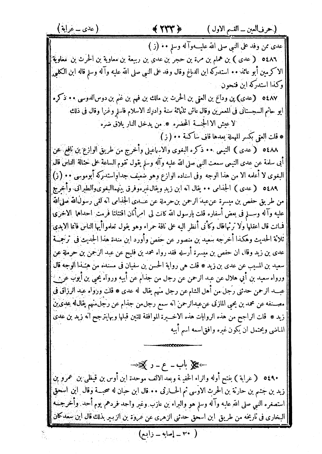 <233> عدي ممن وفد على النبي صلى الله عليه وسلم عدي بن همام بن مرة بن حجر بن عدي بن ربيعة بن معاوية بن الحارث بن معاوية الأكرمين أبو عائذ استدركه بن الدباغ وقال وفد على النبي صلى الله عليه وسلم قال بن الكلبي وكذا استدركه بن فتحون عدي بن وداع بن العقي بن الحارث بن مالك بن فهم بن غنم بن دوس الدوسي ذكره أبو حاتم السجستاني في المعمرين وقال عاش ثلاثمائة سنة وأدرك الإسلام فاسلم وغزا وقال في ذلك لا عيش إلا الجنة المخضره من يدخل النار ملاق ضره قلت العقي بكسر المهملة بعدها قاف ساكنة عدي التيمي ذكره البغوي والإسماعيلي وأخرج من طريق الوازع بن نافع عن أبي سلمة عن عدي التيمي سمعت النبي صلى الله عليه وسلم يقول تقوم الساعة على حثالة الناس قال البغوي لا أعلمه إلا من هذا الوجه وفي إسناده الوازع وهو ضعيف جدا واستدركه أبو موسى عدي الجذامي يقال إنه بن زيد ويقال غيره وفرق بينهما البغوي والطبراني وأخرج من طريق حفص بن ميسرة عن عبد الرحمن بن حرملة عن عدي الجذامي أنه لقي رسول الله صلى الله عليه وسلم في بعض أسفاره قلت يا رسول الله كانت لي امرأتان اقتتلتا فرمت إحداهما الأخرى فماتت قال اعقلها ولا ترثها قال وكأني أنظر إليه على ناقة حمراء وهو يقول تعلموا أيها الناس فإنما الأيدي ثلاثة الحديث وهكذا أخرجه سعيد بن منصور عن حفص وأورد بن منده هذا الحديث في ترجمة عدي بن زيد وقال إن حفص بن ميسرة أرسله فقد رواه محمد بن فليح عن عبد الرحمن بن حرملة عن سعيد بن المسيب عن عدي بن زيد قلت هي رواية الحسن بن سفيان في مسنده من هذا الوجه قال ورواه سعيد بن أبي هلال عن عبد الرحمن عن رجل من جذام عن أبيه ورواه يحيى بن أيوب عن عبد الرحمن حدثني رجل من أهل الشام عن رجل منهم يقال له عدي قلت ورواه عبد الرزاق في مصنفه عن محمد بن يحيى المازني عن عبد الرحمن أنه سمع رجلا من جذام عن رجل منهم يقال له عدي بن زيد قلت الراجح من هذه الروايات هذه الأخيرة الموافقة لاللتين قبلها وبها يترجح أنه زيد بن عدي الماضي ويحتمل أن يكون غيره وافق اسمه أبيه العين بعدها الراء عرابة بفتح أوله والراء الخفيفة وبعد الألف موحدة بن أوس بن قيظي بن عمرو بن زيد بن جشم بن حارثة بن الحارث الأوسي ثم الحارثي قال بن حبان له صحبة وقال بن إسحاق استصغره النبي صلى الله عليه وسلم هو والبراء بن عازب وغير واحد فردهم يوم أحد وأخرجه البخاري في تاريخه من طريق بن إسحاق حدثني الزهري عن عروة بن الزبير بذلك قال بن سعد كان §