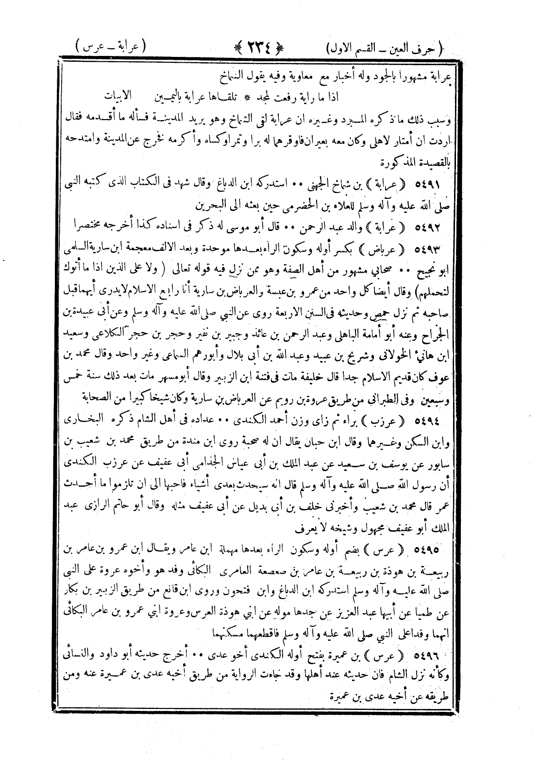 <234> عرابة مشهورا بالجود وله أخبار مع معاوية وفيه يقول الشماخ إذا ما راية رفعت لمجد تلقاها عرابة باليمين الأبيات وسبب ذلك بما ذكره المبرد وغيره أن عرابة لقي الشماخ وهو يريد المدينة فسأله ما أقدمه فقال أردت أن أمتار لأهلي وكان معه بعيران فأوقرهما برا وتمرا وكساه وأكرمه فخرج عن المدينة وامتدحه بالقصيدة المذكورة عرابة بن شماخ الجهني استدركه بن الدباغ وقال شهد في الكتاب الذي كتبه النبي صلى الله عليه وسلم للعلاء بن الحضرمي حين بعثه إلى البحرين عرابة والد عبد الرحمن قال أبو موسى له ذكر في إسناد كذا أخرجه مختصرا عرباض بكسر أوله وسكون الراء بعدها موحدة وبعد الألف معجمة بن سارية السلمي أبو نجيح صحابي مشهور من أهل الصفة هو ممن نزل فيه قوله تعالى ولا على الذين إذا ما أتوك لتحملهم وقال أيضا كل واحد من عمرو بن عبسة والعرباض بن سارية أنا رابع الإسلام لا يدري أيهما قبل صاحبه ثم نزل حمص وحديثه في السنن الأربعة روى عنه النبي صلى الله عليه وسلم وعن أبي عبيدة بن الجراح وعنه أبو أمامة الباهلي وعبد الرحمن بن عائذ وجبير بن نفير وحجر بن حجر الكلاعي وسعيد بن هانئ الخولاني وشريح بن عبيد وعبد الله بن أبي بلال وأبو رهم السماعي وغير واحد وقال محمد بن عوف كان قديم الإسلام جدا قال خليفة مات في فتنة بن الزبير وقال أبو مسهر مات بعد ذلك سنة خمس وسبعين وفي الطبراني من طريق عروة بن رويم عن العرباض بن سارية وكان شيخا كبيرا من الصحابة عرزب براء ثم زاي وزن أحمد الكندي عداده في أهل الشام ذكره البخاري وابن السكن وغيرهما وقال بن حبان يقال إن له صحبة وروى بن منده من طريق محمد بن شعيب بن سابور عن يوسف بن سعيد عن عبد الملك بن أبي العباس الجذامي أبي عفيف عن عرزب الكندي أن رسول الله صلى الله عليه وسلم قال إنه سيحدث بعدي أشياء فأحبها أن تلزموا ما أحدث عمر قال محمد بن شعيب وأخبرني خلف بن أبي بديل عن أبي عفيف مثله وقال أبو حاتم الرازي عبد الملك أبو عفيف مجهول وشيخه لا يعرف عرس بضم أوله وسكون الراء بعدها مهملة بن عامر ويقال بن عمرو بن عامر بن ربيعة بن هوذة بن ربيعة بن عامر بن صعصعة العامري البكائي وفد هو وأخوه عروة على النبي صلى الله عليه وسلم استدركه بن الدباغ وابن فتحون وروى بن قانع من طريق الزبير بن بكار عن ظمياء عن أبيها عبد العزيز عن جدها مولة عن ابني هوذة العرس وعروة ابني عمرو بن عامر البكائي أنهما وفدا على النبي صلى الله عليه وسلم فأقطعهما مسكنهما عرس بن عميرة بفتح أوله الكندي أخو عدي أخرج حديثه أبو داود والنسائي وكأنه نزل الشام فإن حديثه عند أهلها وقد جاءت الرواية من طريق أخيه عدي بن عميرة عنه ومن طريقه عن أخيه عدي بن عميرة §