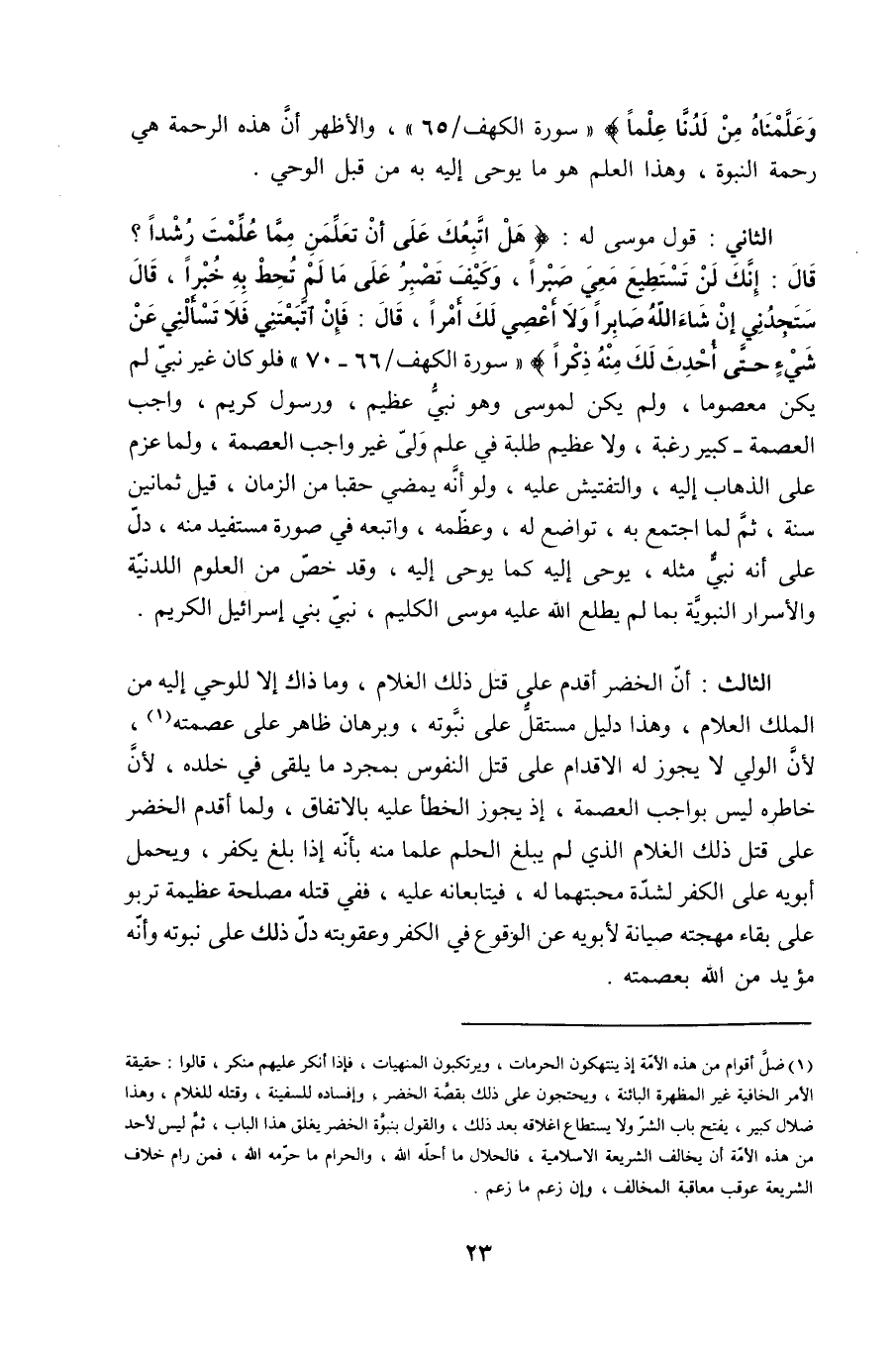(¬1) ضلَّ أقوام من هذه الأمة إذ ينتكهون الحرمات، ويرتكبون المنهيات، فإذا أنكر عليهم منكر، قالوا: حقيقة الأمر الخافية غير المظهرة البائنة، ويحتجون على ذلك بقصة الخضر، وإفساده للسفينة، وقتله للغلام، وهذا ضلال كبير، يفتح باب الشر ولا يستطاع إغلاقه بعد ذلك، والقول بنبوة الخضر يغلق هذا الباب، ثمَّ ليس لأحد من هذه الأمة أن يخالف الشريعة الإسلامية، فالحلال ما أحله الله، والحرام ما حرّمه الله، فمن رام خلاف الشريعة عوقب معاقبة المخالف، وإن زعم ما زعم. ومما ينبغي التنبيه إليه أن موسى صاحب شريعة لم يكن له أن يخالفها، ولذلك أنكر على الخضر قتله الغلام، لأنّه محرم في شريعته، ومن هنا اختار فراقه، والعودة إلى قومه.