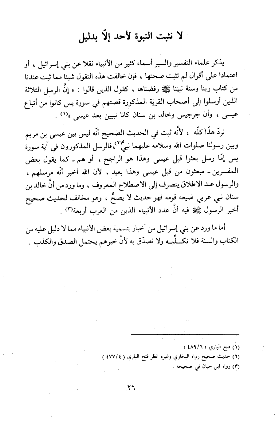 نردّ هذّا كله، لأنَّه ثبت في الحديث الصحيح أنّه ليس بين عيسى ابن مريم وبين رسولنا صلوات الله وسلامه عليهما نبيٌّ (¬2) .، فالرسل المذكورون في آية سورة يس إما رسل بعثوا قبل عيسى، وهذا هو الراجح، أو هم - كما يقول بعض المفسرين - مبعوثون من قبل عيسى وهذا بعيد، لأ، الله أخبر أنّه مرسلهم، والرسول عند الإطلاق ينصرف إلى الاصطلاح المعروف، وما ورد من أنَّ خالد بن سنان نبي عربي ضيعه قومه فهو حديث لا يصحُّ، وهو مخالف لحديث صحيح أخبر الرسول صلى الله عليه وسلم فيه أنَّ عدد الأنبياء الذين من العرب أربعة (¬3) .