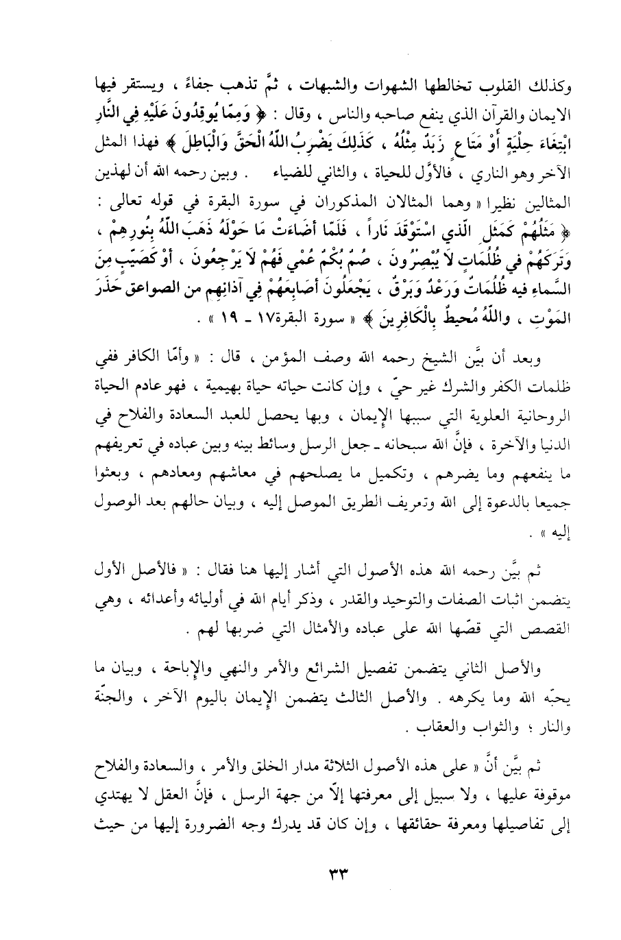 ثم بيّن رحمه الله هذه الأصول التي أشار إليها هنا فقال: " فالأصل الأول يتضمن إثبات الصفات والتوحيد والقدر، وذكر أيام الله في أوليائه وأعدائه، وهي القصص التي قصّها الله على عباده والأمثال التي ضربها لهم.