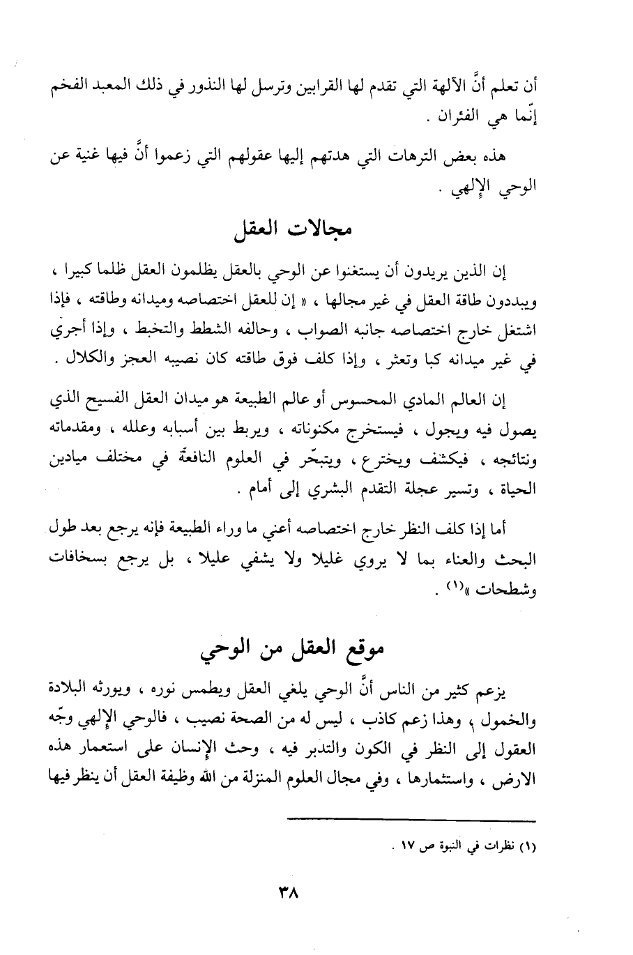 إن الذين يريدون أن يستغنوا عن الوحي بالعقل يظلمون العقل ظلماً كبيراً، ويبددون طاقة العقل في غير مجالها، " إن للعقل اختصاصه وميدانه وطاقته، فإذا اشتغل خارج اختصاصه جانبه الصواب، وحالفه الشطط والتخبط، وإذا أجري في غير ميدانه كبا وتعثر، وإذا كلف فوق طاقته كان نصيبه العجز والكلال.