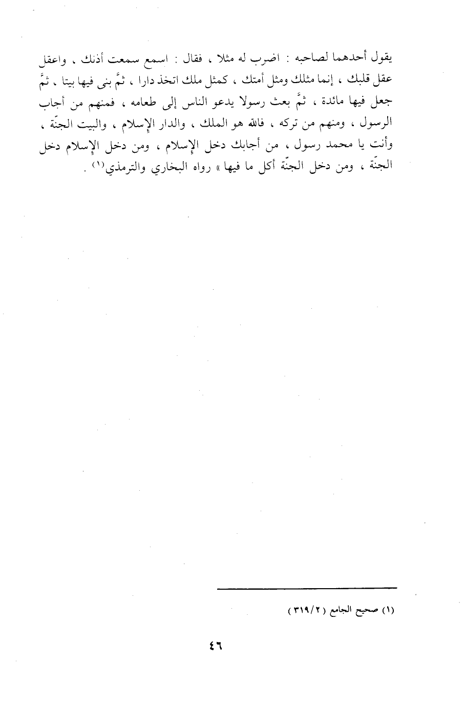فقالوا: إن لصاحبكم هذا مثلاً، قال: فاضربوا له مثلاً. فقال بعضهم: إنه نائمٌ، وقال بعضهم: إن العينَ نائمةٌ والقلب يقظان، فقالوا: مَثَلُهُ كمثل رجل بنى داراً وجَعَلَ فيها مأدُبة وبعث داعياً، فمن أجاب الداعيَ دخلَ الدارَ وأكلَ من المأدبة، ومن لم يجبِ الداعي لم يدخل الدار ولم يأكل من المأدبة. فقالوا: أولوها له يفقهها، فقال بعضهم: إنه نائمٌ، وقال بعضهم: إن العينَ نائمةٌ والقلبَ يقظانُ، فقالوا: فالدارُ الجنة والداعي محمدٌ صلى الله عليه وسلم، فمن أطاعَ محمداً صلى الله عليه وسلم فقد أطاعَ الله، ومن عصى محمداً صلى الله عليه وسلم فقد عصى الله، ومحمدٌ فرق بين الناس " (¬1) .