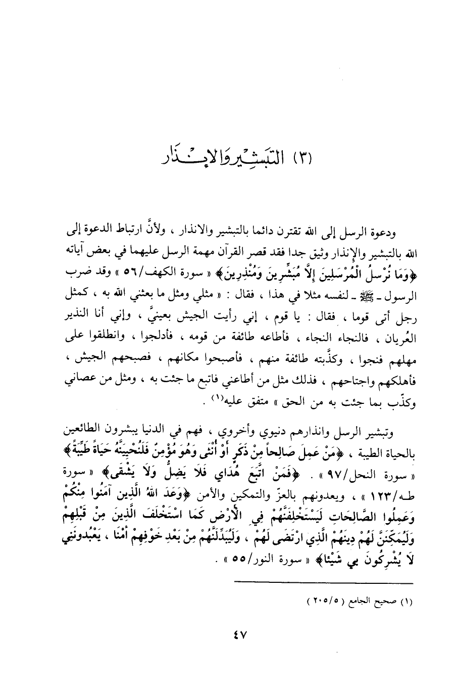 ودعوة الرسل إلى الله تقترن دائماً بالتبشير والإنذار، ولأنَّ ارتباط الدعوة إلى الله بالتبشير والإنذار وثيق جداً فقد قصر القرآن مهمة الرسل عليهما في بعض آياته (وما نرسل المرسلين إلاَّ مبشرين ومنذرين) [الكهف: 56] ، وقد ضرب الرسول - صلى الله عليه وسلم - لنفسه مثلاً في هذا، فقال: " إنما مثلي ومثل ما بعثني الله به، كمثل رجل أتى قوماً، فقال: يا قوم، إني رأيت الجيش بعينيَّ، وإني أنا النذير العُريان، فالنجاء، فأطاعه طائفة من قومه، فأدلجوا، فانطلقوا على مهلهم، فنجوا، وكذَّبته طائفة منهم، فأصبحوا مكانهم، فصبحهم الجيش، فأهلكهم واجتاحهم، فذلك مثل من أطاعني، فاتبع ما جئت به، ومثل من عصاني وكذّب بما جئت به من الحق " (¬1) .