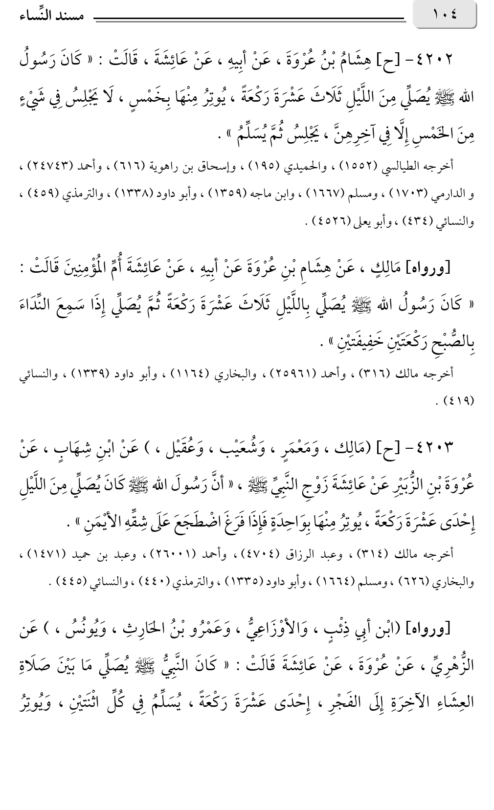 ٤٢٠٢ - [ح] هِشَامُ بْنُ عُرْوَةَ، عَنْ أبِيهِ، عَنْ عَائِشَةَ، قَالَتْ: «كَانَ رَسُولُ الله صلى الله عليه وسلم يُصَلِّي مِنَ اللَّيْلِ ثَلَاثَ عَشْرَةَ رَكْعَةً، يُوتِرُ مِنْهَا بِخَمْسٍ، لَا يَجْلِسُ فِي شَيْءٍ مِنَ الخَمْسِ إِلَّا فِي آخِرِهِنَّ، يَجْلِسُ ثُمَّ يُسَلِّمُ».