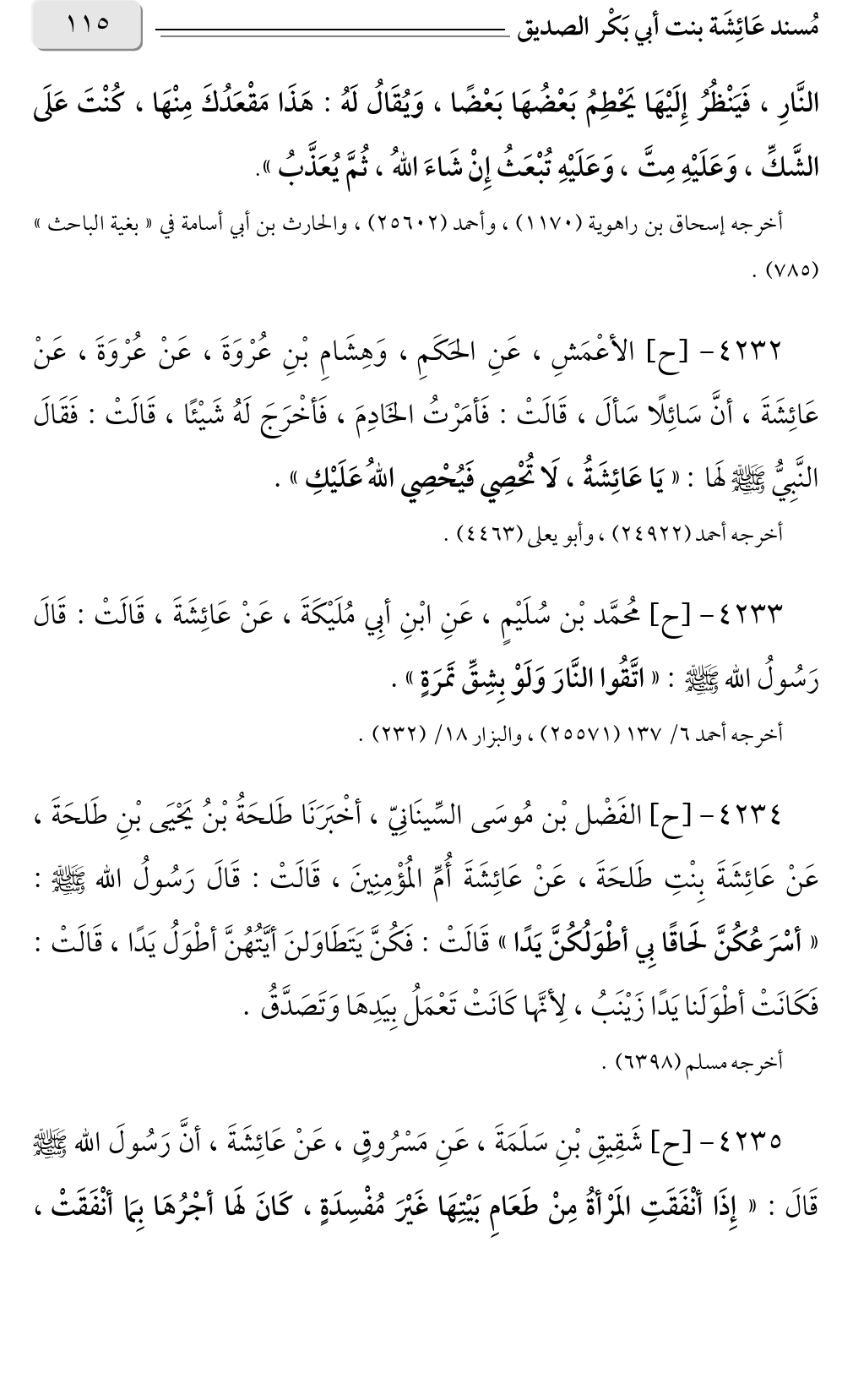 ٤٢٣٣ - [ح] مُحمَّد بْن سُلَيْمٍ، عَنِ ابْنِ أبِي مُلَيْكَةَ، عَنْ عَائِشَةَ، قَالَتْ: قَالَ رَسُولُ الله صلى الله عليه وسلم: «اتَّقُوا النَّارَ وَلَوْ بِشِقِّ تَمرَةٍ».