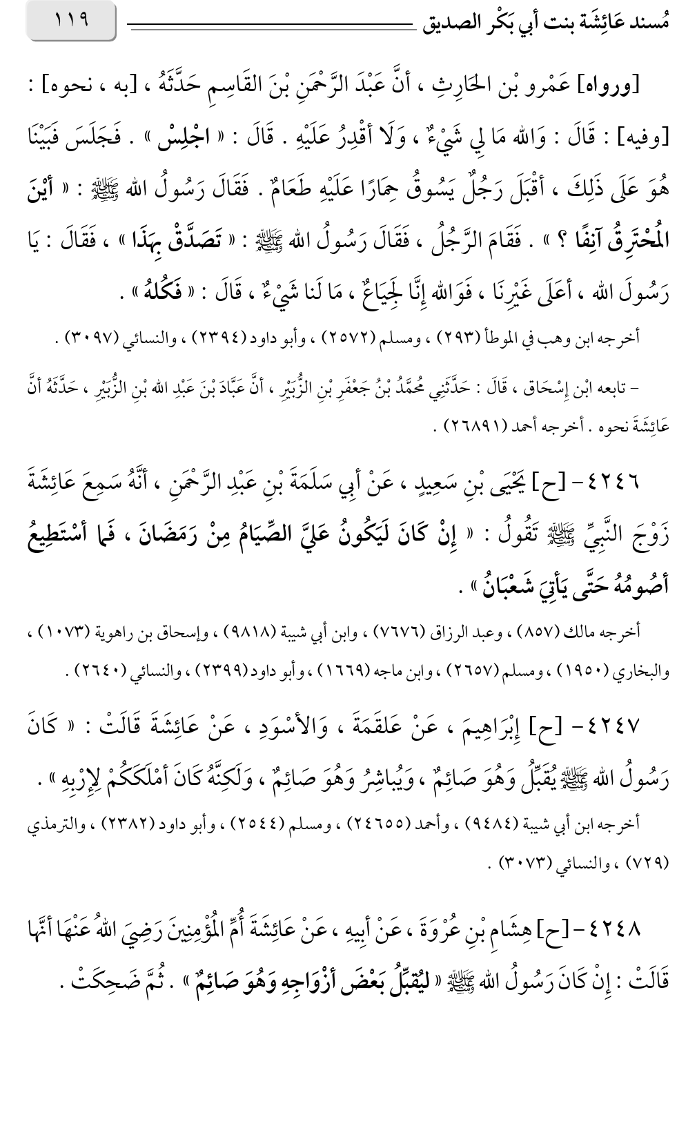 ٤٢٤٨ - [ح] هِشَامِ بْنِ عُرْوَةَ، عَنْ أبِيهِ، عَنْ عَائِشَةَ أُمِّ المُؤْمِنِينَ رَضِيَ اللهُ عَنْهَا أنَّها قَالَتْ: إِنْ كَانَ رَسُولُ الله صلى الله عليه وسلم «ليُقبِّلُ بَعْضَ أزْوَاجِهِ وَهُوَ صَائِمٌ» ثُمَّ ضَحِكَتْ.