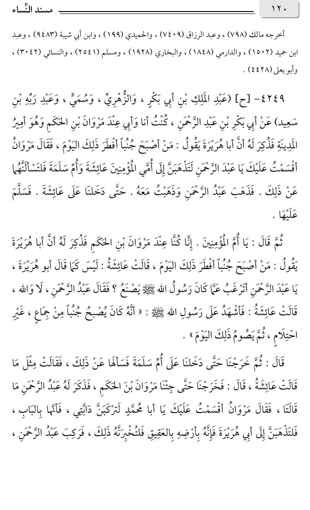 ٤٢٤٩ - [ح] (عَبْدِ المَلِكِ بْنِ أبِي بَكْرٍ، وَالزُّهْرِيِّ، وَسُمَيٍّ، وَعَبْدِ رَبِّهِ بْنِ سَعِيد) عَنْ أبِي بَكْرِ بْنِ عَبْدِ الرَّحْمَنِ، كُنْتُ أنا وَأبِي عِنْدَ مَرْوَانَ بْنِ الحَكَمِ وَهُوَ أمِيرُ المَدِينَةِ فَذُكِرَ لَهُ أنَّ أبا هُرَيْرَةَ يَقُولُ: مَنْ أصْبَحَ جُنُبًا أفْطَرَ ذَلِكَ اليَوْمَ، فَقَالَ مَرْوَانُ أقْسَمْتُ عَلَيْكَ يَا عَبْدَ الرَّحْمَنِ لَتَذْهَبَنَّ إِلَى أُمَّي المُؤْمِنِينَ عَائِشَةَ وَأُمِّ سَلَمَةَ فَلتَسْألَنَّهُما عَنْ ذَلِكَ. فَذَهَبَ عَبْدُ الرَّحْمَنِ وَذَهَبْتُ مَعَهُ. حَتَّى دَخَلنَا عَلَى عَائِشَةَ. فَسَلَّمَ عَلَيْهَا.