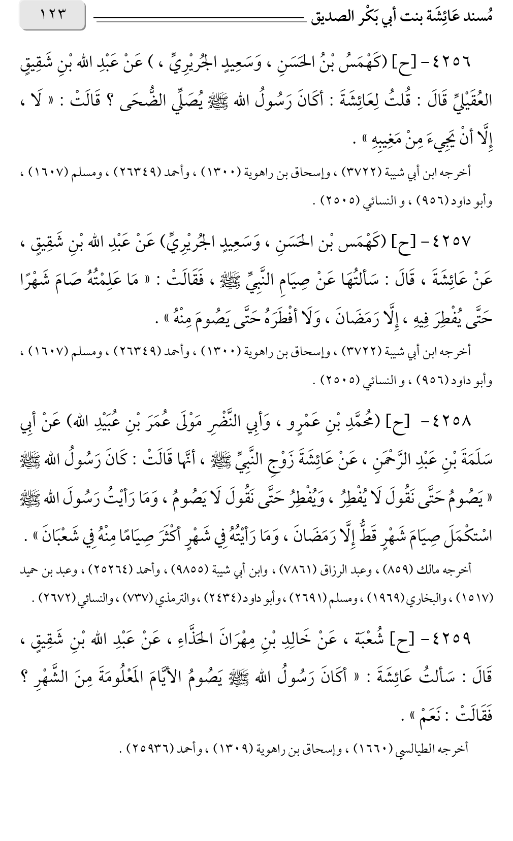 ٤٢٥٧ - [ح] (كَهْمَس بْن الحَسَنِ، وَسَعِيدٍ الجُريْرِيِّ) عَنْ عَبْدِ الله بْنِ شَقِيقٍ، عَنْ عَائِشَةَ، قَالَ: سَألتُهَا عَنْ صِيَامِ النَّبِيِّ صلى الله عليه وسلم، فَقَالَتْ: «مَا عَلِمْتُهُ صَامَ شَهْرًا حَتَّى يُفْطِرَ فِيهِ، إِلَّا رَمَضَانَ، وَلَا أفْطَرَهُ حَتَّى يَصُومَ مِنْهُ».