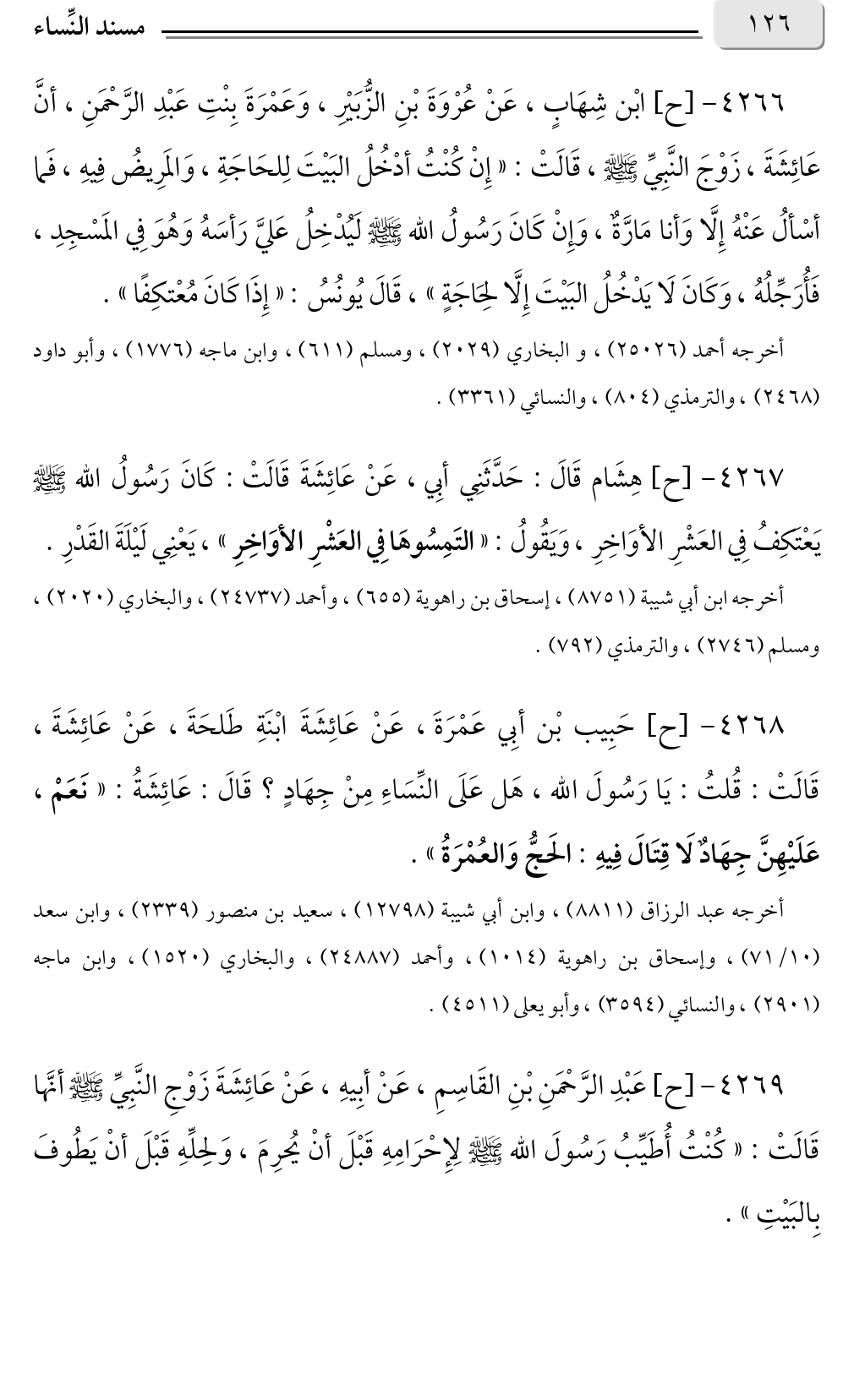 ٤٢٦٨ - [ح] حَبِيب بْن أبِي عَمْرَةَ، عَنْ عَائِشَةَ ابْنَةِ طَلحَةَ، عَنْ عَائِشَةَ، قَالَتْ: قُلتُ: يَا رَسُولَ الله، هَل عَلَى النِّسَاءِ مِنْ جِهَادٍ؟ قَالَ: عَائِشَةُ: «نَعَمْ، عَلَيْهِنَّ جِهَادٌ لَا قِتَالَ فِيهِ: الحَجُّ وَالعُمْرَةُ».