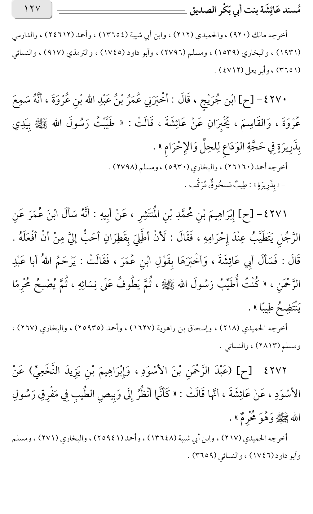 ٤٢٧٠ - [ح] ابْن جُرَيْجٍ، قَالَ: أخْبَرَنِي عُمَرُ بْنُ عَبْدِ الله بْنِ عُرْوَةَ، أنَّهُ سَمِعَ عُرْوَةَ، وَالقَاسِمَ، يُخْبِرَانِ عَنْ عَائِشَةَ، قَالَتْ: «طَيَّبْتُ رَسُولَ الله صلى الله عليه وسلم بِيَدِي بِذَرِيرَةٍ فِي حَجَّةِ الوَدَاعِ لِلحِلِّ وَالإِحْرَامِ».